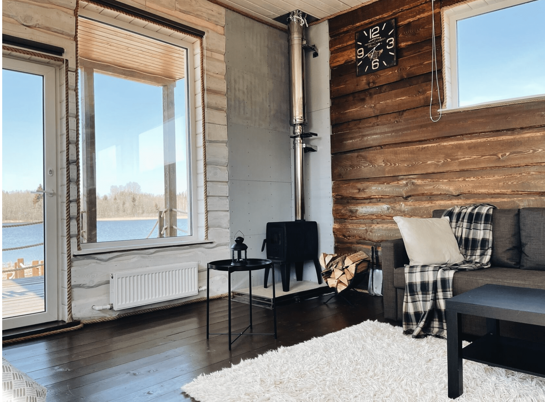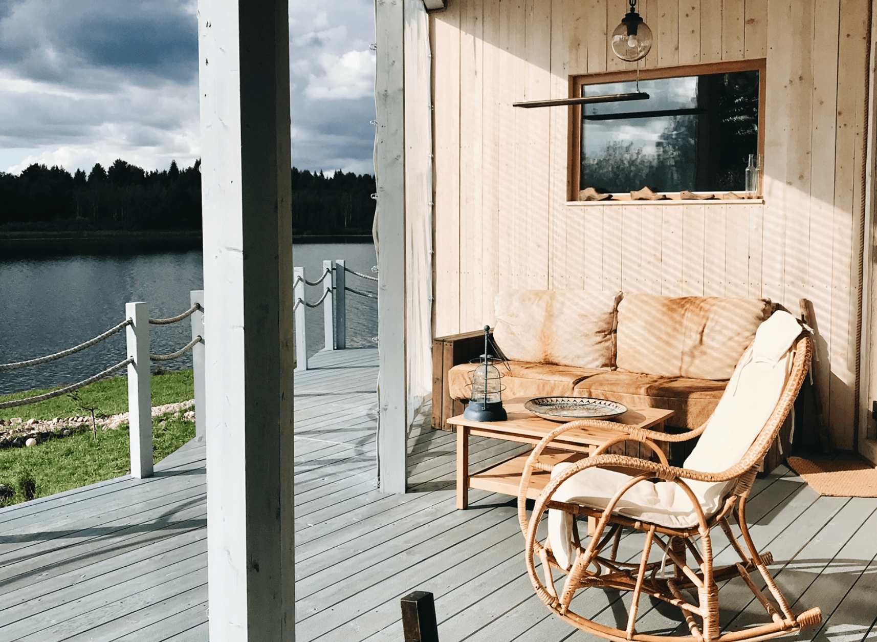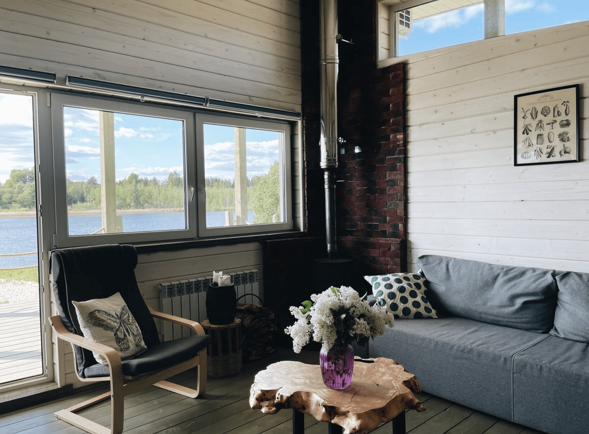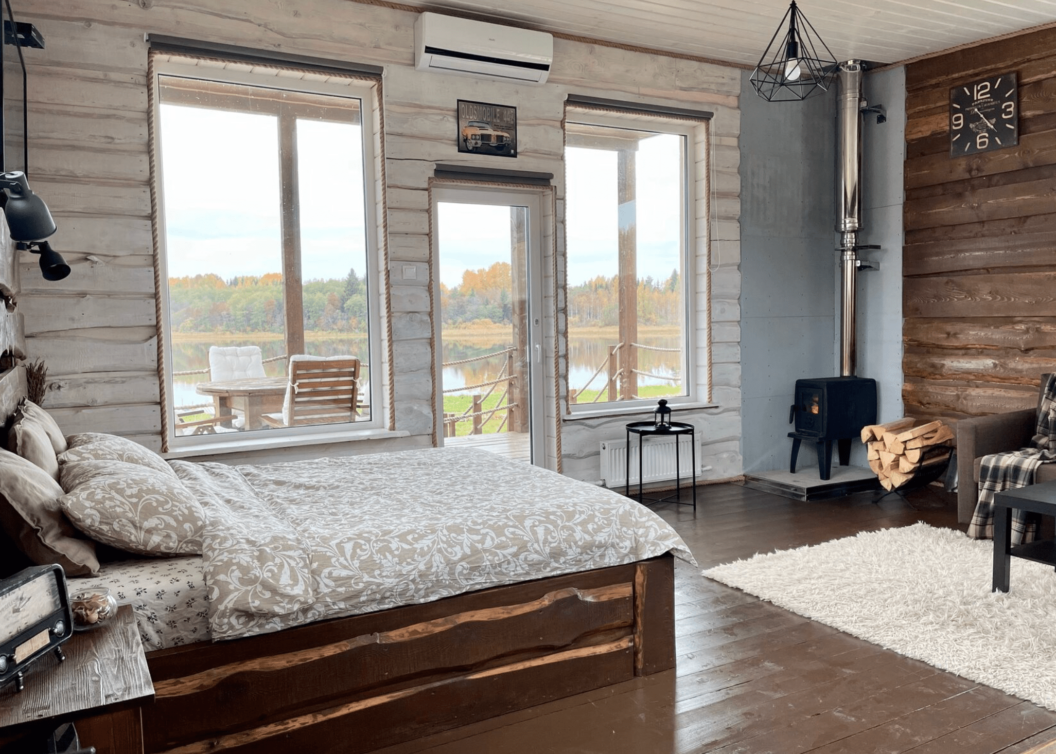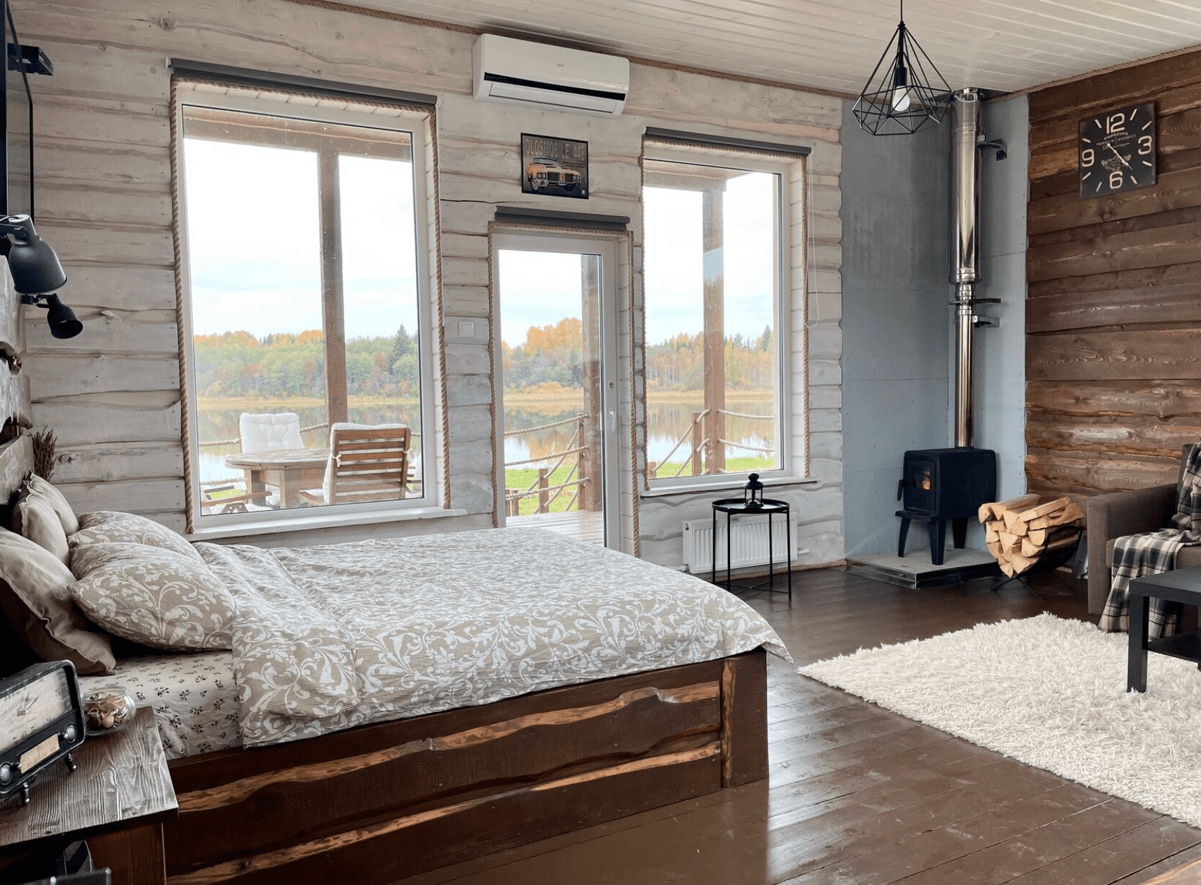 Уютный домик площадью 60м2 выполнен в формате студии. Панорамные окна с видом на озеро позволяют любоваться великолепными восходами и закатами, не вставая с кровати.