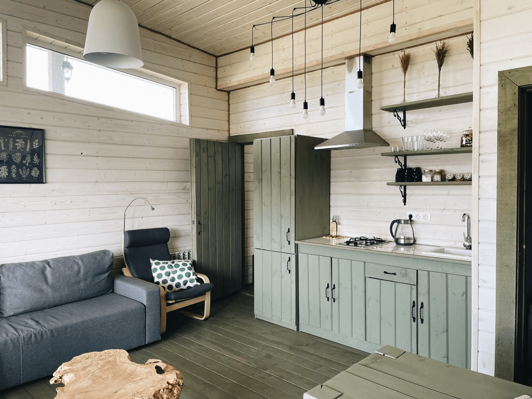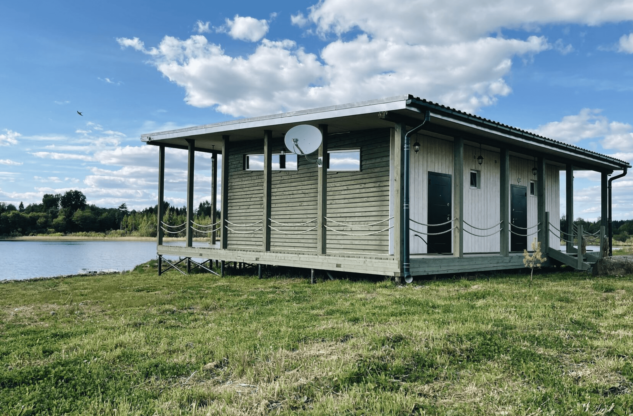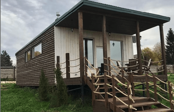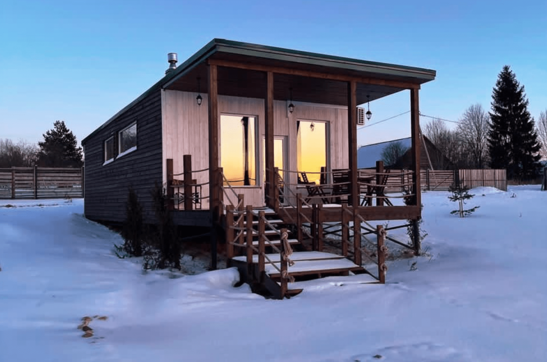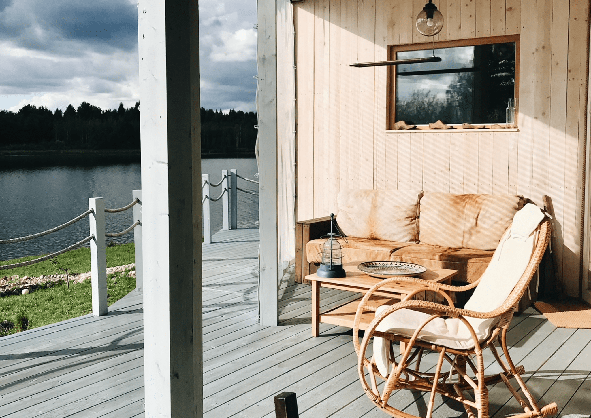 Уютный домик площадью 60м2 выполнен в формате студии. Панорамные окна с видом на озеро позволяют любоваться великолепными восходами и закатами, не вставая с кровати.