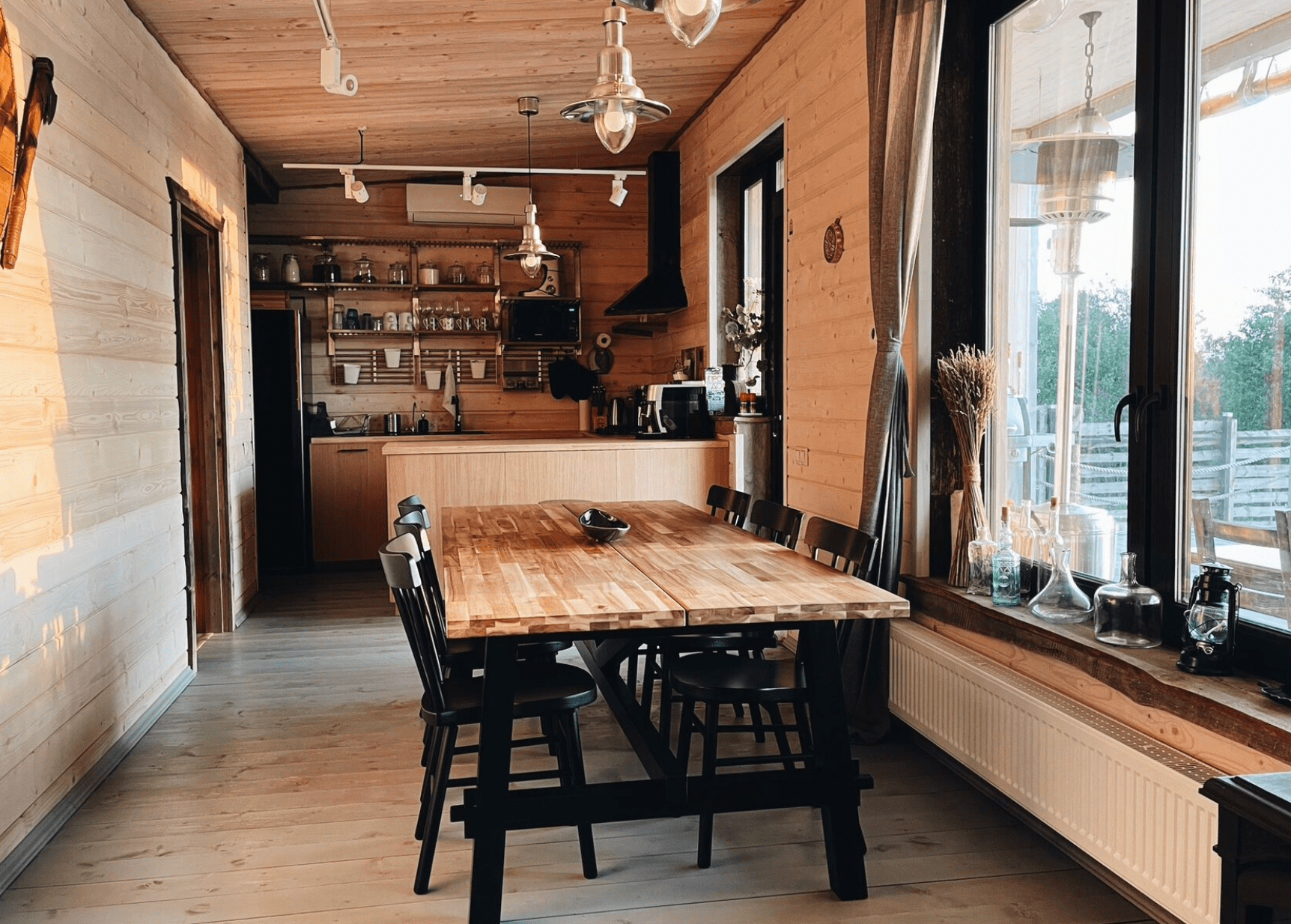 Просторная веранда с обеденным столом для трапезы на свежем воздухе.