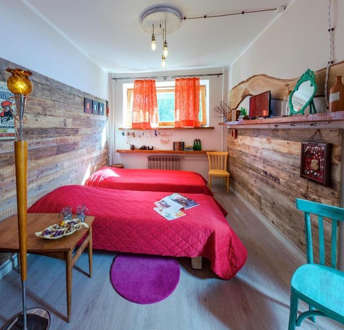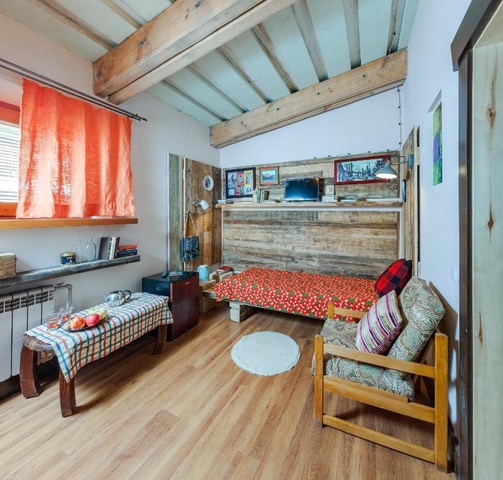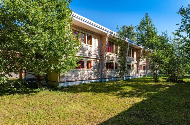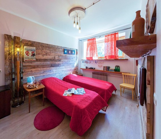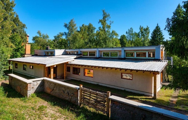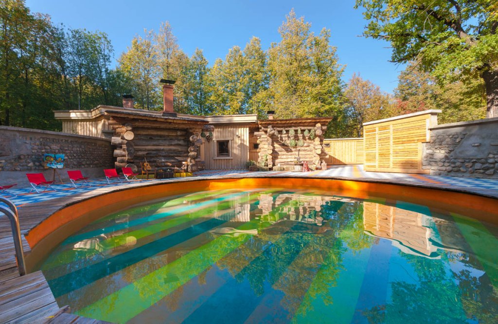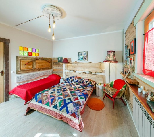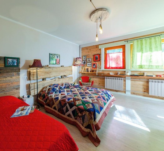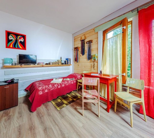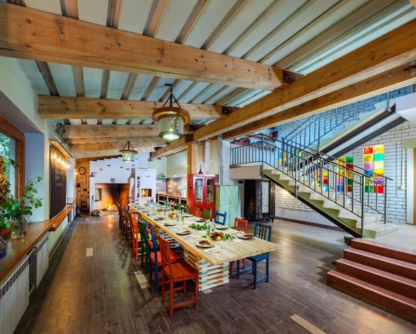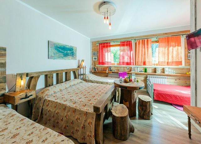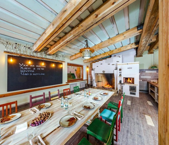 Отель представляет собой дачу с камином-печью и библиотекой.