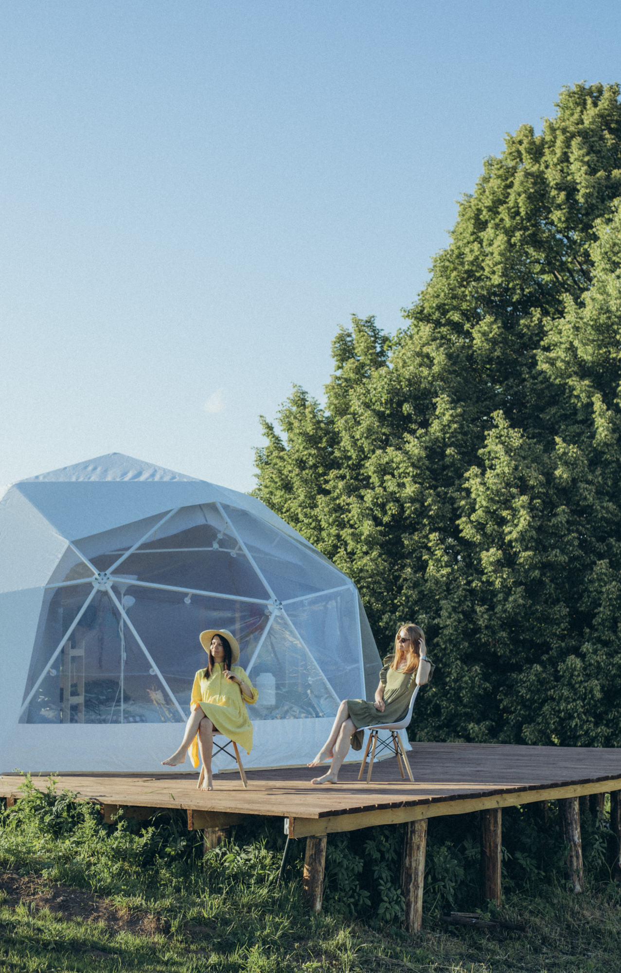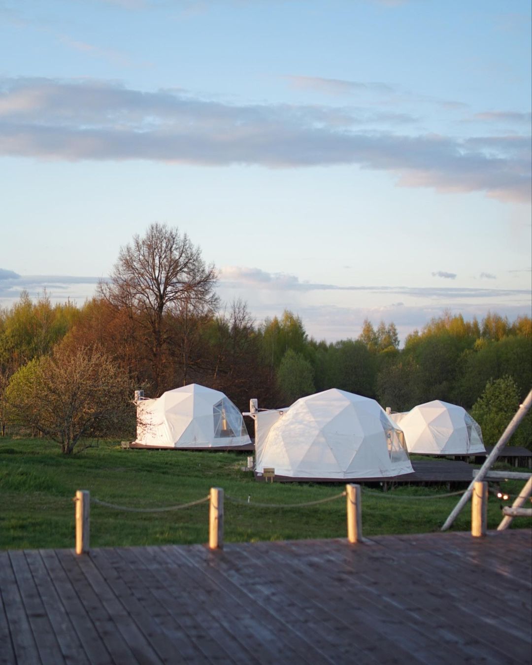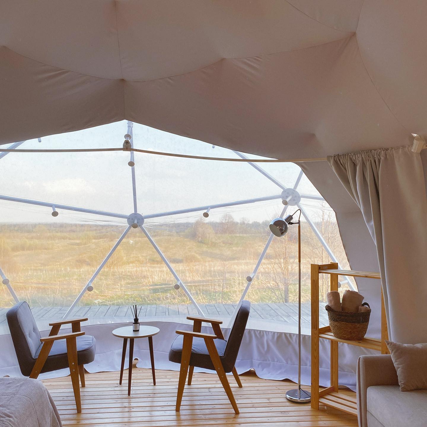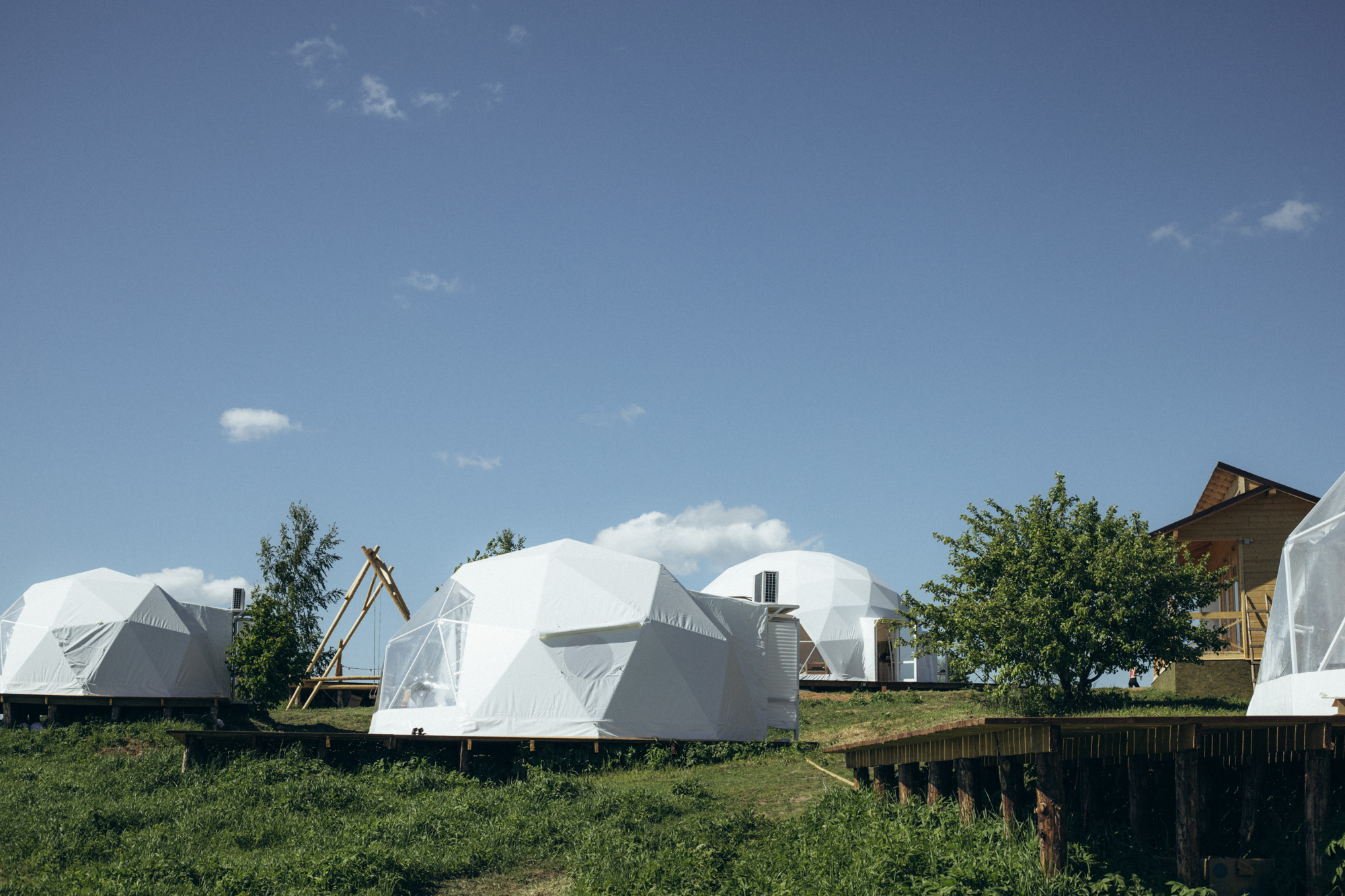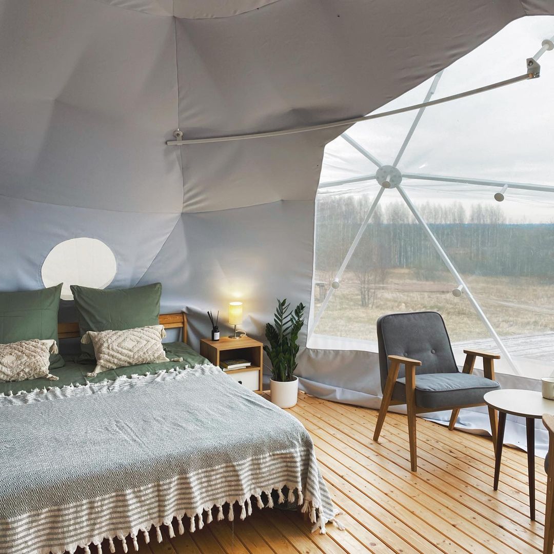4 геокупольных жилых шатра. 2 Шатра – двухместное размещение; 2 шатра – 3-4хместное размещение. Отдельный Главный шатер – общественное пространство с панорамной террасой.