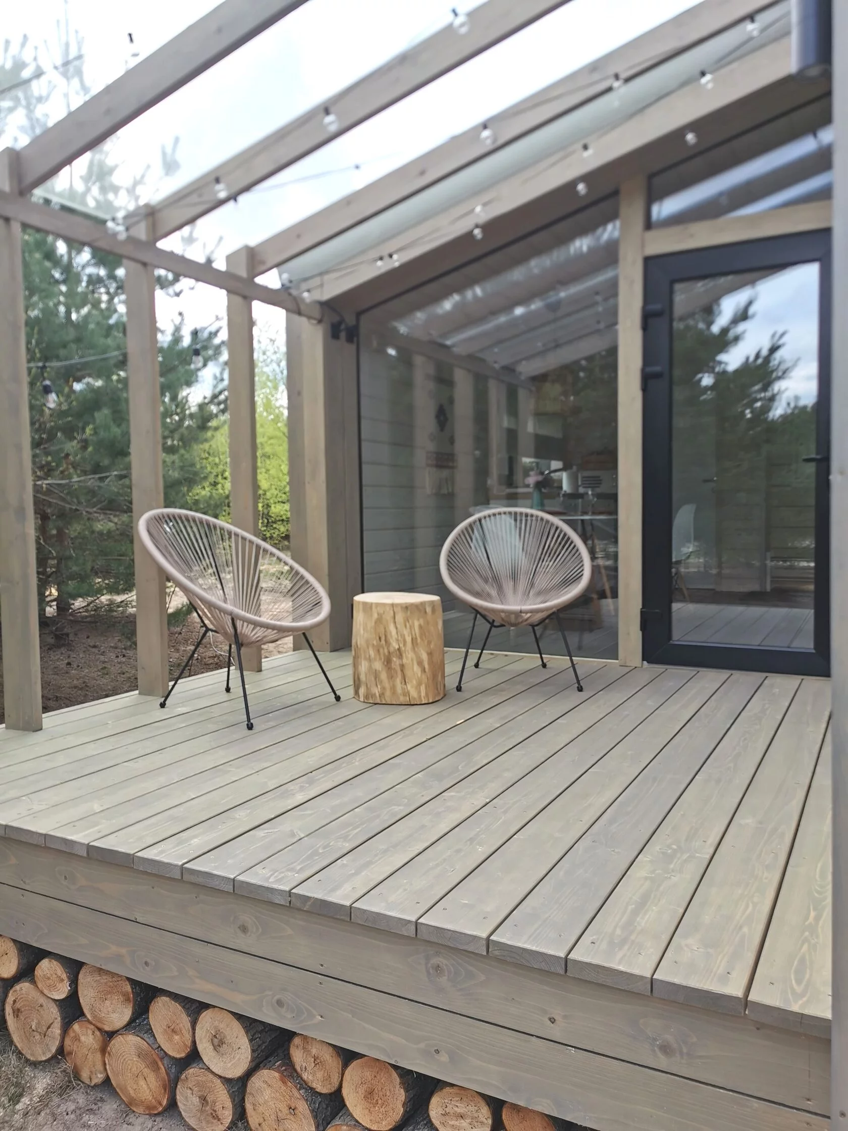 На веранде можно комфортно разместиться на овчинках в креслах Jysk с чашечкой ароматного травяного чая.
