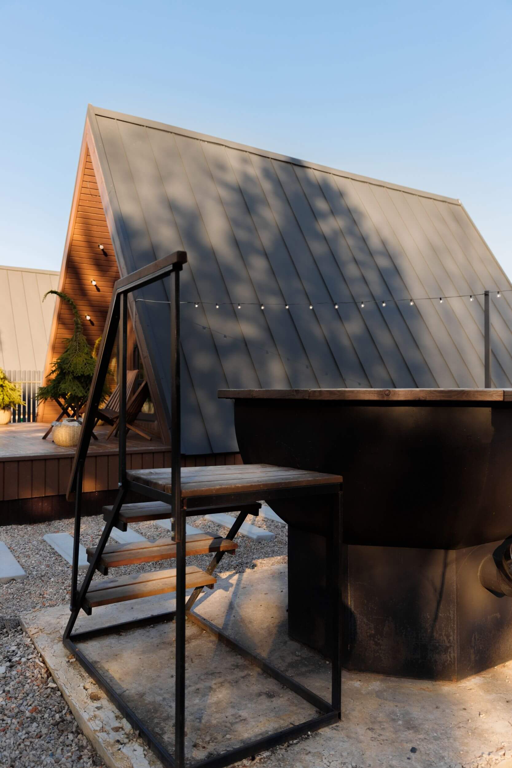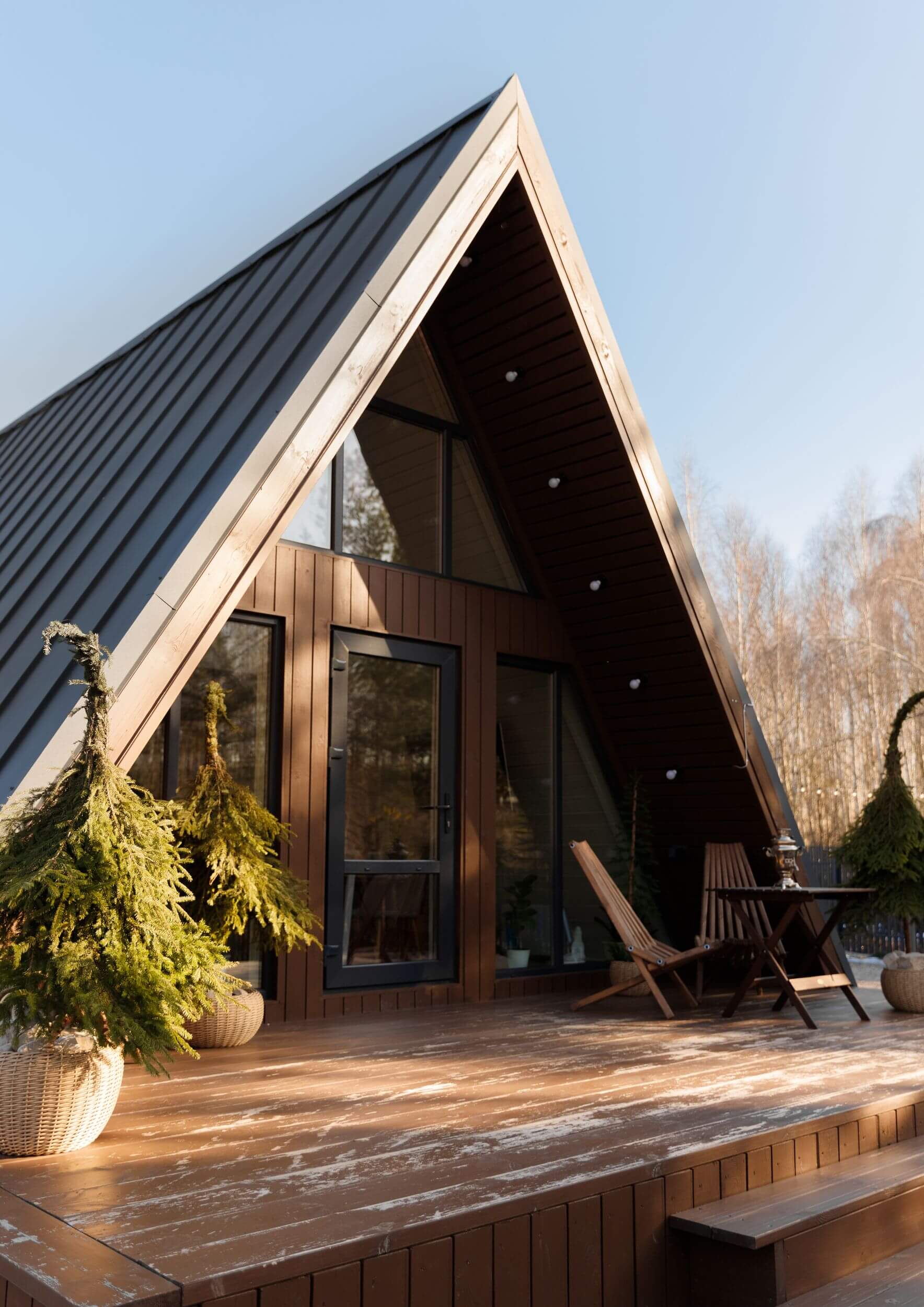 Треугольный дом площадью 72 кв.м., отличается от аналогичных большим размером, вмещая 4 полноценных спальных места. Территория вокруг дома 6 соток, на всей территории работает wi-fi.