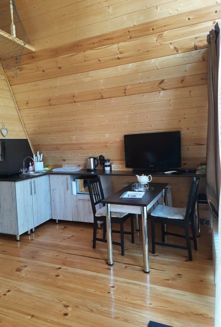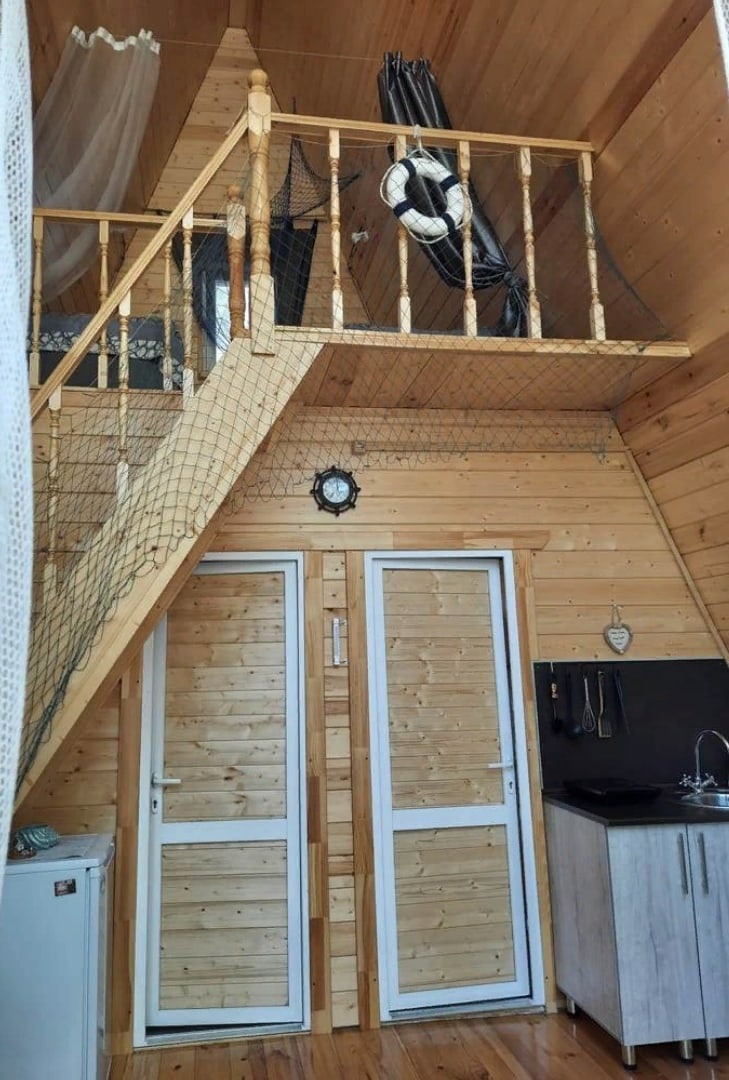 Домик рассчитан на 4 основных места и 2 дополнительных. На первом этаже размещена гостиная с мини-кухней, спальней и санузлом, на втором этаже открытая комната - лофт.