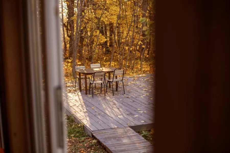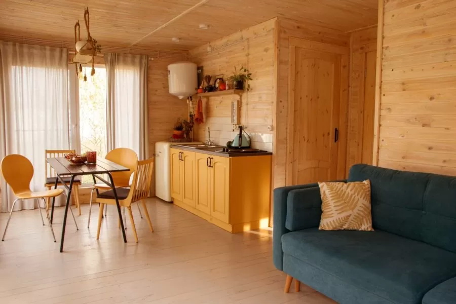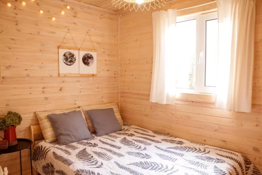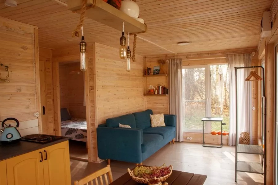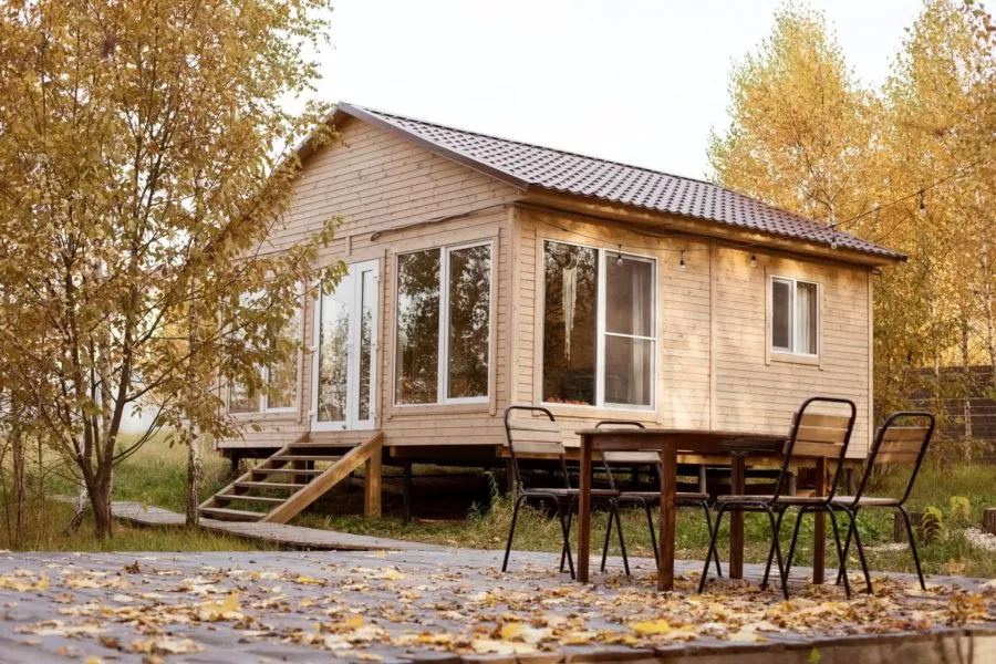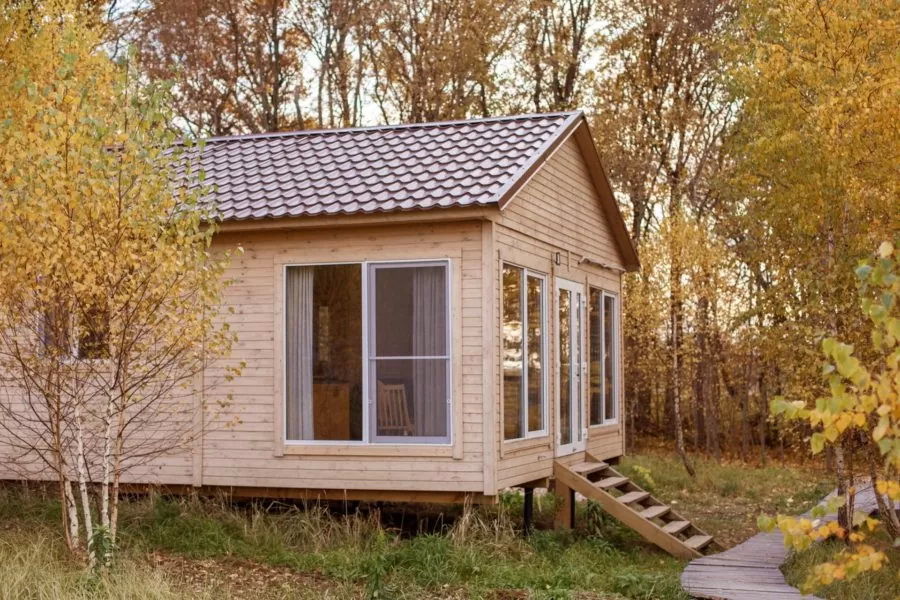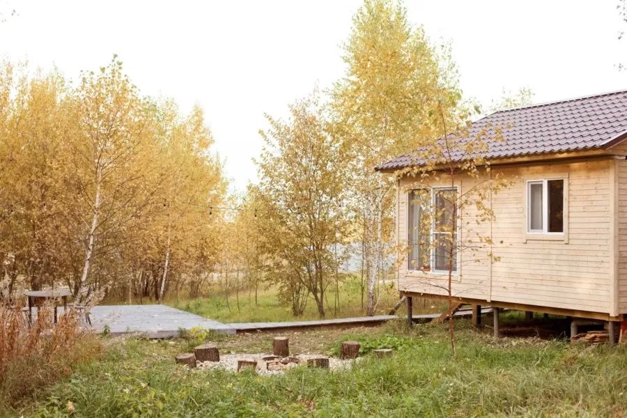 Дом 40 квадратных метров находится на опушке леса, окружён молодыми березами.