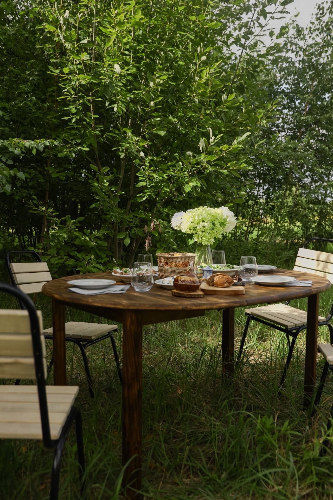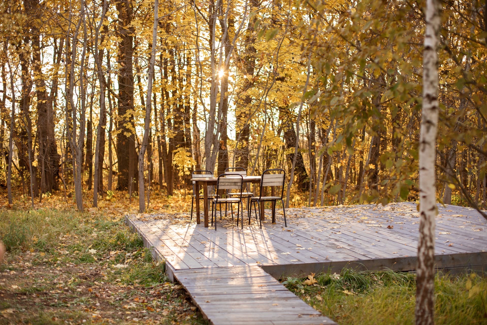 Прилегающая территория 15 соток с парковкой, деревянными дорожками, большим подиумом и уличной мебелью.