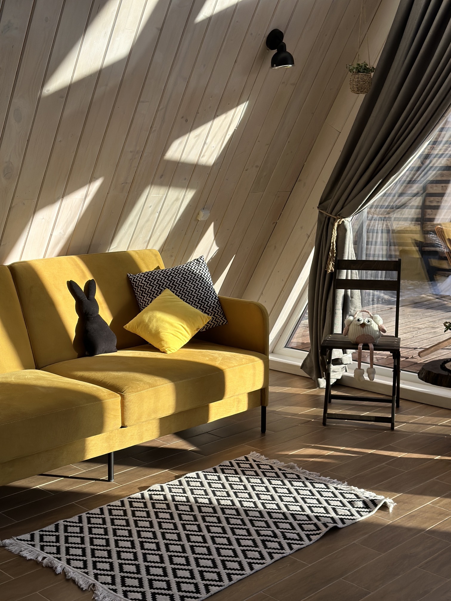 В доме раскладной удобный диван, панорамное остекление с видом на лес.
