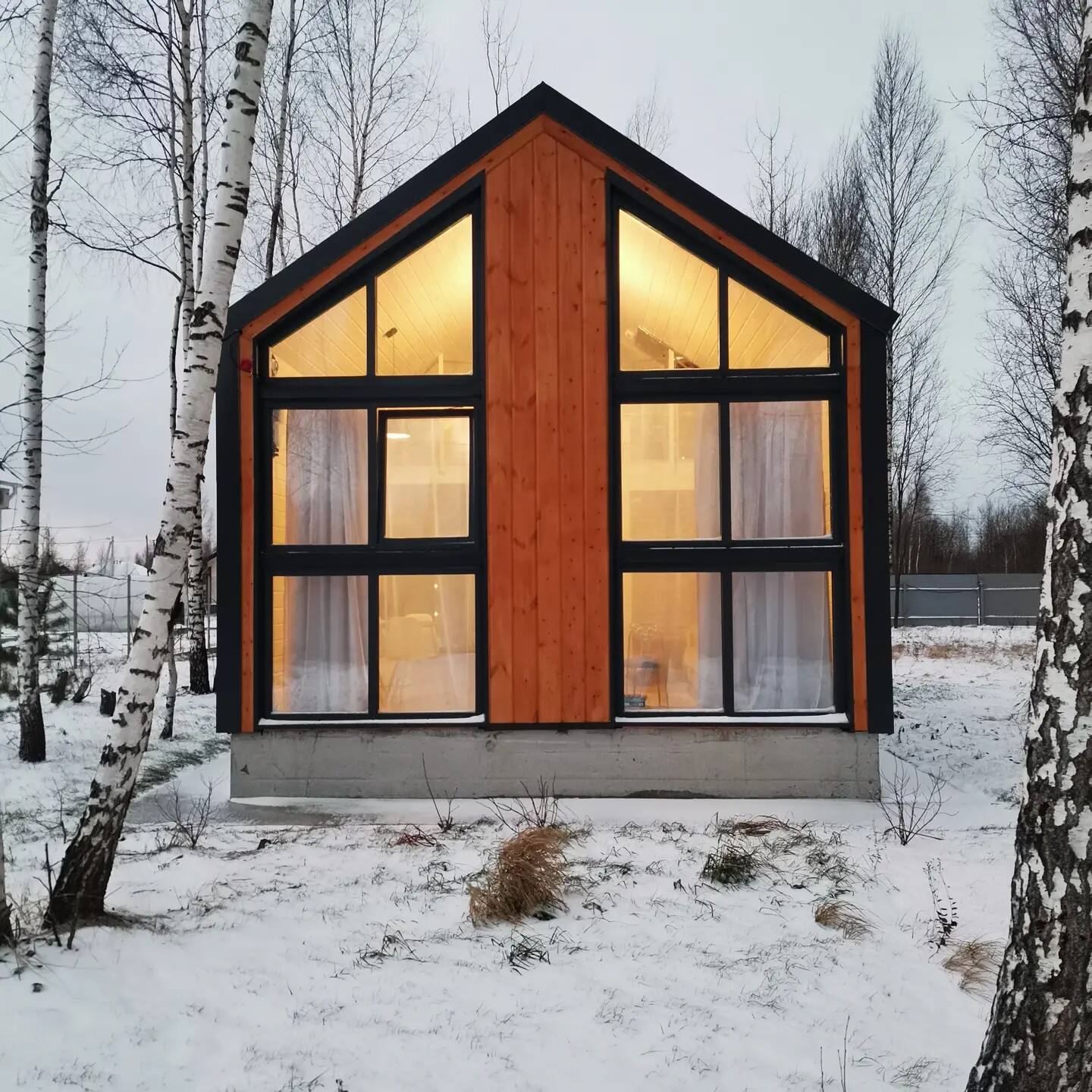 Новый дом в стиле барнхаус с панорамными окнами и просторной верандой расположен на лесном участке среди берез и осин, недалеко от соснового леса и Москва реки.