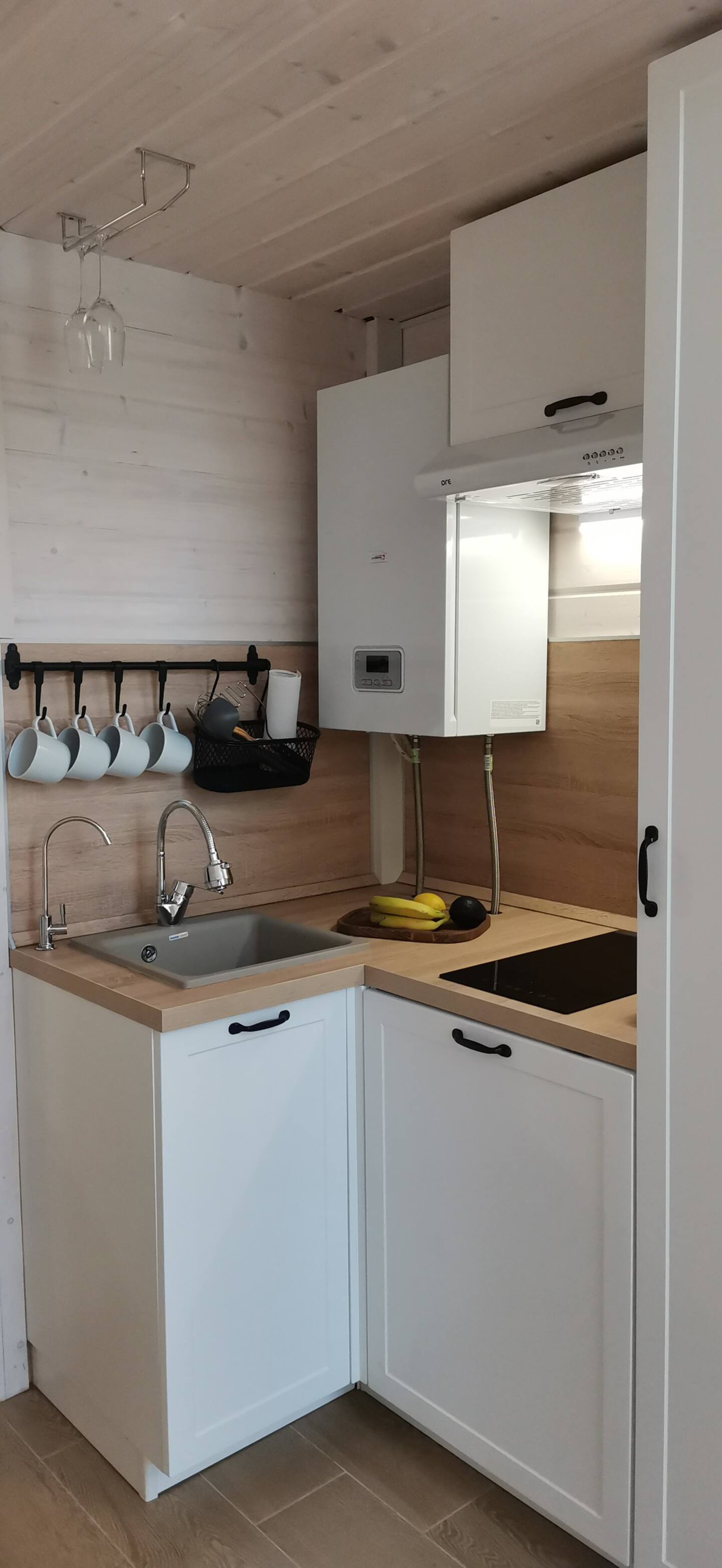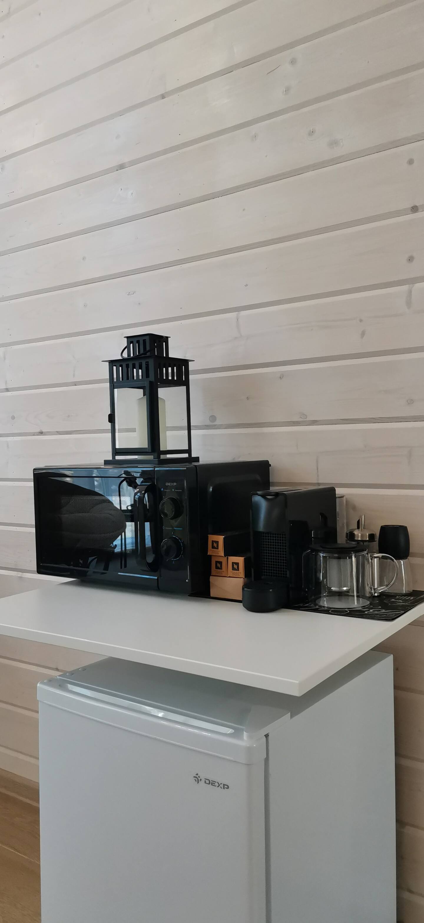 Оборудованная кухня: холодильник, варочная панель, микроволновая печь, чайник, кофемашина, посуда, бокалы, столовые приборы, чай, кофе, сахар, соль, специи, маршмеллоу.