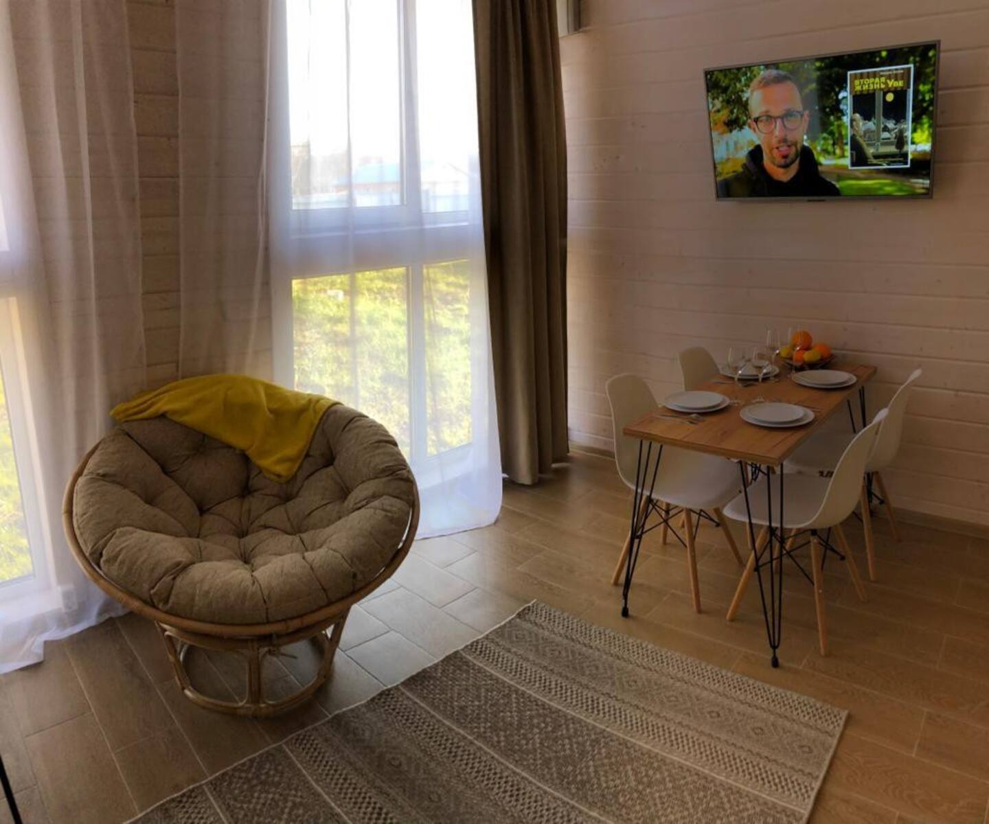 Гостиная: удобный диван-кровать, уютное кресло из ротанга, обеденный стол на 4-х человек, smart TV, Wi-Fi, настольные игры, книги, небольшой камин.