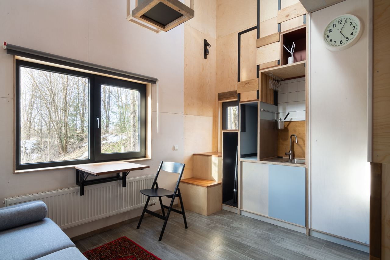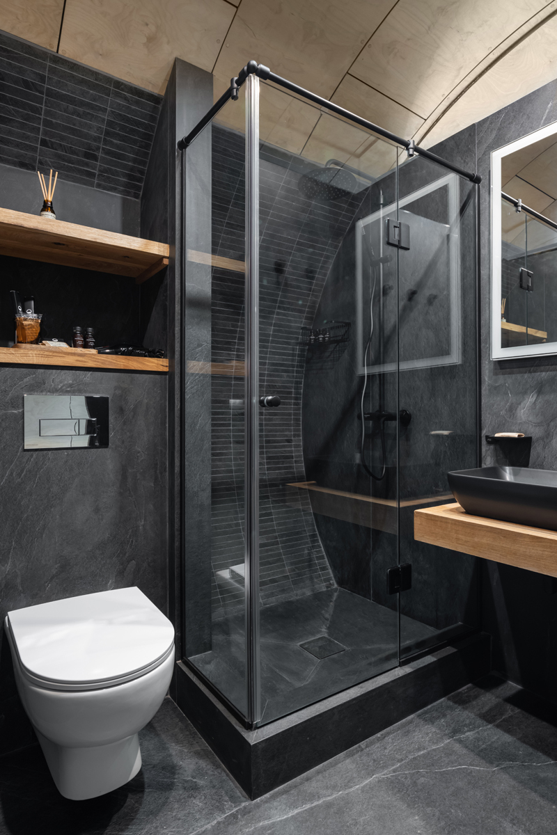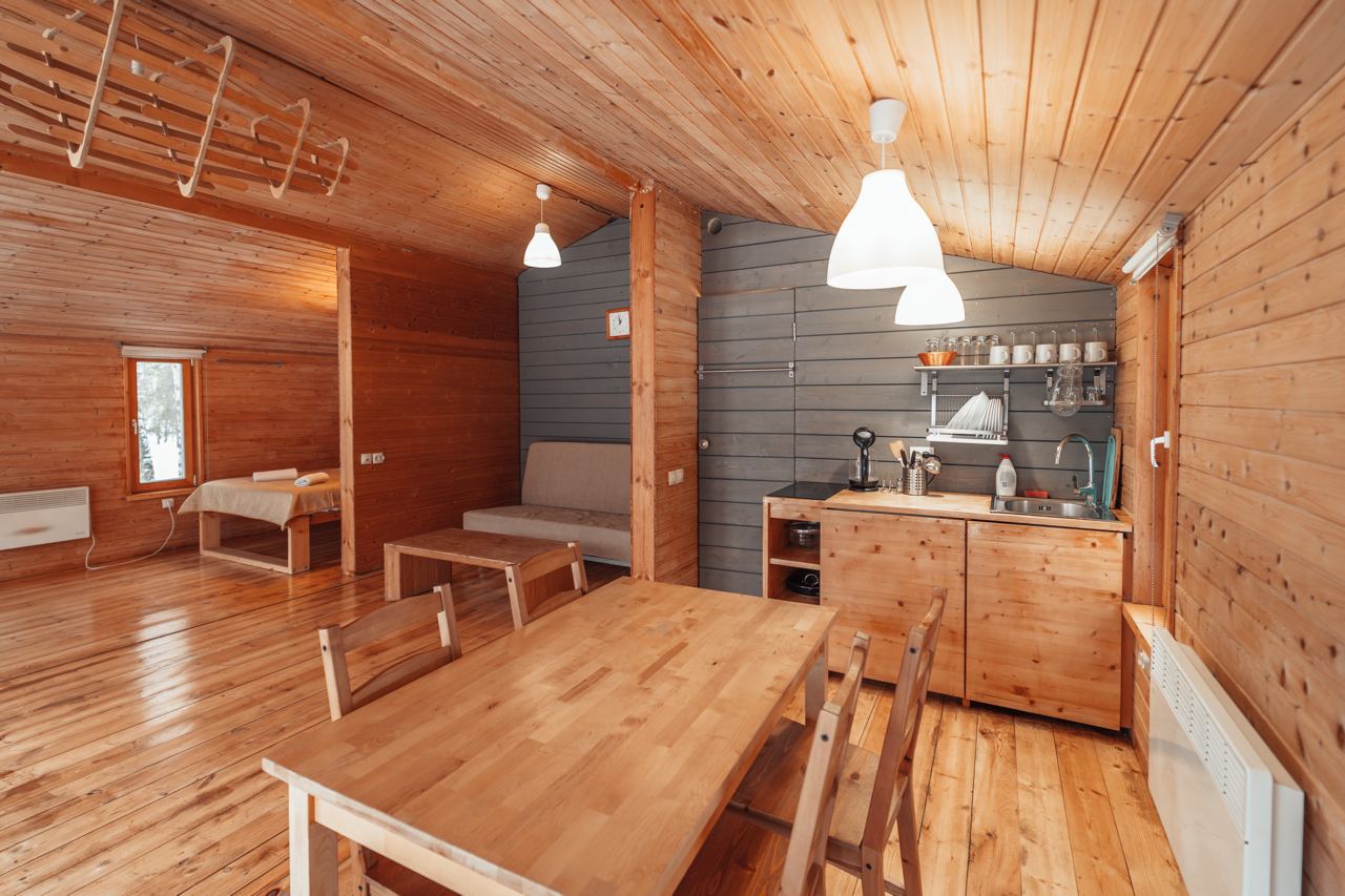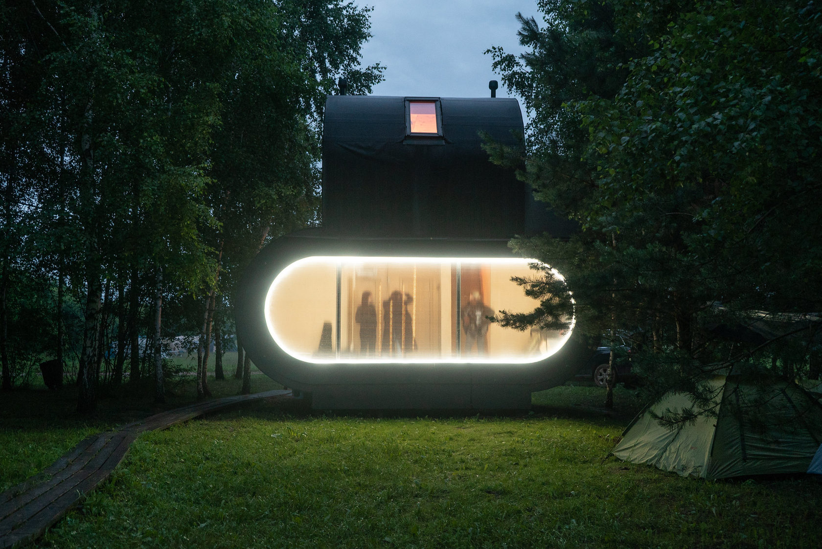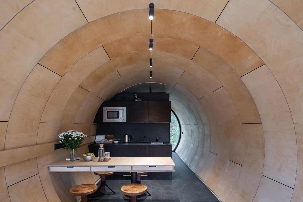 Это полноценный жилой дом со всеми удобствами. Внутри можно жить – остаться на ночь, приготовить ужин и принять душ. Отделка интерьера выполнена в современном стиле с использованием древесины и металла, а помещение оборудовано всем необходимым для комфортного проживания.