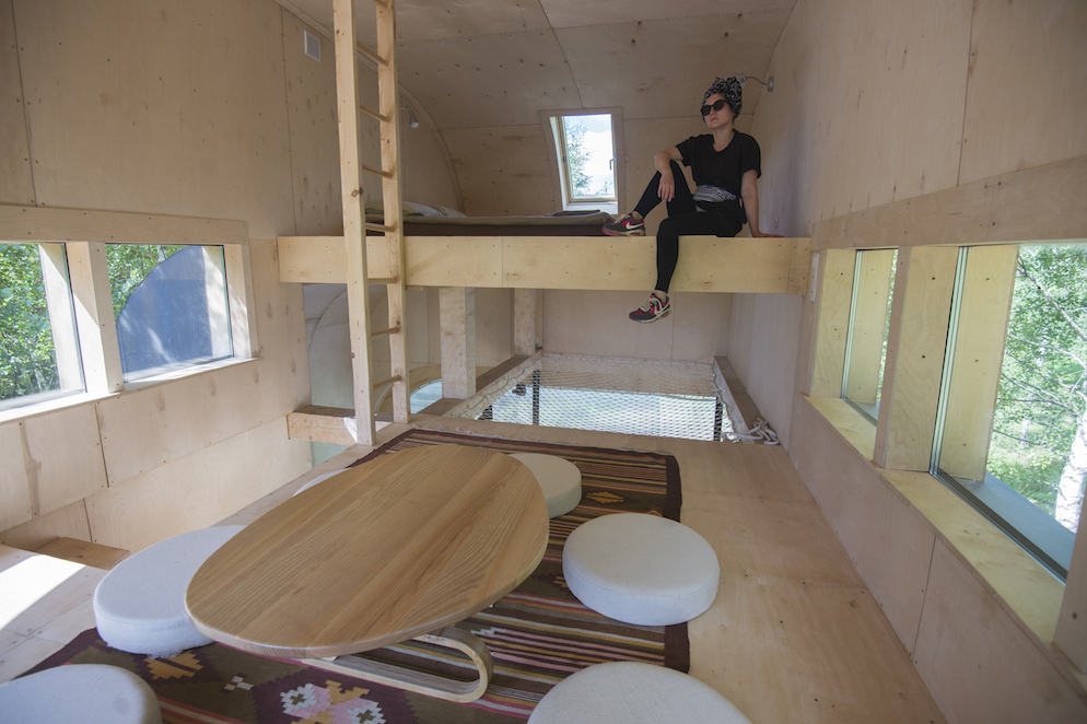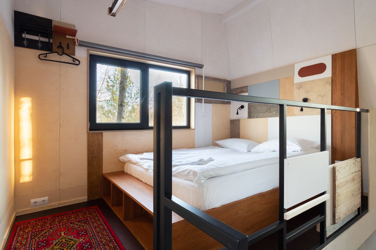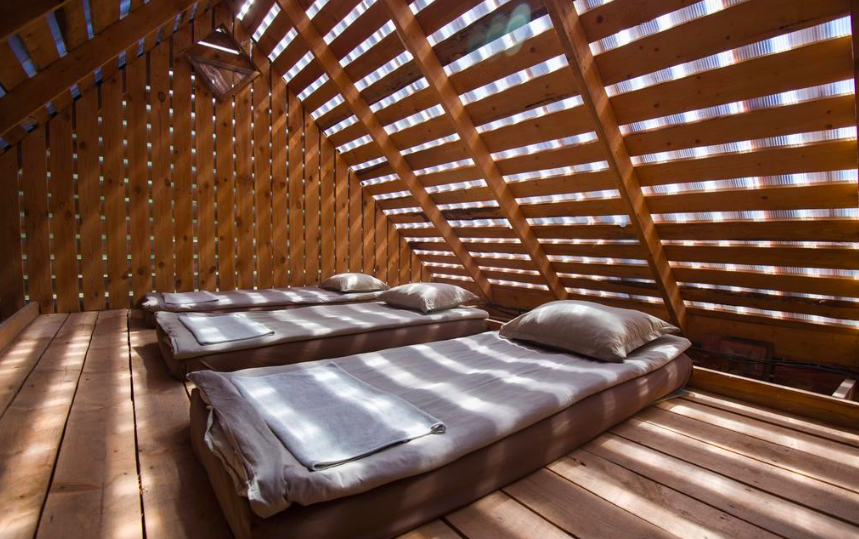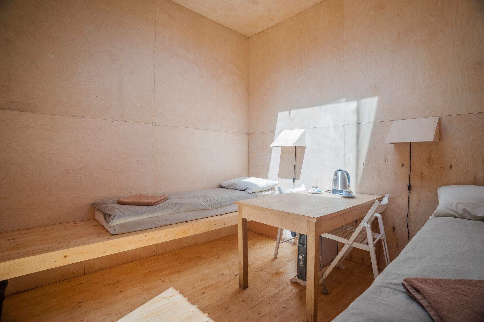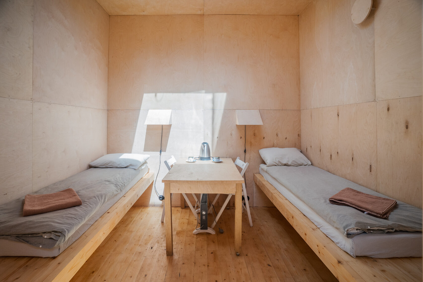 Жилой модуль для двух человек, выполнен из дерева и не имеет окон. Единственный световой проем расположен в потолке помещения.