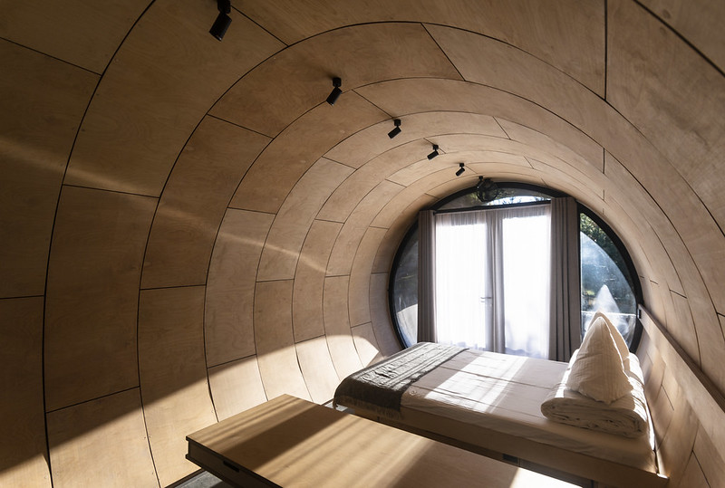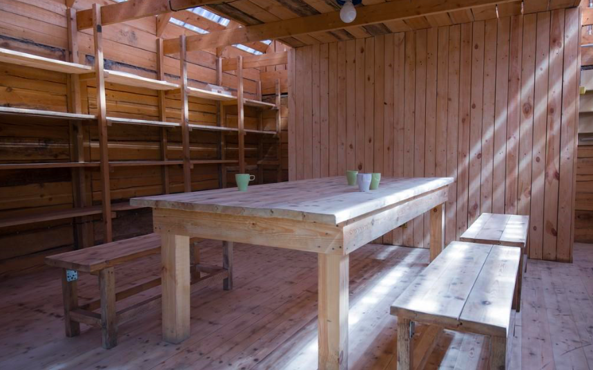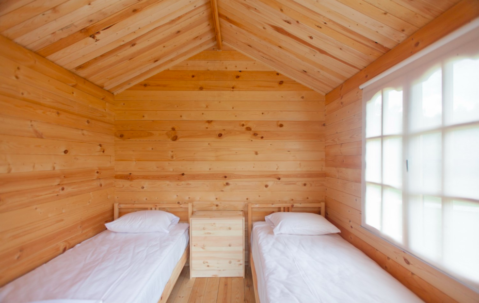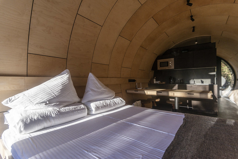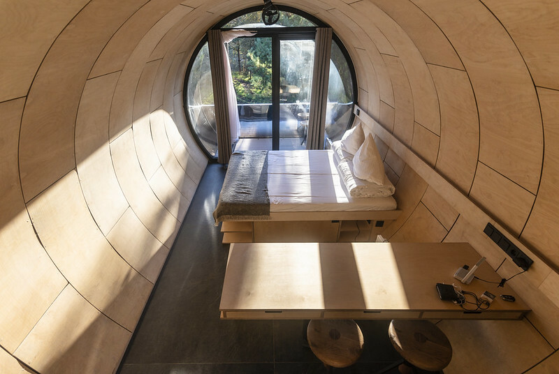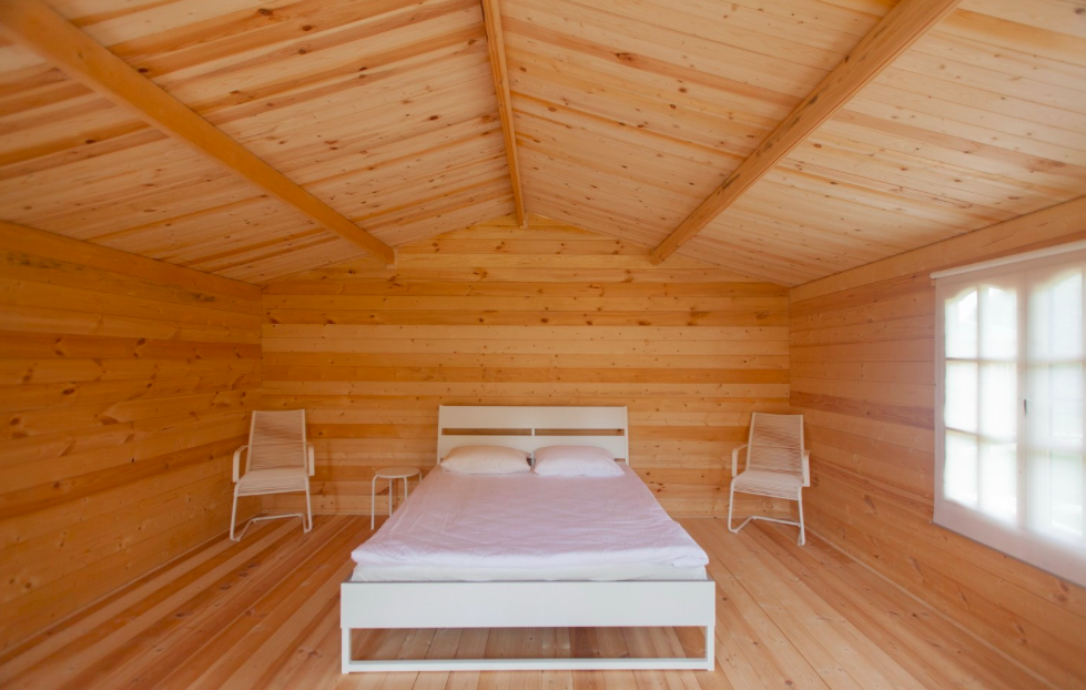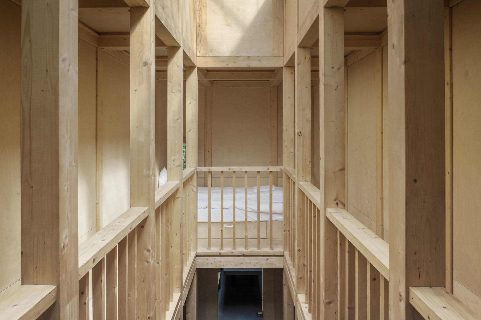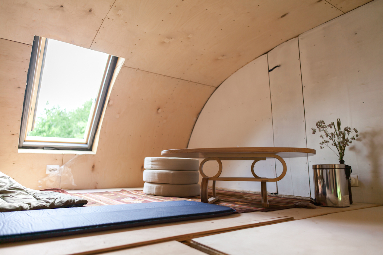 Жилой модуль для двух человек, выполнен из дерева и не имеет окон. Единственный световой проем расположен в потолке помещения.