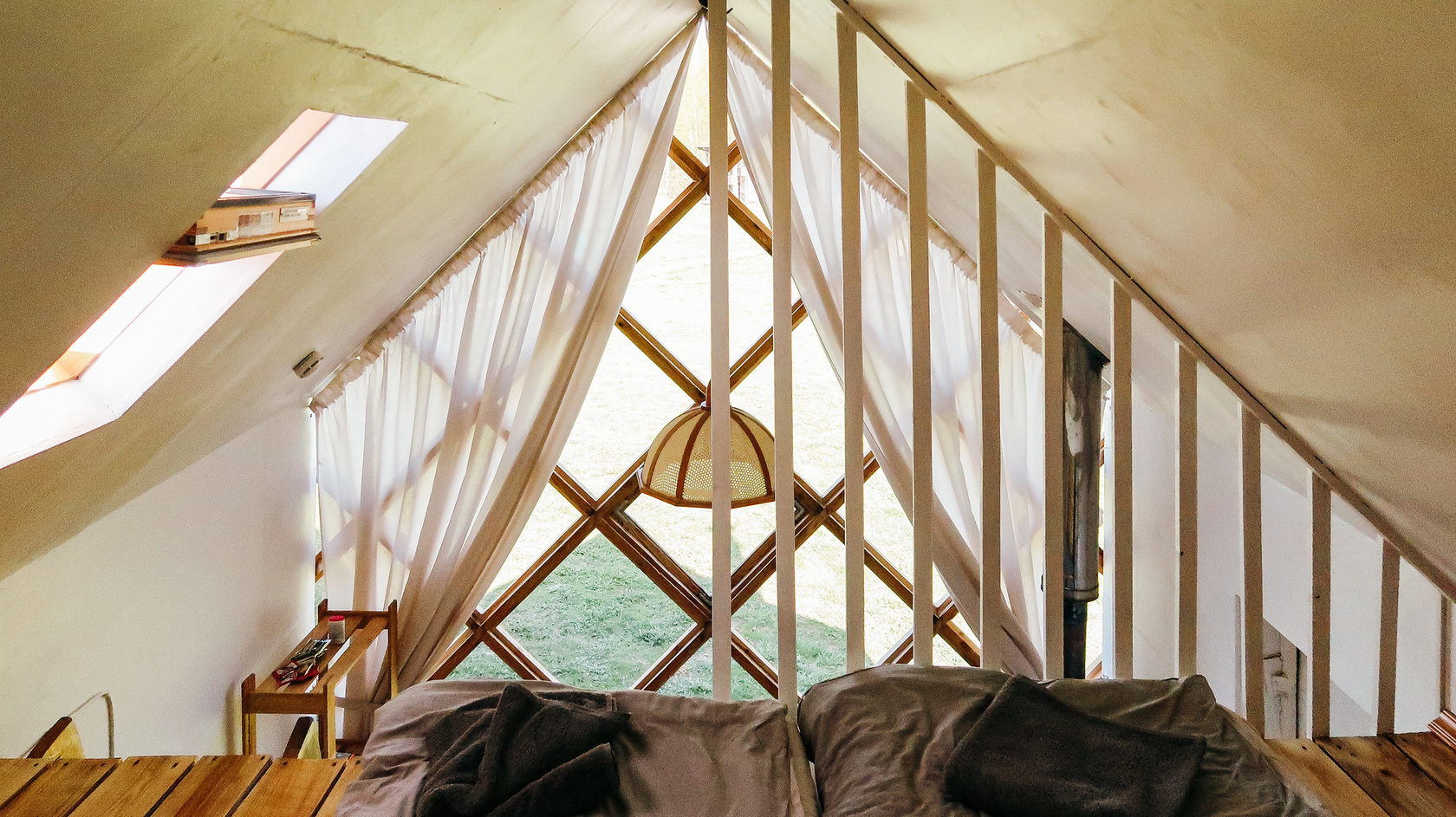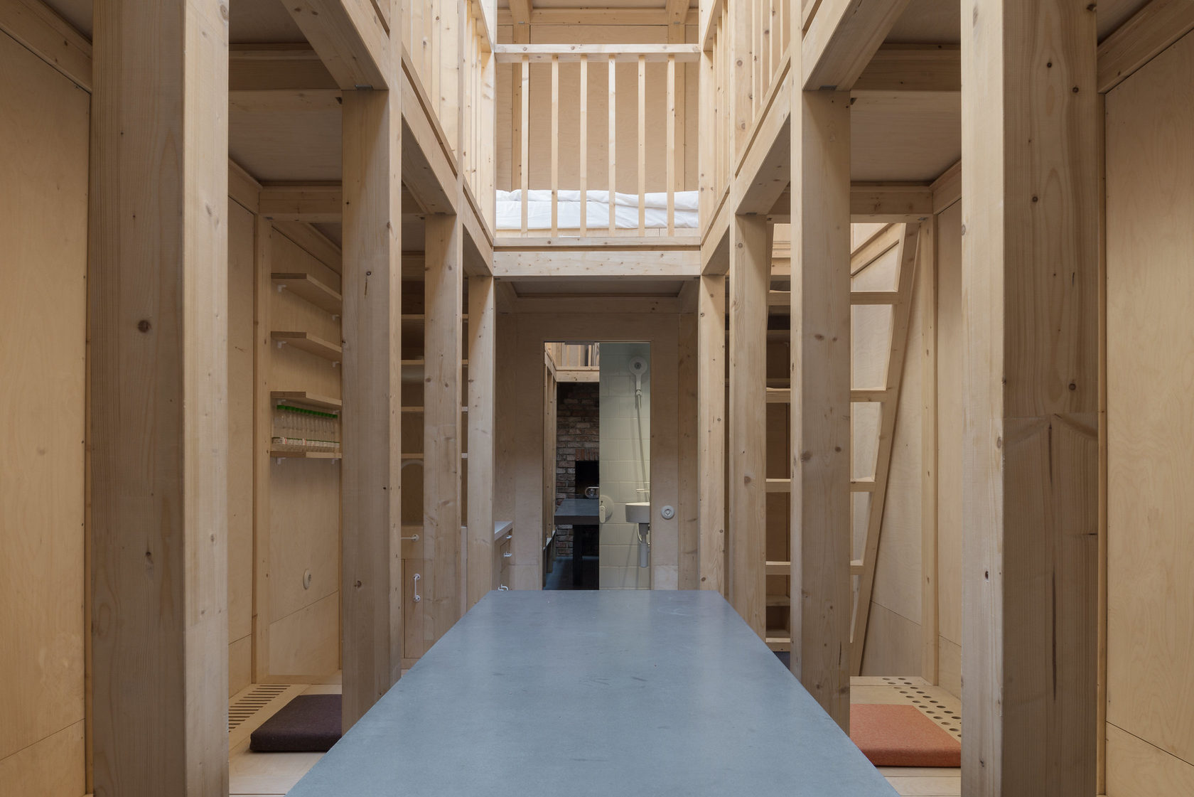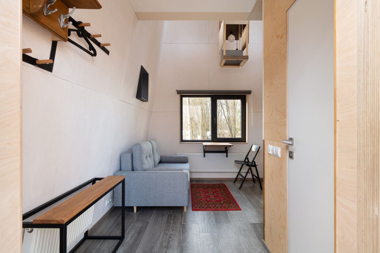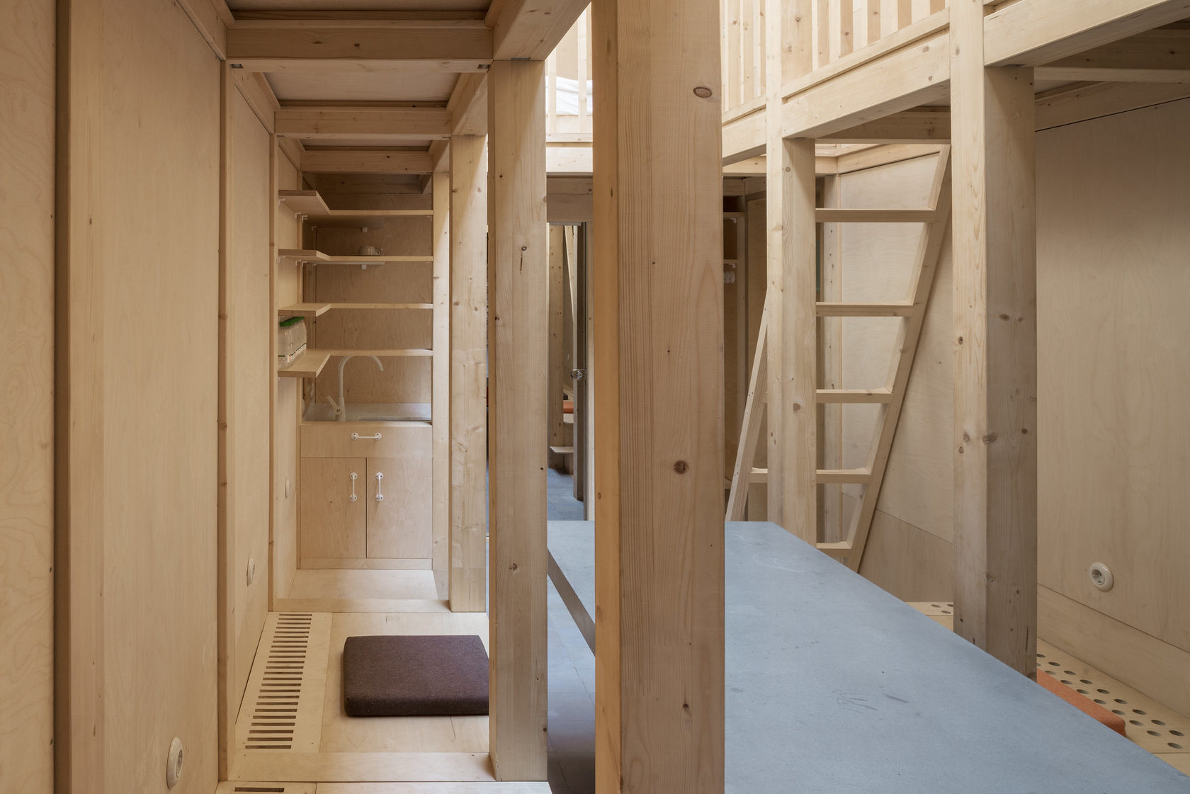 Жилой модуль для двух человек, выполнен из дерева и не имеет окон. Единственный световой проем расположен в потолке помещения.