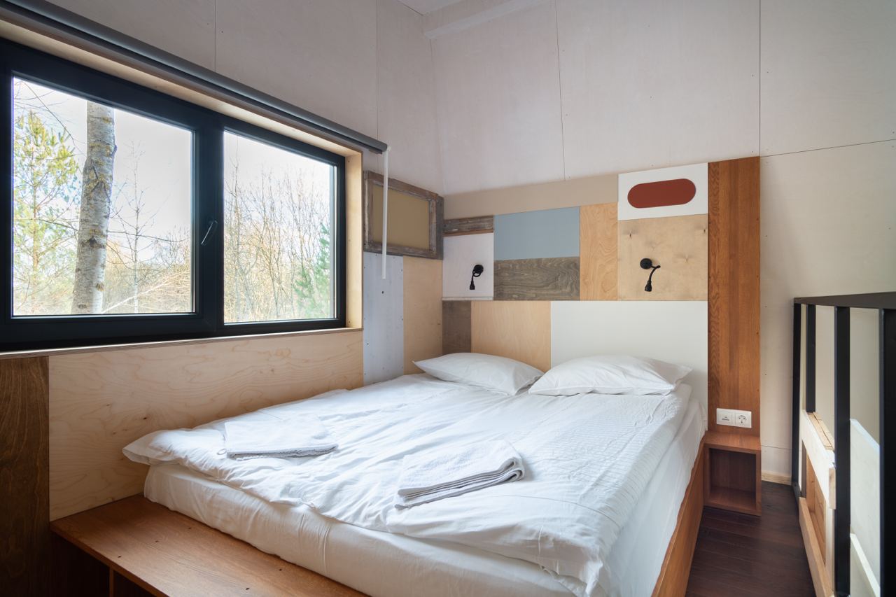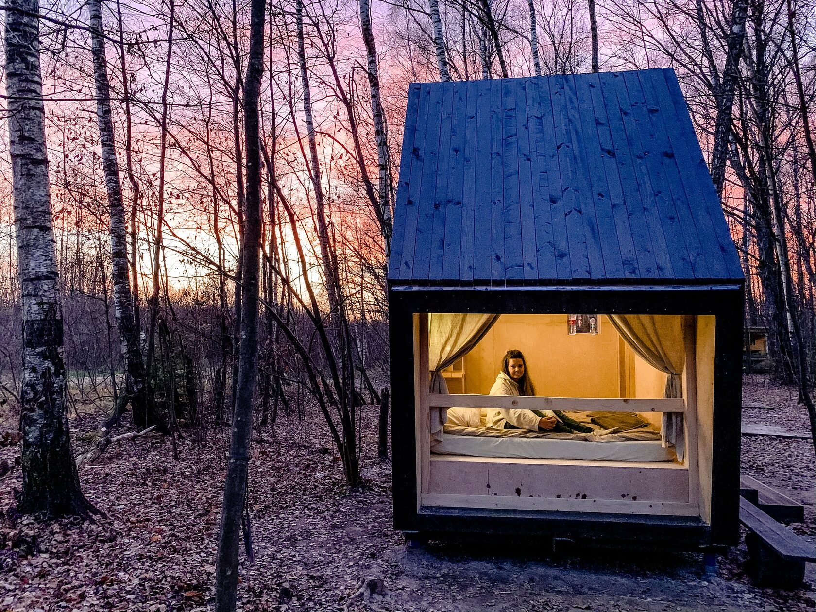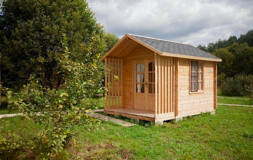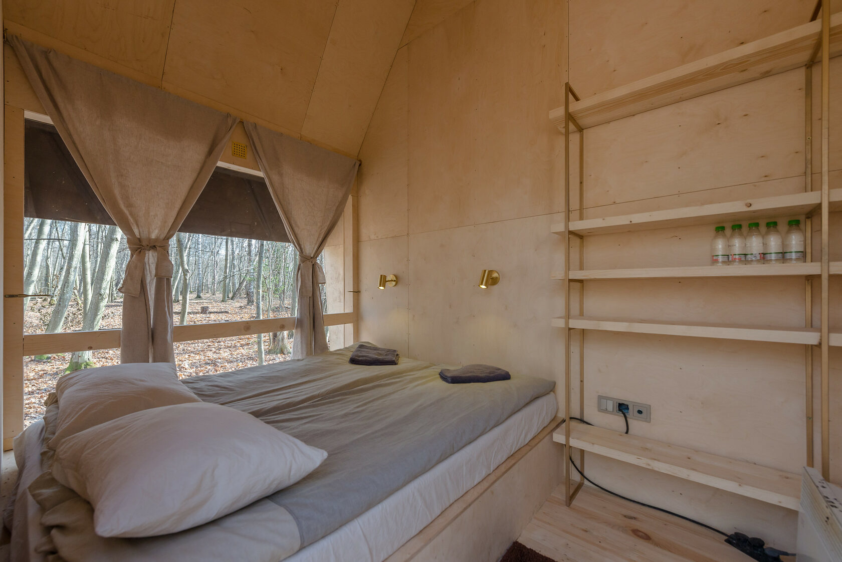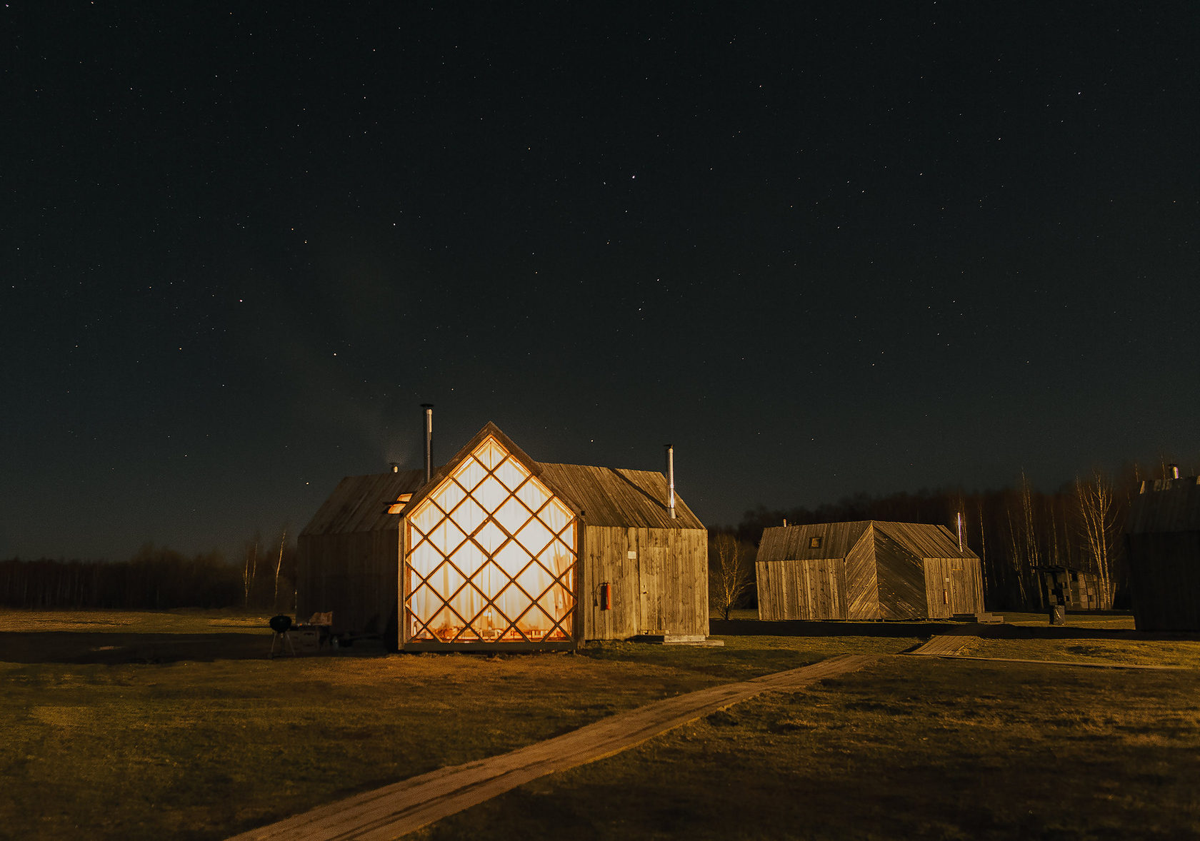 Проект архитектурной студии «Мел» (Mel Space), лауреат премии ARXИWOOD. Выполнены из деревянного бруса, обшиты грубой старой доской снаружи и белой фанерой внутри, утеплены. Спальное место на втором ярусе, одна стена — прозрачная. В домике можно жить вдвоём, втроём, вчетвером (два дополнительных спальных места устанавливаются по вашей просьбе; можно также поставить детскую кроватку). Душ и туалет — на улице поблизости.