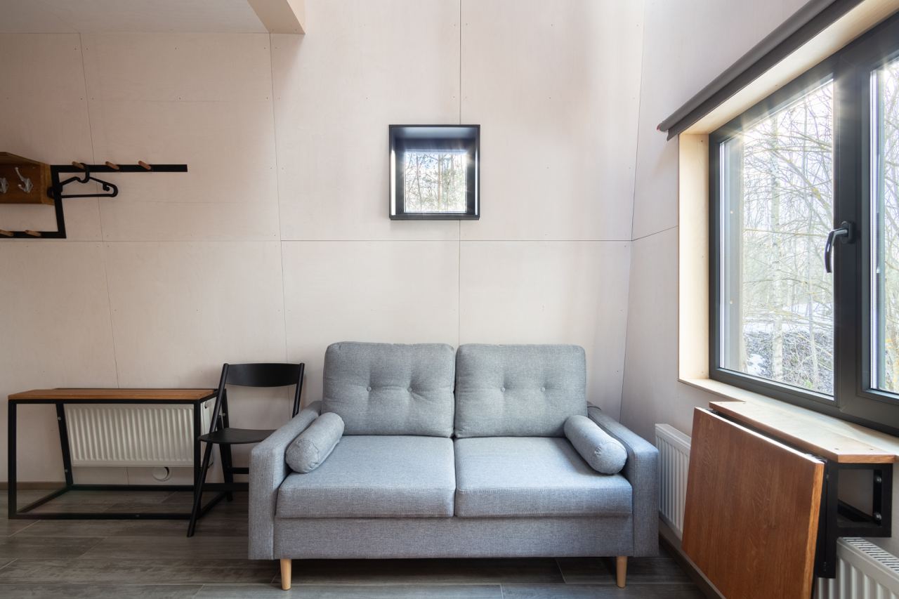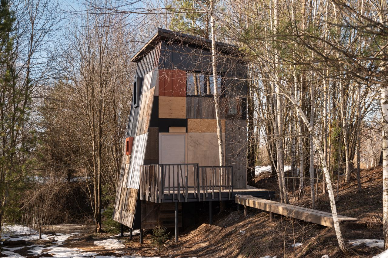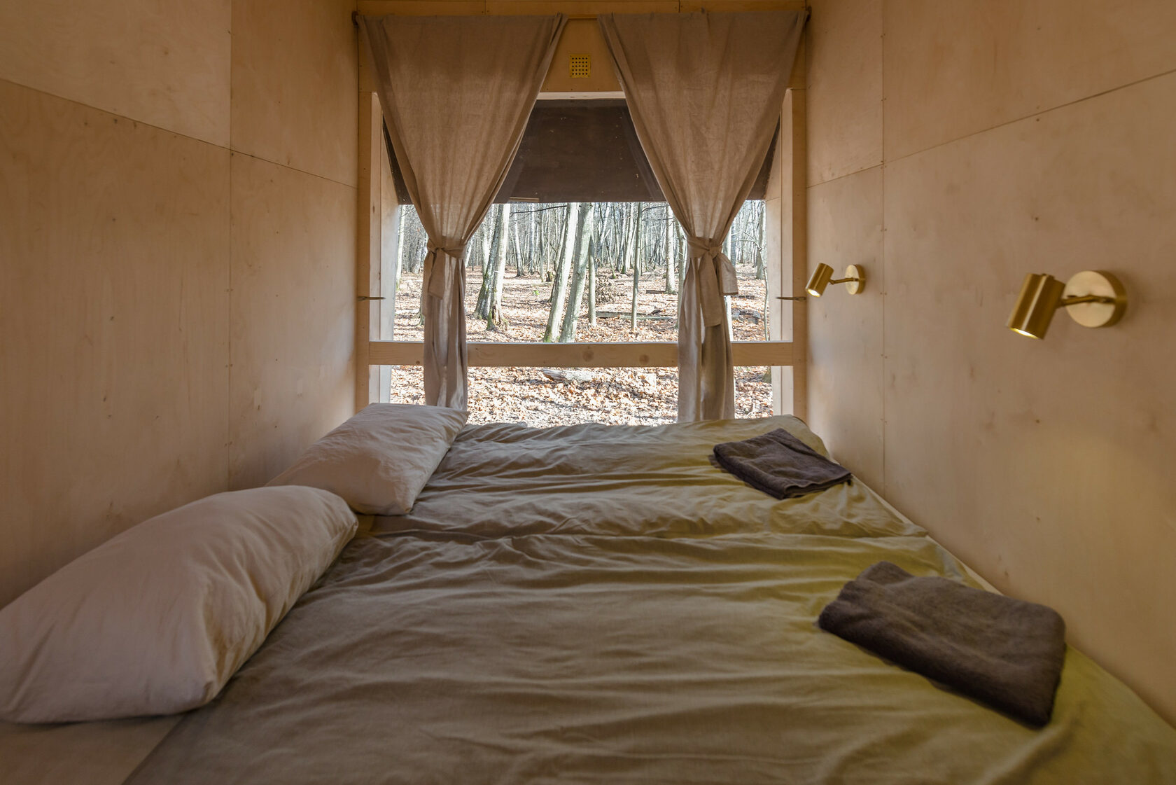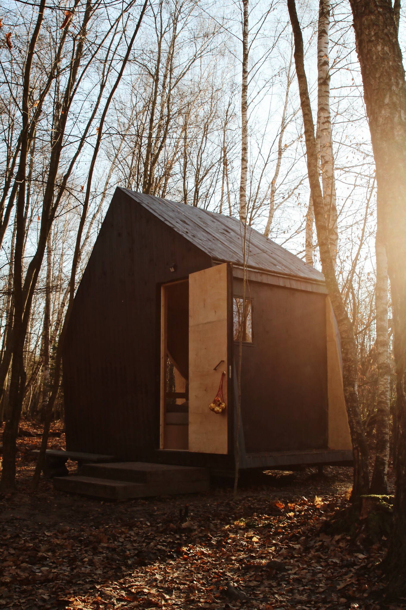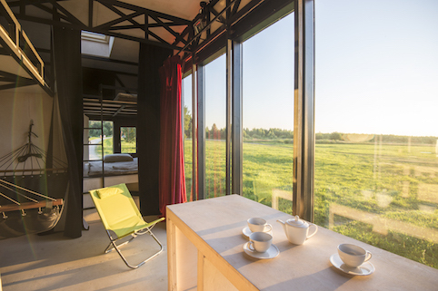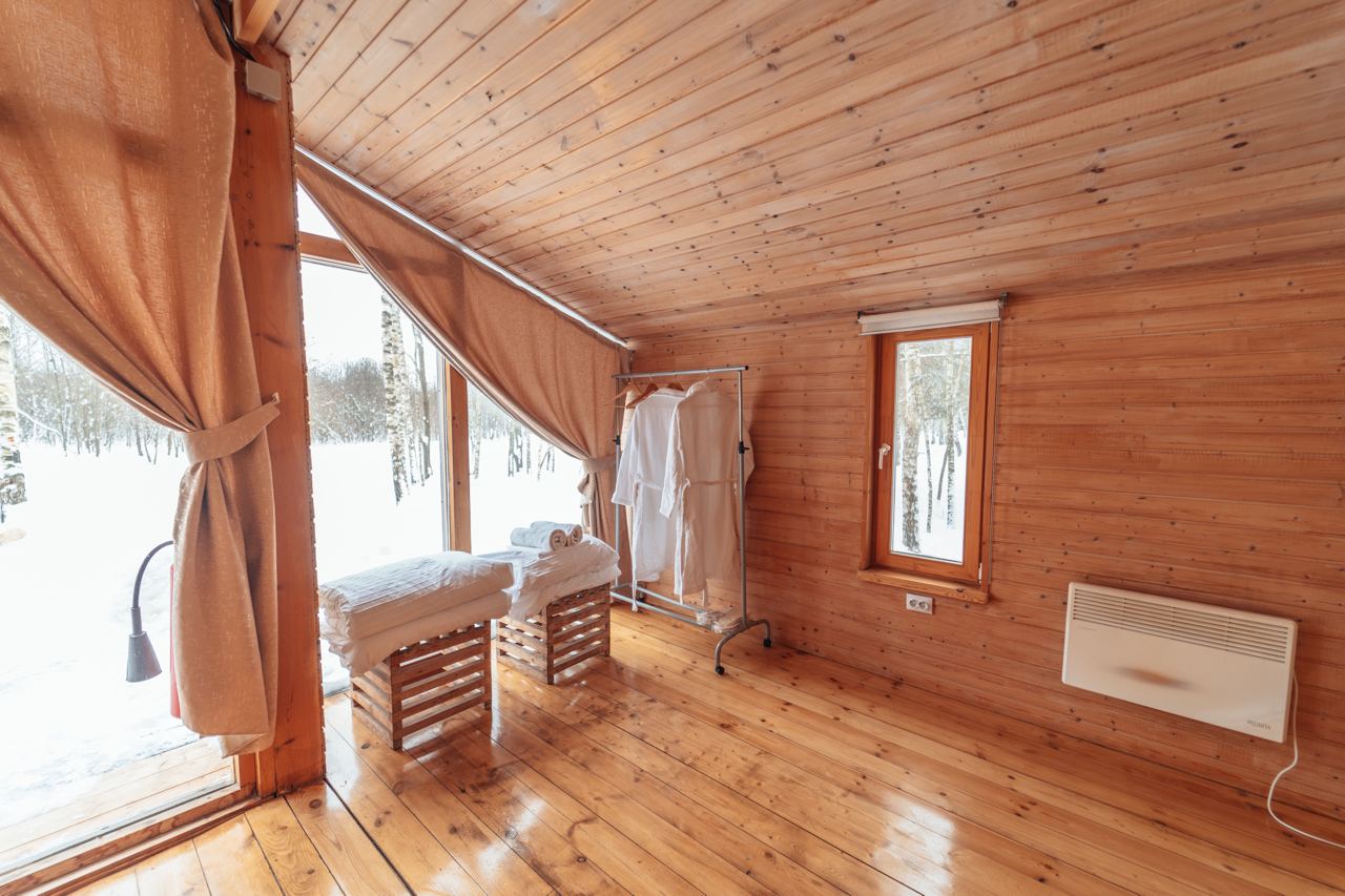 Проект архитектурной студии «Мел» (Mel Space), лауреат премии ARXИWOOD. Выполнены из деревянного бруса, обшиты грубой старой доской снаружи и белой фанерой внутри, утеплены. Спальное место на втором ярусе, одна стена — прозрачная. В домике можно жить вдвоём, втроём, вчетвером (два дополнительных спальных места устанавливаются по вашей просьбе; можно также поставить детскую кроватку). Душ и туалет — на улице поблизости.