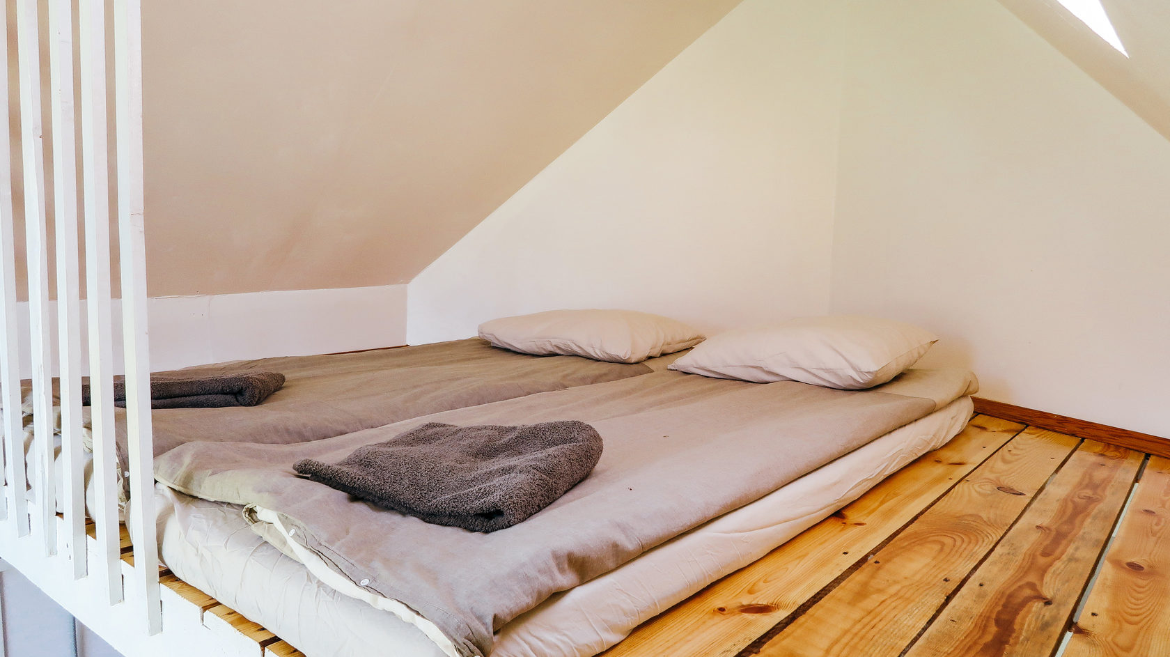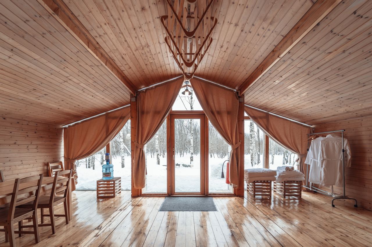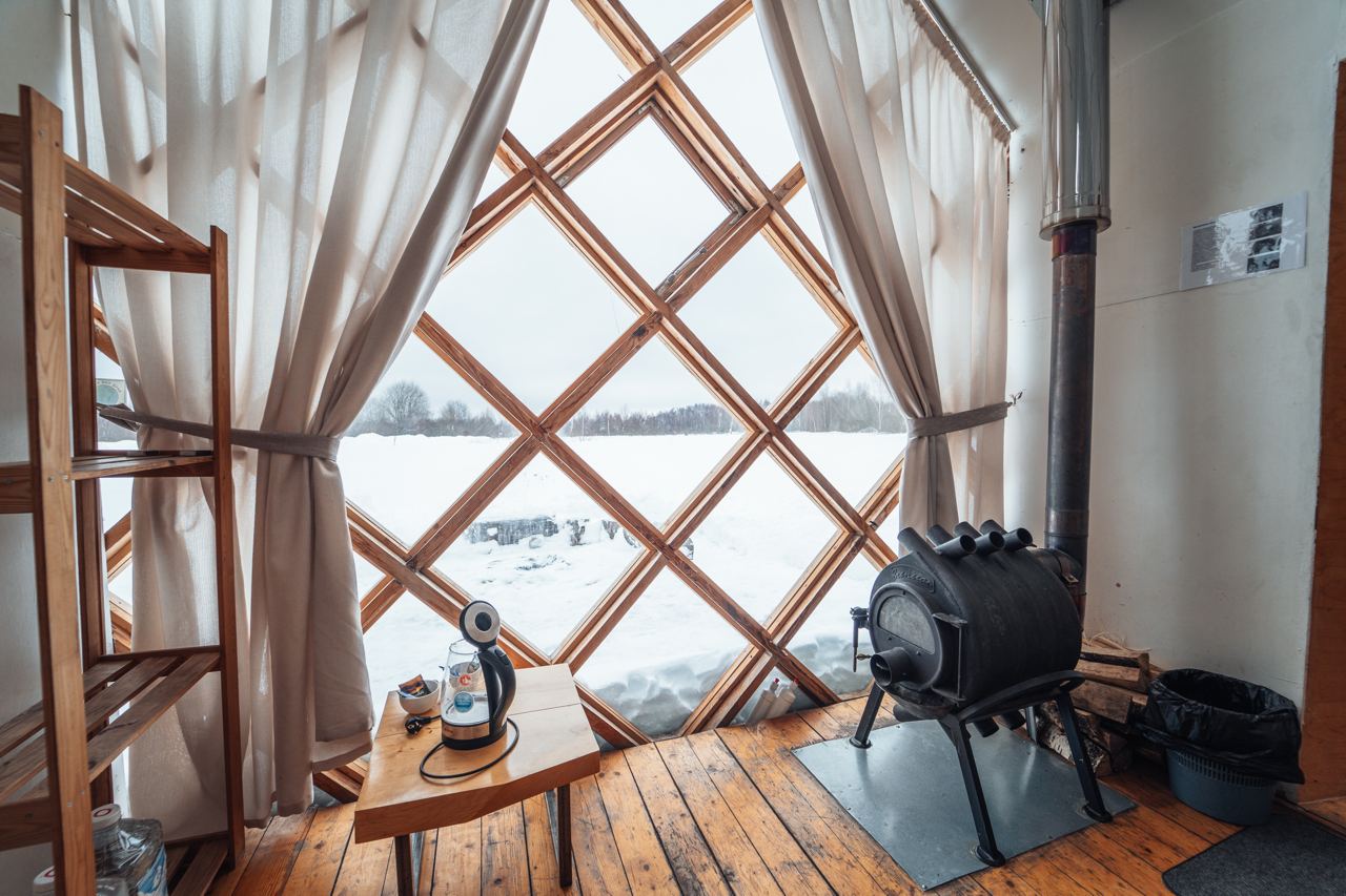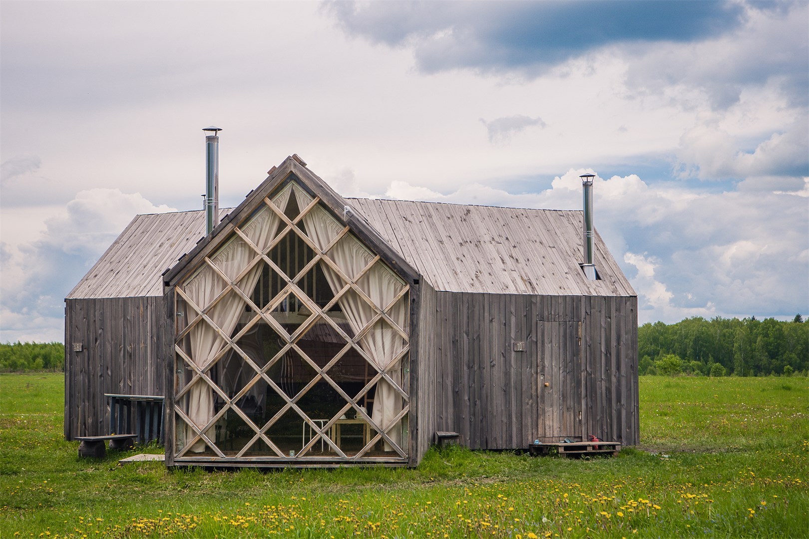 Место для жизни большой компании. Домик на территории арт-парка Никола-Ленивец с высокими матрасами, туалетом, душем с теплой водой, холодильником, печкой, общественным пространством и wi-fi. Вместимость в стандартной комплектации 4 человека.