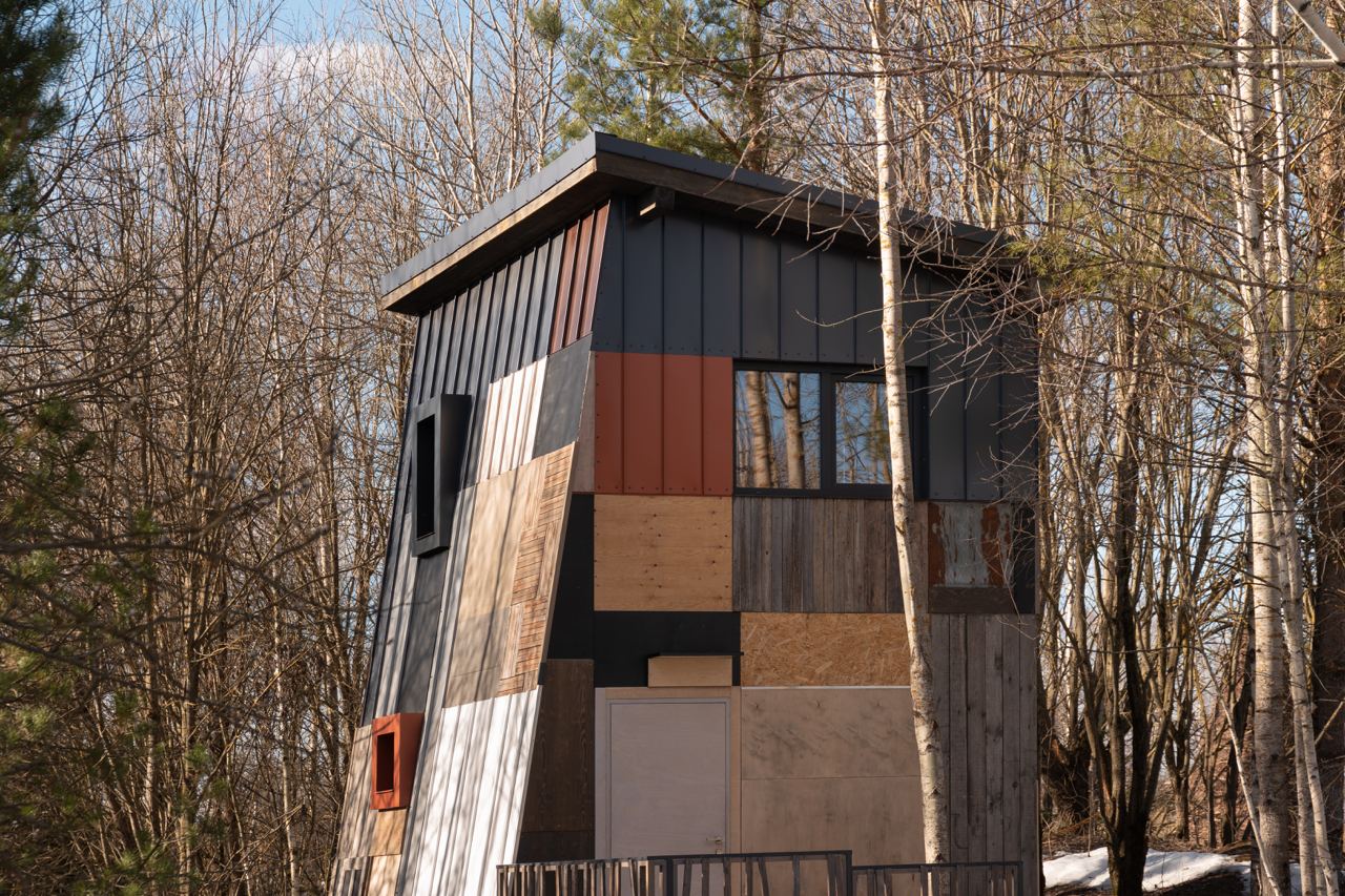 Часть материалов, использованных в строительстве, были найдены непосредственно в окрестностях Никола-Ленивца. Старые двери, доски и ворота, старая кровля с крыши стали отделкой фасада, а старый забор – ограждением. В интерьере реализована идея создания арт-объектов из привычной мебели и сочетания как можно большего числа материалов, что позволяет, находясь в доме, разглядывать предметы, как произведения искусства в галерее.