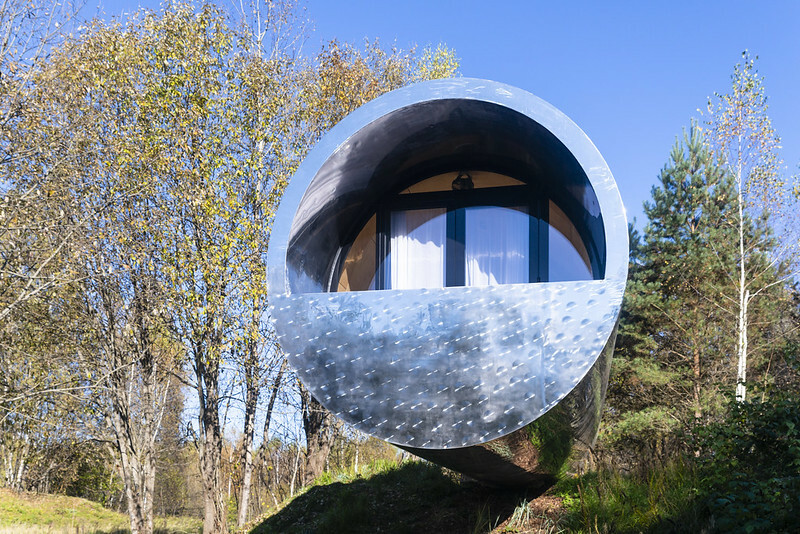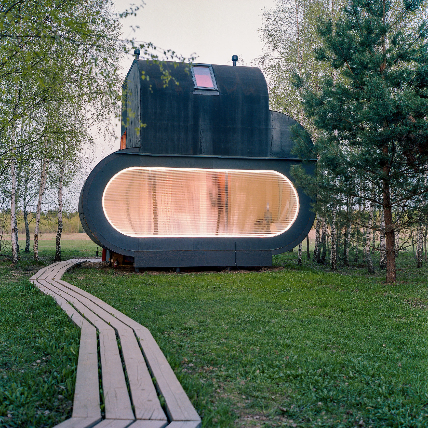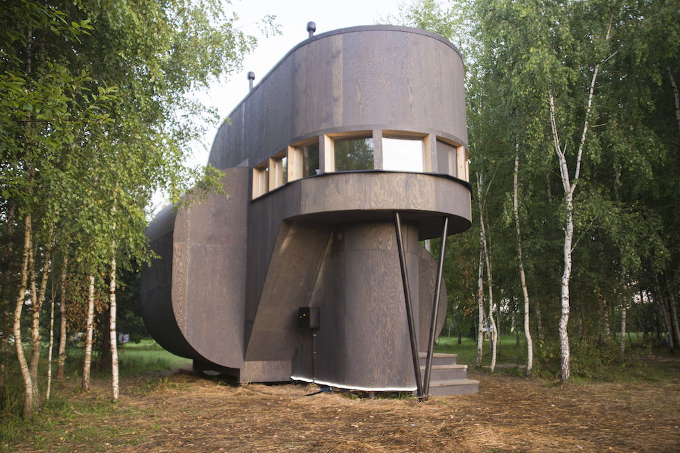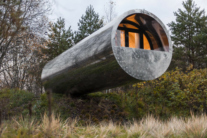 Необычный павильон разместился на рельефе с перепадом высоты, благодаря чему «труба» буквально зависла в воздухе. Конструкция «трубы» была сформирована с использованием приемов из судостроения: основу каркаса составляют несущие ребра, устанавливаемые с шагом 500 мм друг относительно друга. Дом закреплен на месте с помощью всего шести болтов. Длина трубы составляет 12 метров, диаметр – 3,5 метра, вес – порядка 12 тонн.
