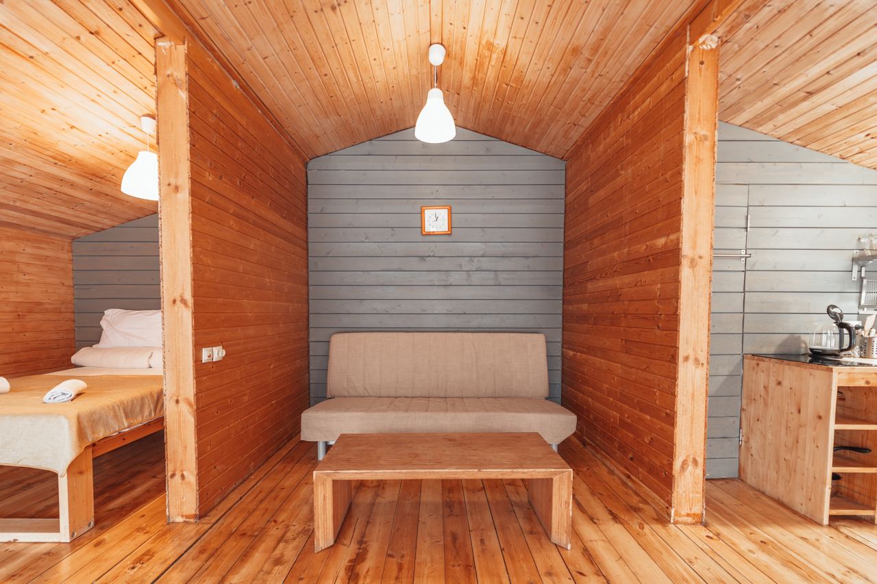 Четырехместный дом для семьи или компании друзей. Большая двуспальная кровать, зона гостиной с диваном, кухонная зона с электрической плитой, холодильником и набором посуды, ванная комната с душем и набором косметики. Возможна установка дополнительных мест (раскладушка/матрас).