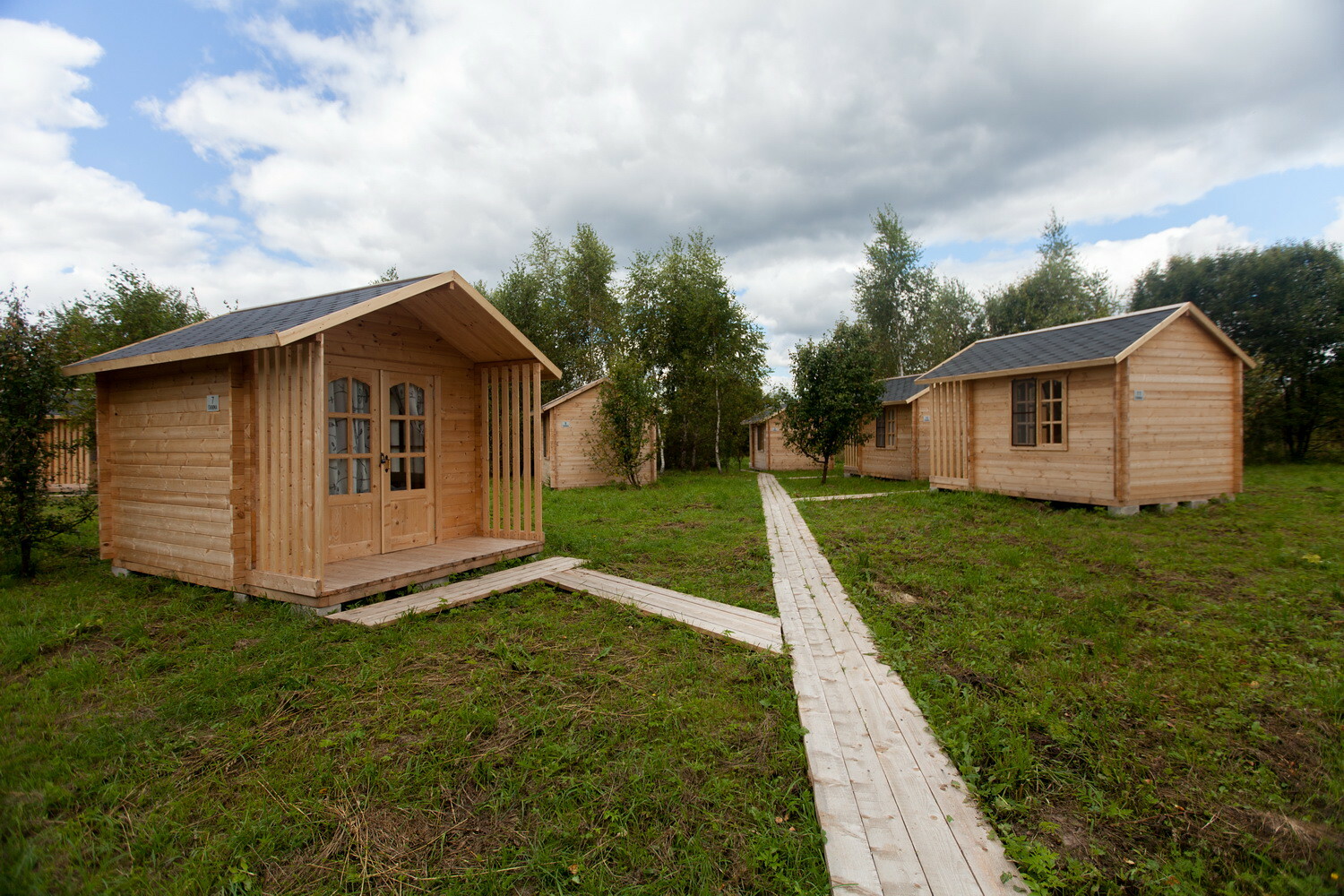 Летний двухместный домик в зоне кемпинга с одной двуспальной кроватью (возможно трехместное размещение – матрас). В каждом домике столик, комод. Рядом лес, пруд, кафе «Угра», велопрокат, домики «Клевер». Через поле, в 15 минутах ходьбы — арт-объект «Ротонда» Александра Бродского.
