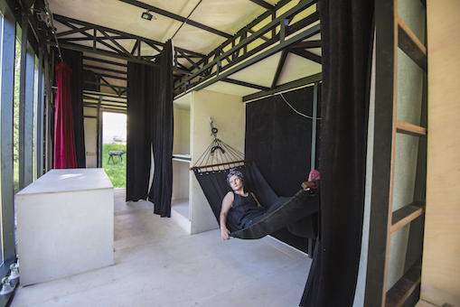 Юрий Муравицкий и Рустам Керимов: «С точки зрения архитектуры объект представляет собой одновременно и сцену, и полноценную жилую ячейку, построенную на основе модели автобуса ПАЗ 3205. С торца предусмотрен вход, один из продольных фасадов украшен витражным остеклением, противоположный фасад глухой, вдоль него в интерьере располагаются все функциональные помещения. С помощью системы тканей и занавесов, специального освещения жилой модуль в считанные секунды становится сценой для игры актеров и может быть трансформирован обратно в жилой дом».