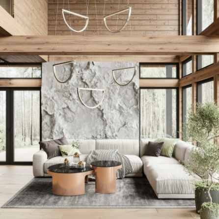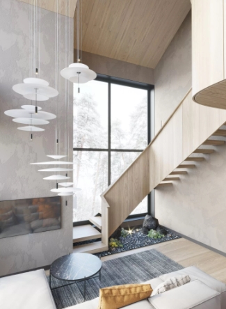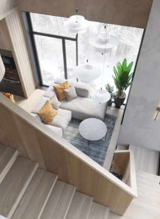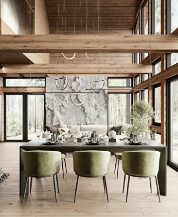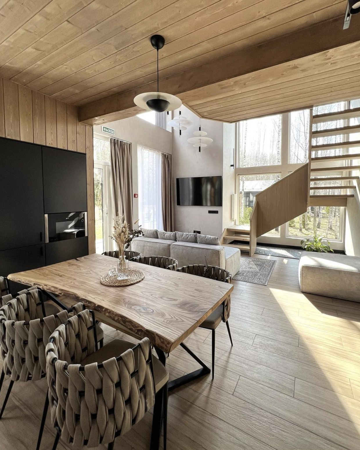 На территории эко-отеля расположено 3 двухэтажных коттеджа площадью 130 кв.м, вместимость 10 человек. Внутри продумана каждая деталь интерьера. Благодаря панорамным окнам пространство наполняется солнечным светом и теплом.