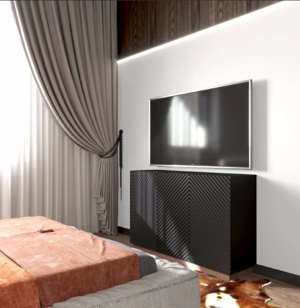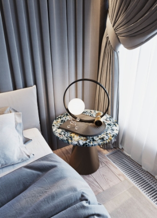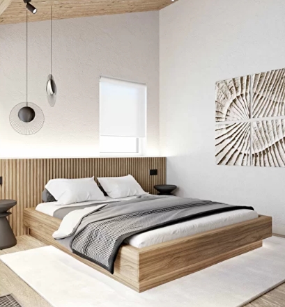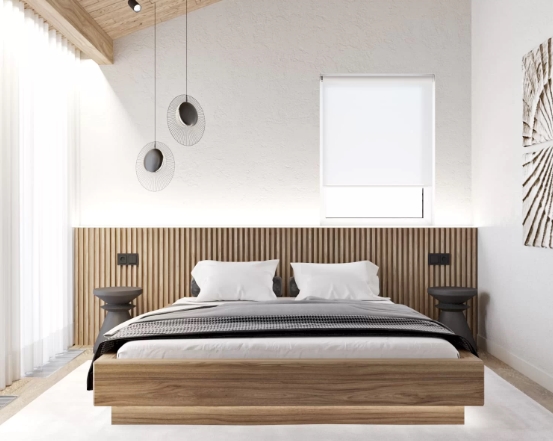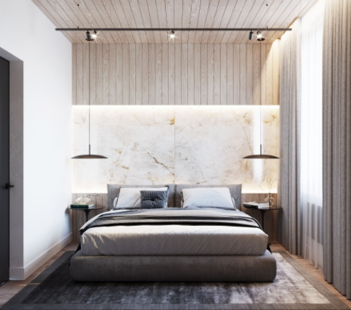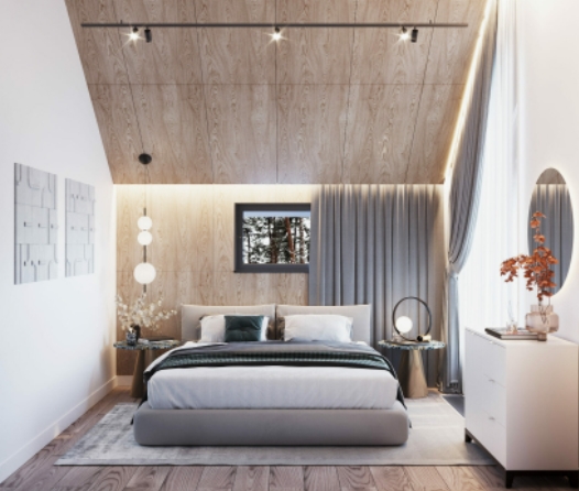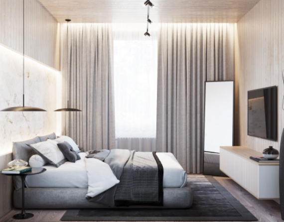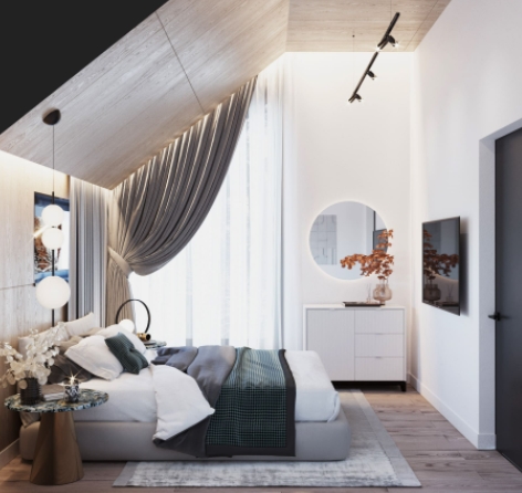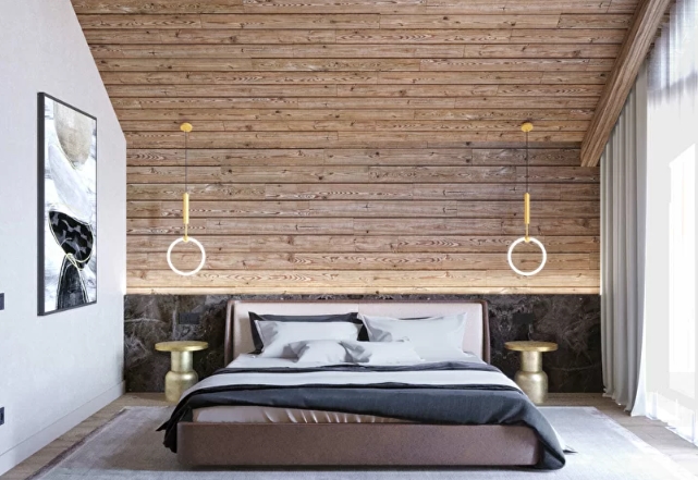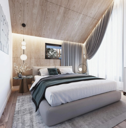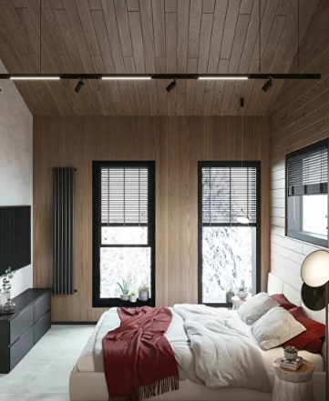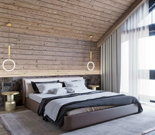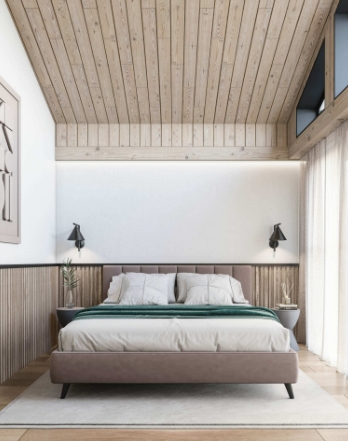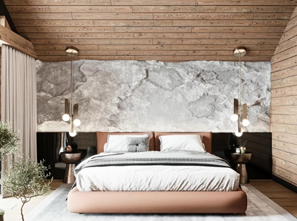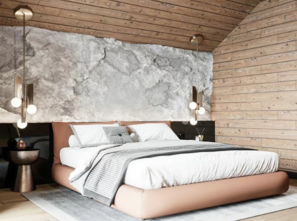 Интерьер спален, их 4-ре, выполнен в теплых оттенках для умиротворенного отдыха. В каждой установлена кровать king-size с удобным матрасом, мягкими подушками и постельным бельем из натуральных материалов для качественного сна.