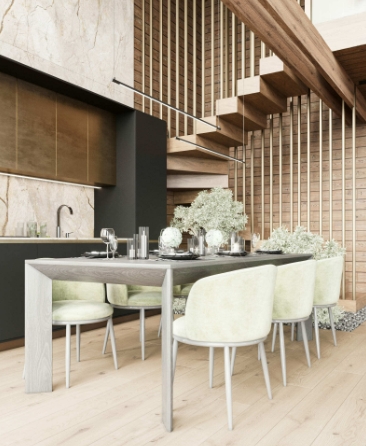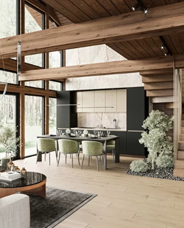 Гостиная располагает обеденной зоной и кухней, оснащенной современной техникой, включая кофемашину.