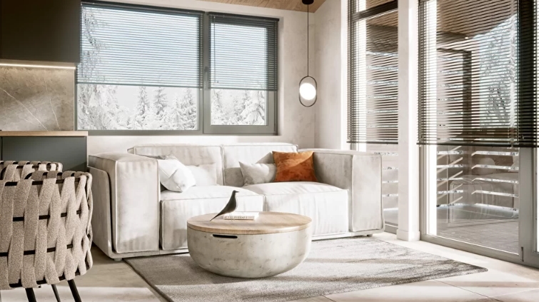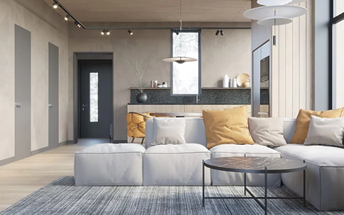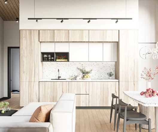 Интерьер главной зоны выполнен в теплых натуральных оттенках. Уютная гостиная располагает зонами приема и приготовления пищи, оборудованными необходимой техникой. В мягкой зоне установлен современный led-телевизор с большой диагональю.