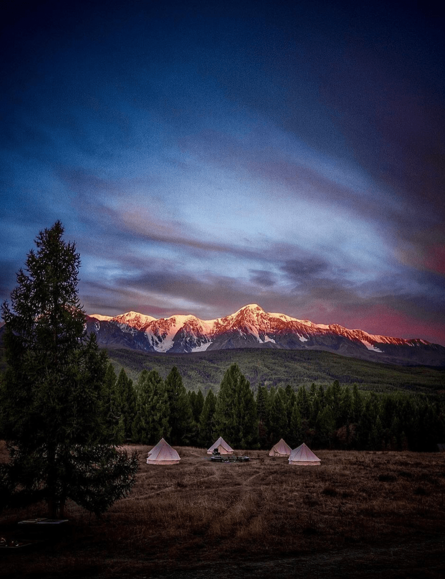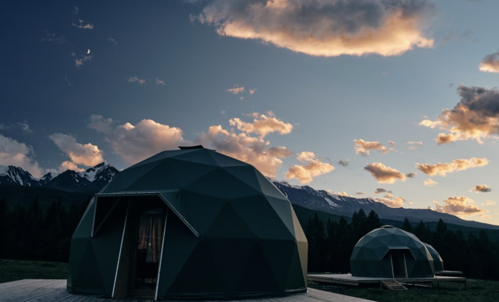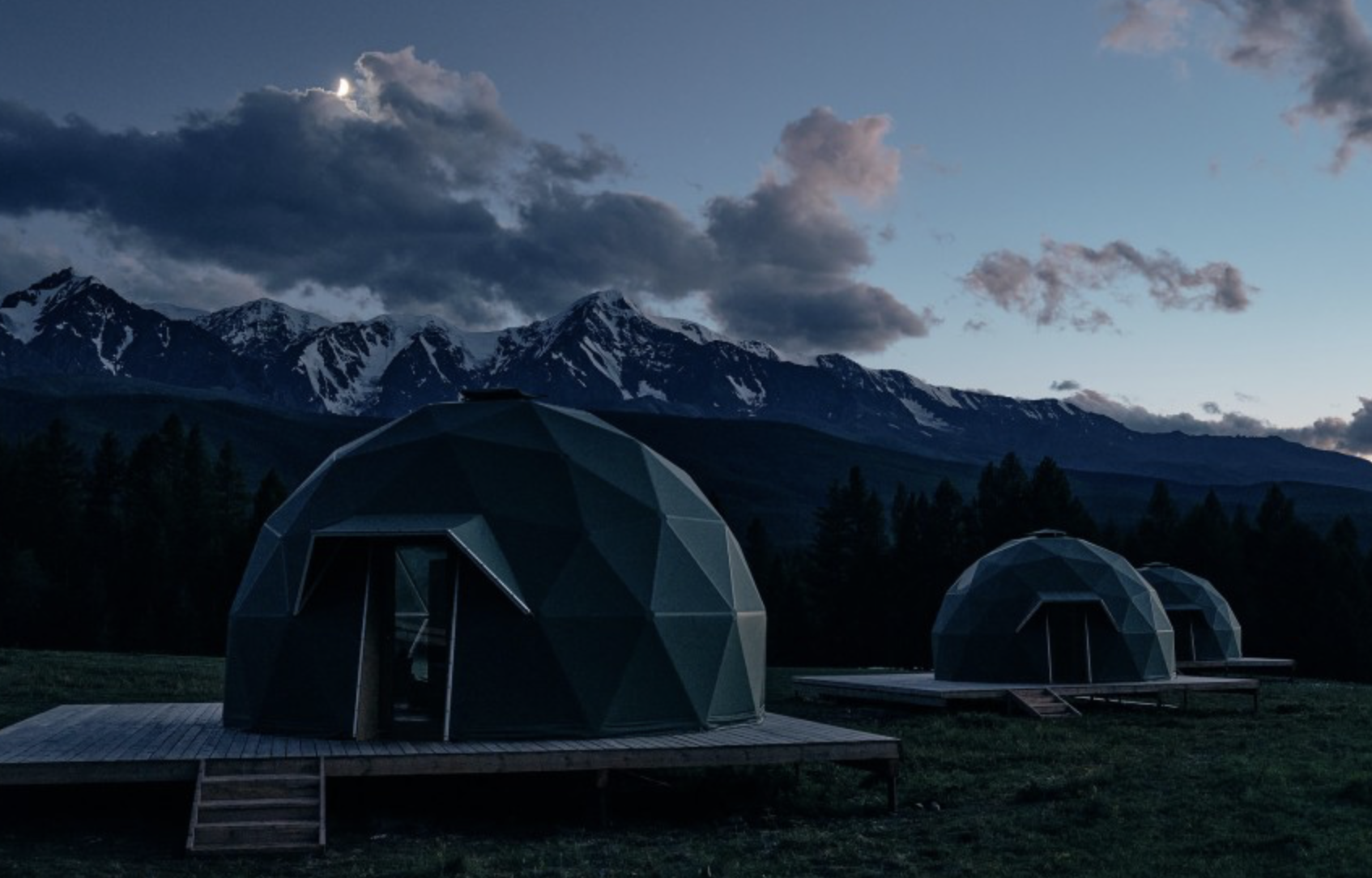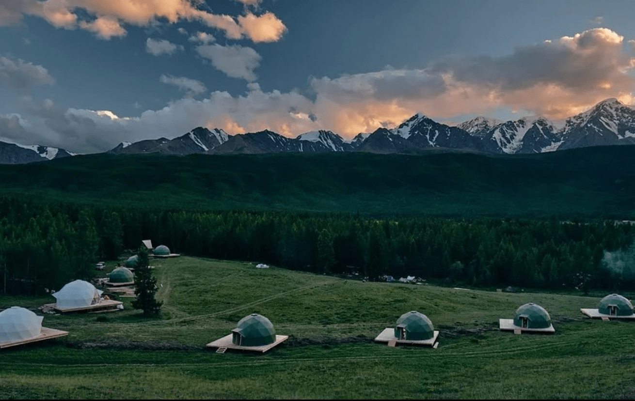 Купольная деревня расположилась на живописной поляне в Курайской степи на берегу реки Актру с видом на снежные вершины Северо-Чуйского хребта.