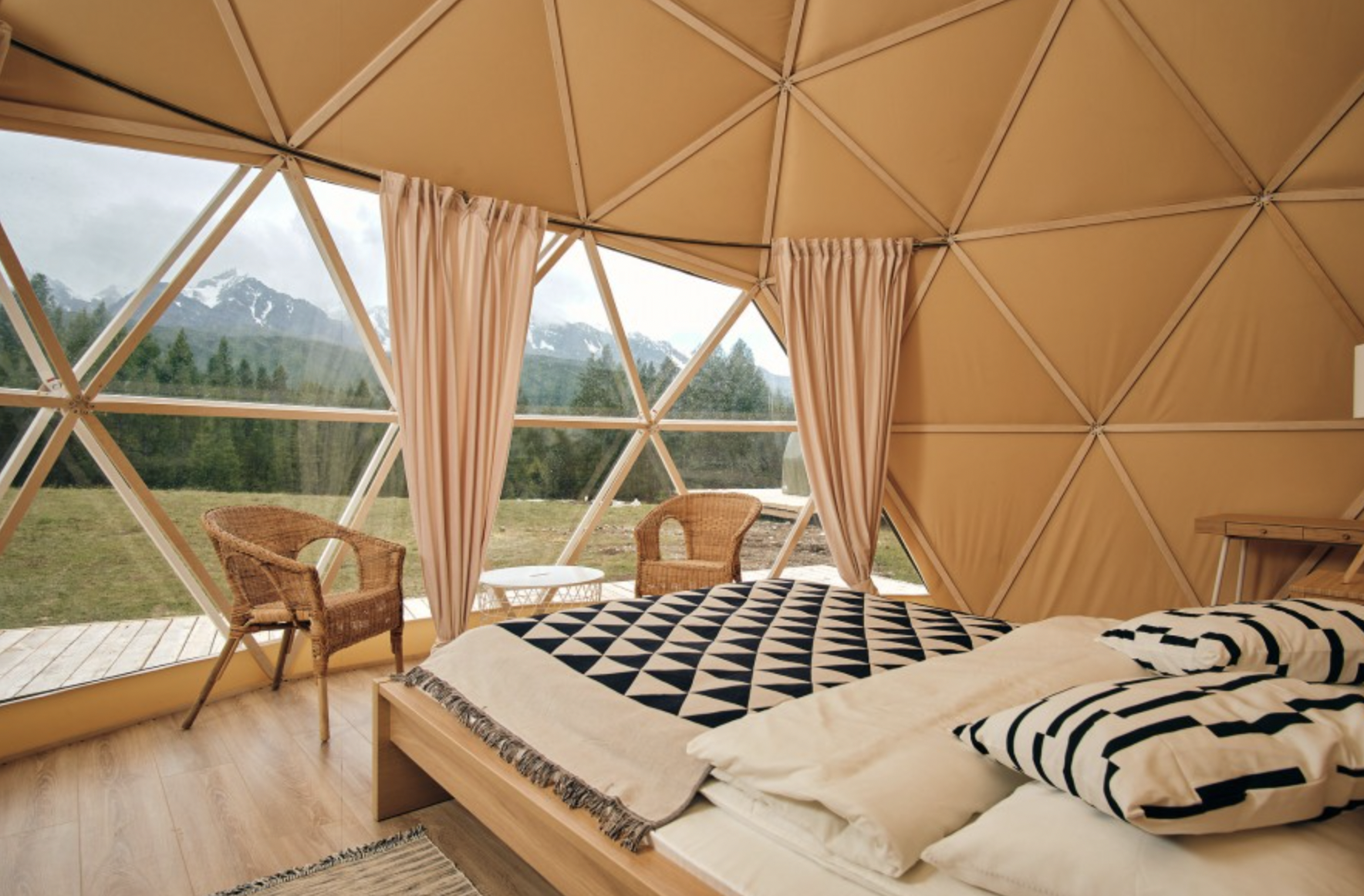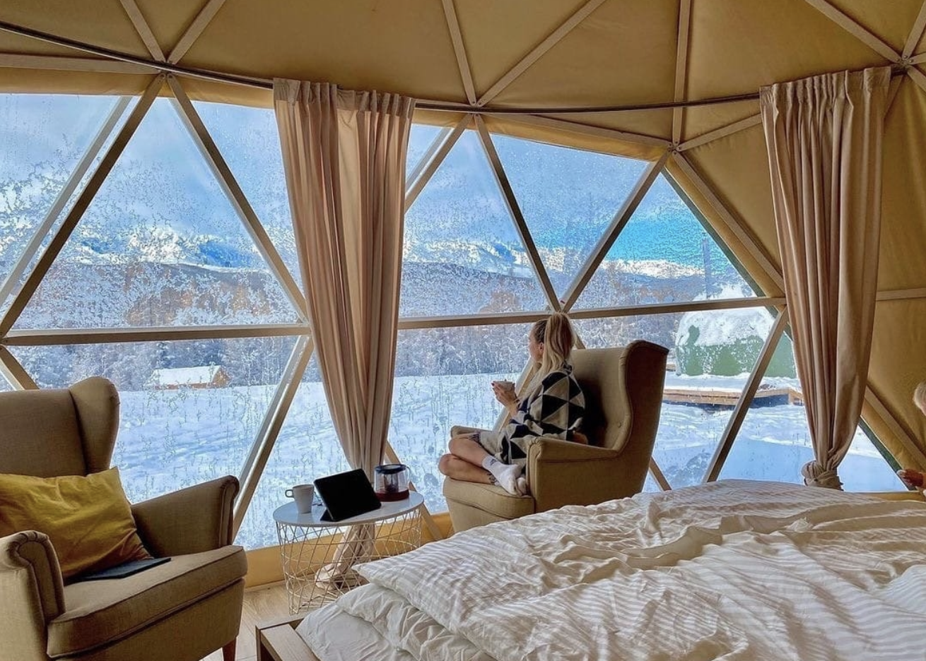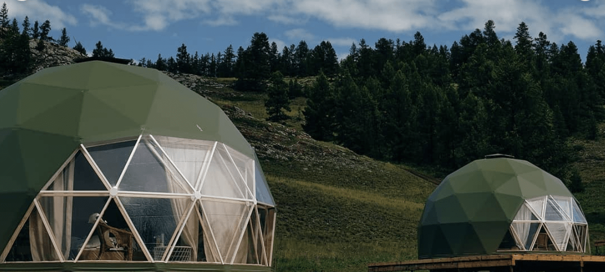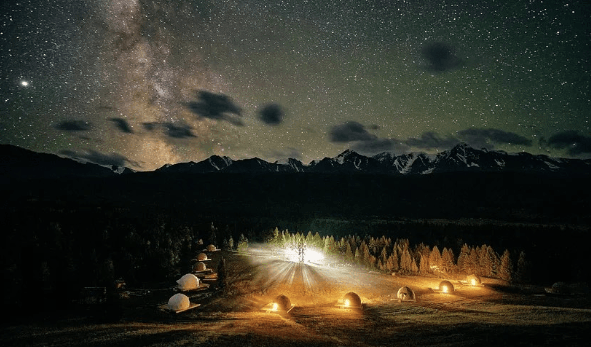 Купольная деревня расположилась на живописной поляне в Курайской степи на берегу реки Актру с видом на снежные вершины Северо-Чуйского хребта.