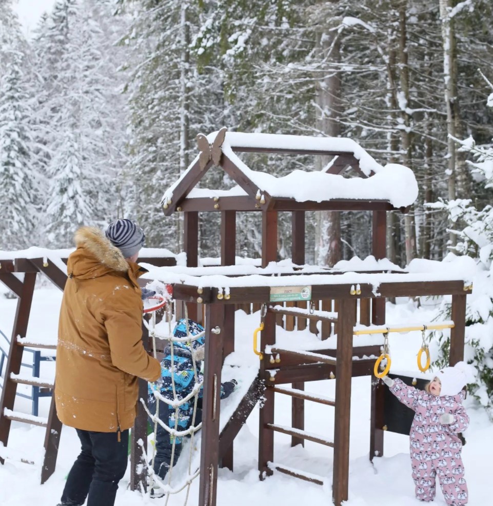 Ну а для тех кто приезжает с детками на территории коттеджного посёлка есть детская площадка, где детки постарше могут гулять без присмотра взрослых, так как посёлок полностью охраняемый и территория закрыта для посторонних.