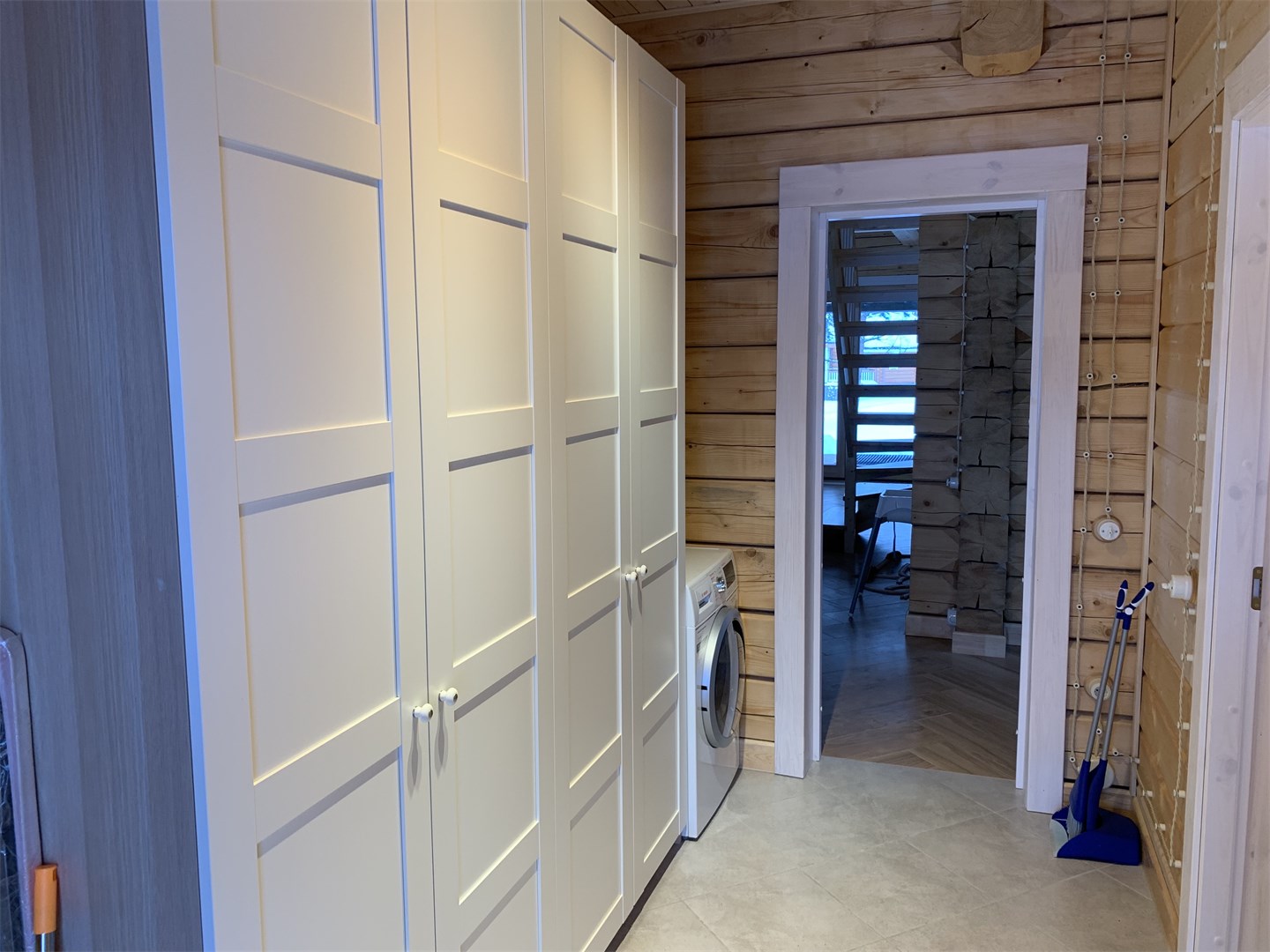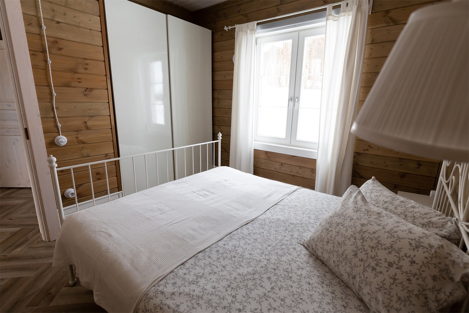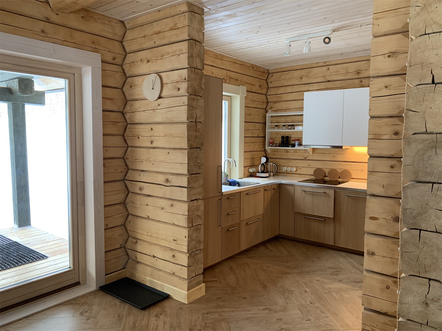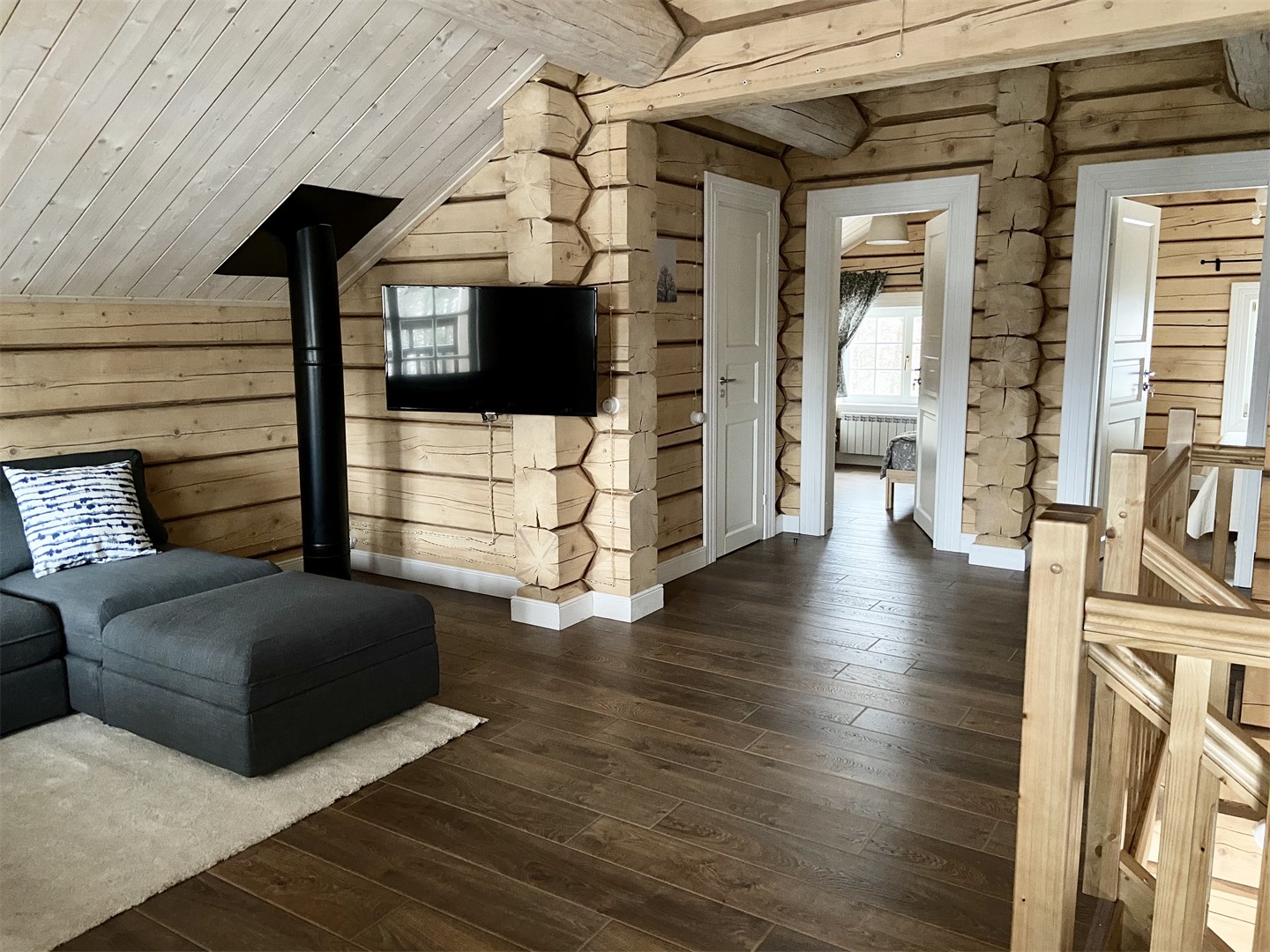 2 этажа с высокими потолками на первом этаже из экологически чистого цельного бревна, с использованием технологии норвежский лафет. Дом включает в себя полностью оборудованную кухню с электрической плитой на 4 конфорки, духовкой, посудомоечной машиной, микроволновой печью, холодильником и стиральной машиной с функцией сушки. В наличии есть вся необходимая посуда - тарелки, стаканы, бокалы, фужеры, сковородки, кастрюли, столовые приборы. Так же имеется миксер, электрический чайник, мультиварка. Обеденный стол на 8 человек. В гостиной комфортный диван, камин на дровах, телевизор с плоским экраном и подключенным онлайн ТВ, высокоскоростной интернет Wi-Fi по выделенной оптоволоконной линии.