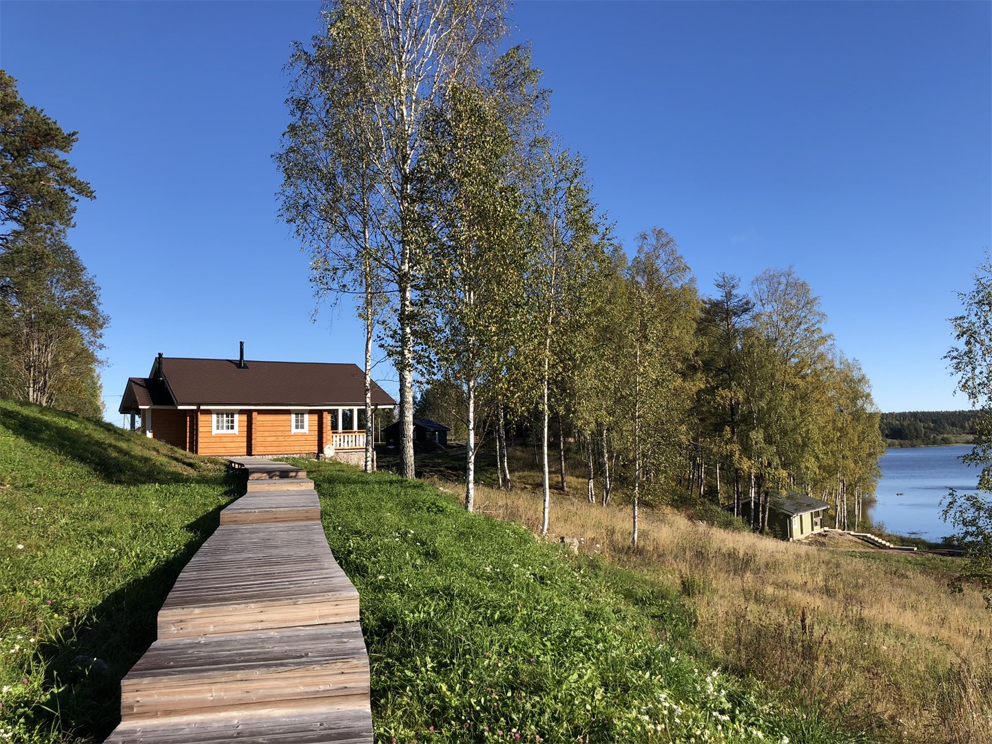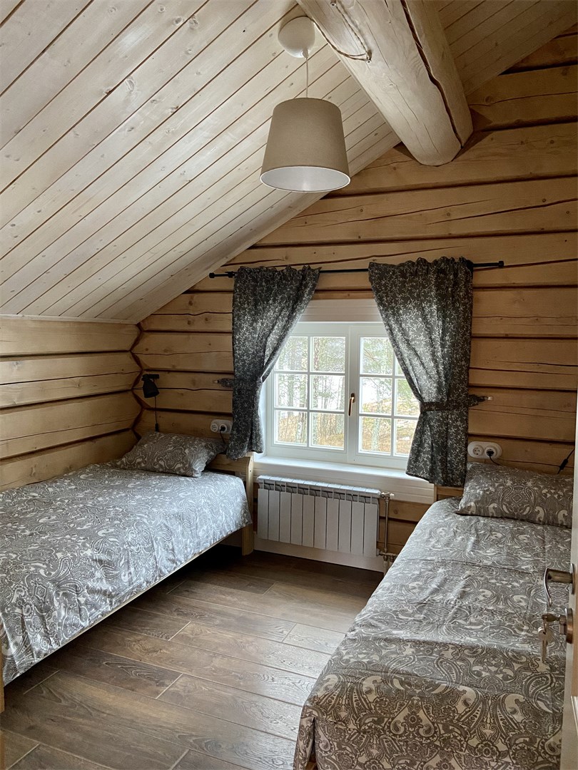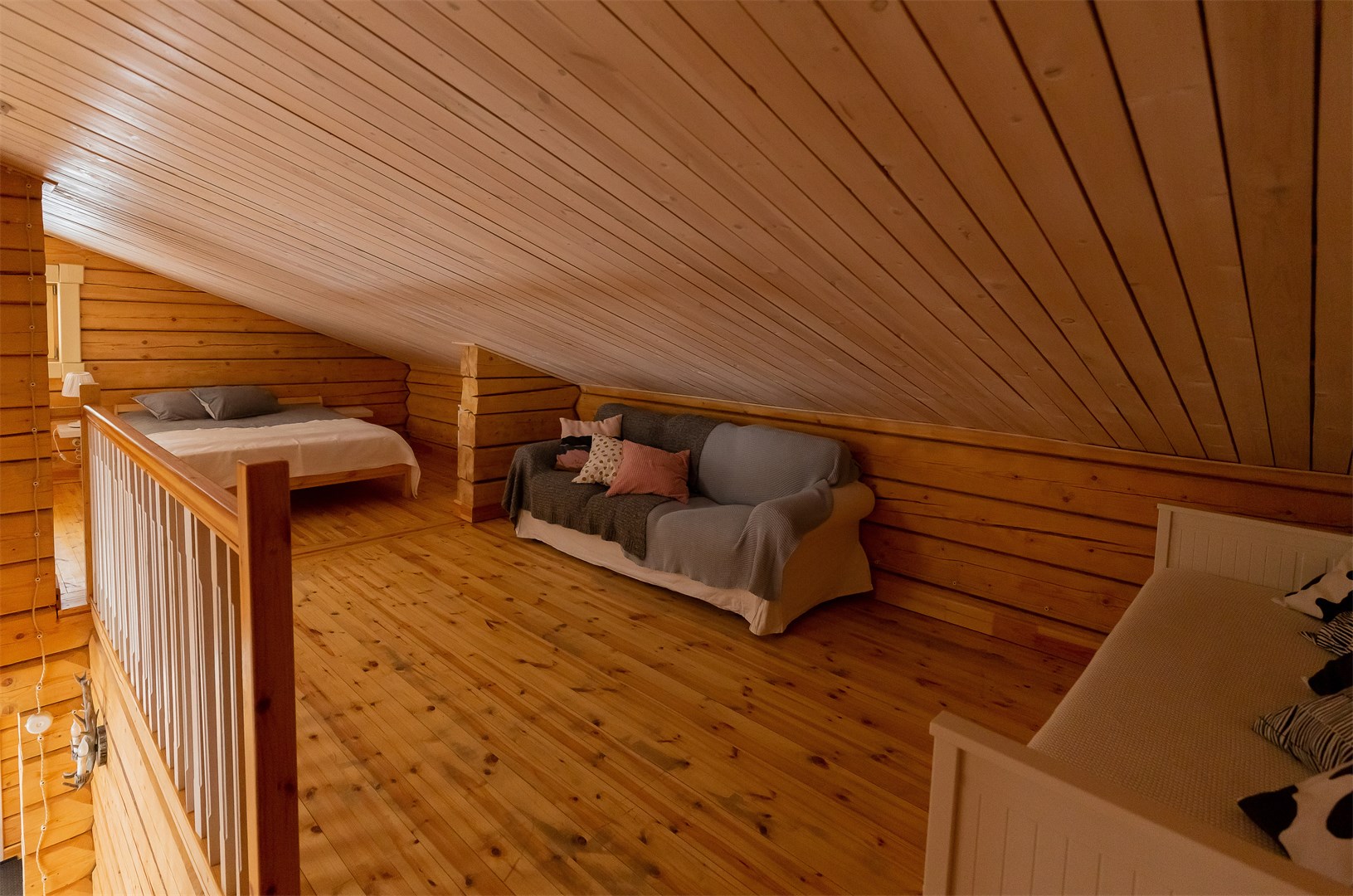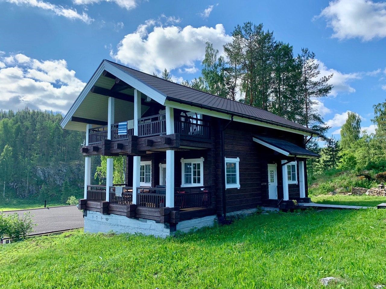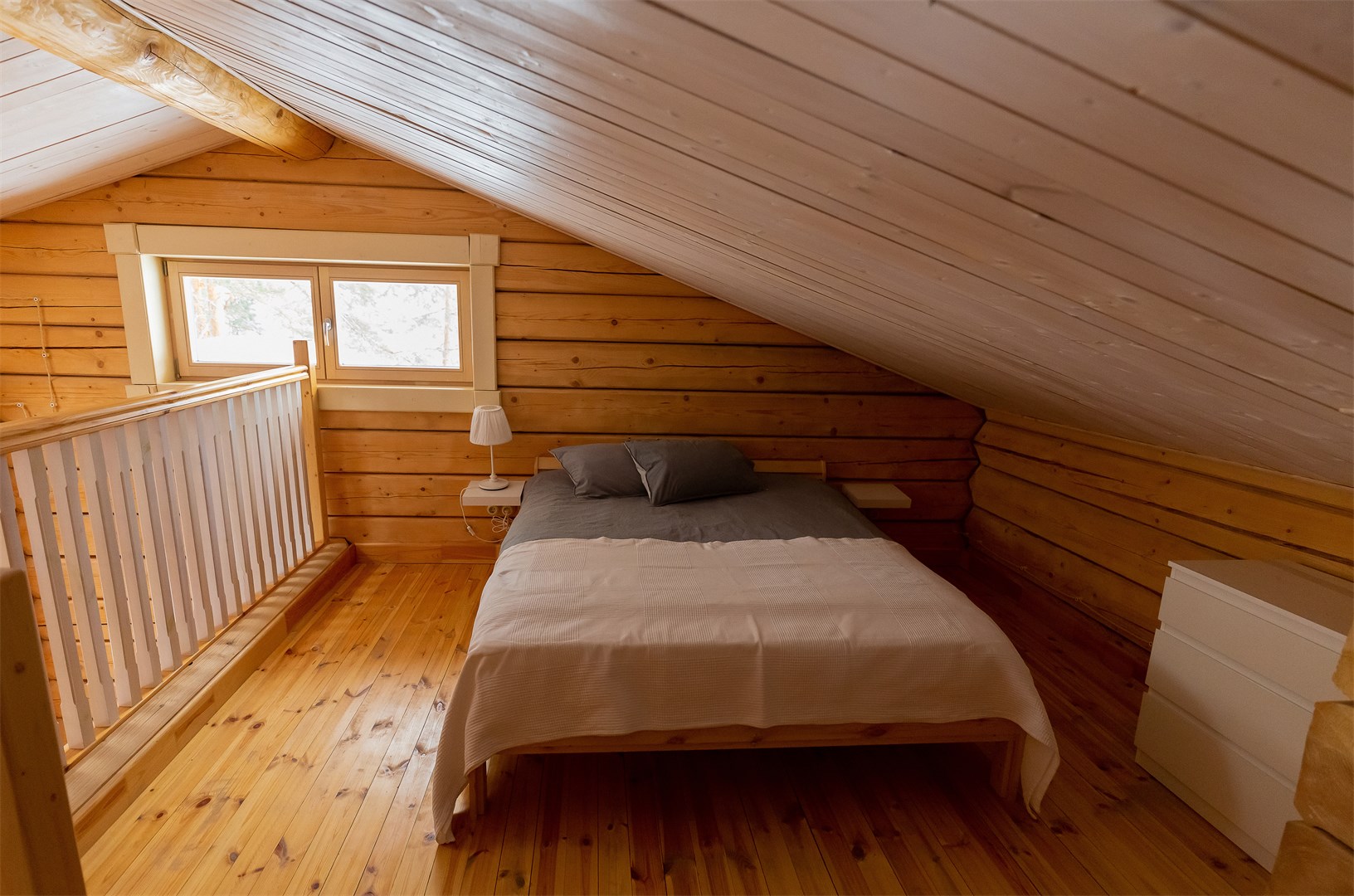 Дом для отдыха с двумя отдельными спальнями и одной открытой спальней на втором этаже, расположенный на скале берега Карельского озера, с видом на озеро и скалы готов принять гостей по системе 8+1 (8 человек могут расположиться в спальнях - две комнаты на первом этаже и спальня открытого типа на втором этаже с двумя двуспальными кроватями, 1 дополнительное место расположено в гостиной на диване со спальным местом).