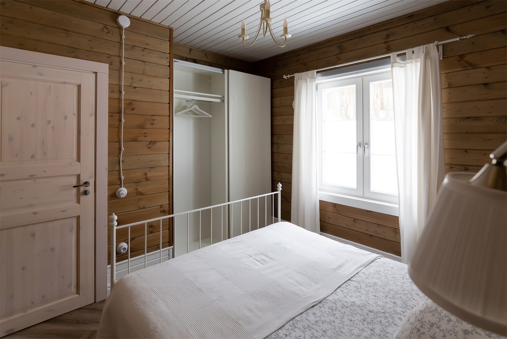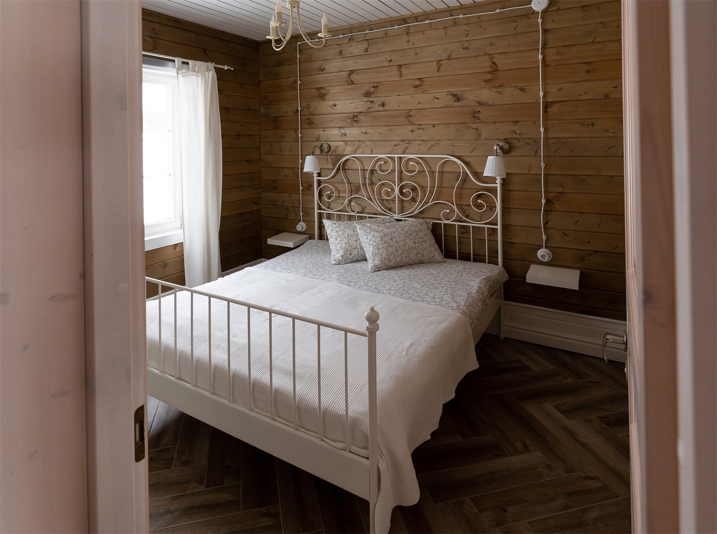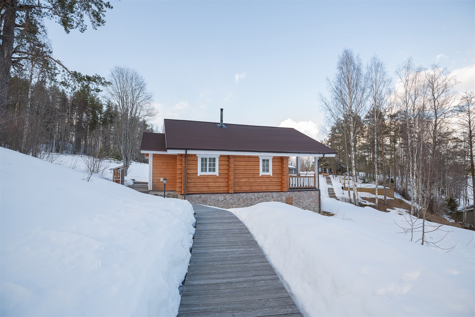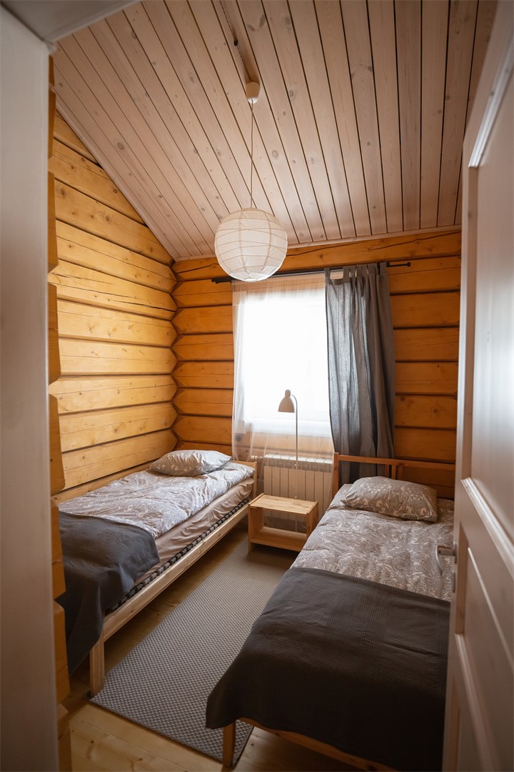 Дом для отдыха с двумя отдельными спальнями и одной открытой спальней на втором этаже, расположенный на скале берега Карельского озера, с видом на озеро и скалы готов принять гостей по системе 8+1 (8 человек могут расположиться в спальнях - две комнаты на первом этаже и спальня открытого типа на втором этаже с двумя двуспальными кроватями, 1 дополнительное место расположено в гостиной на диване со спальным местом).