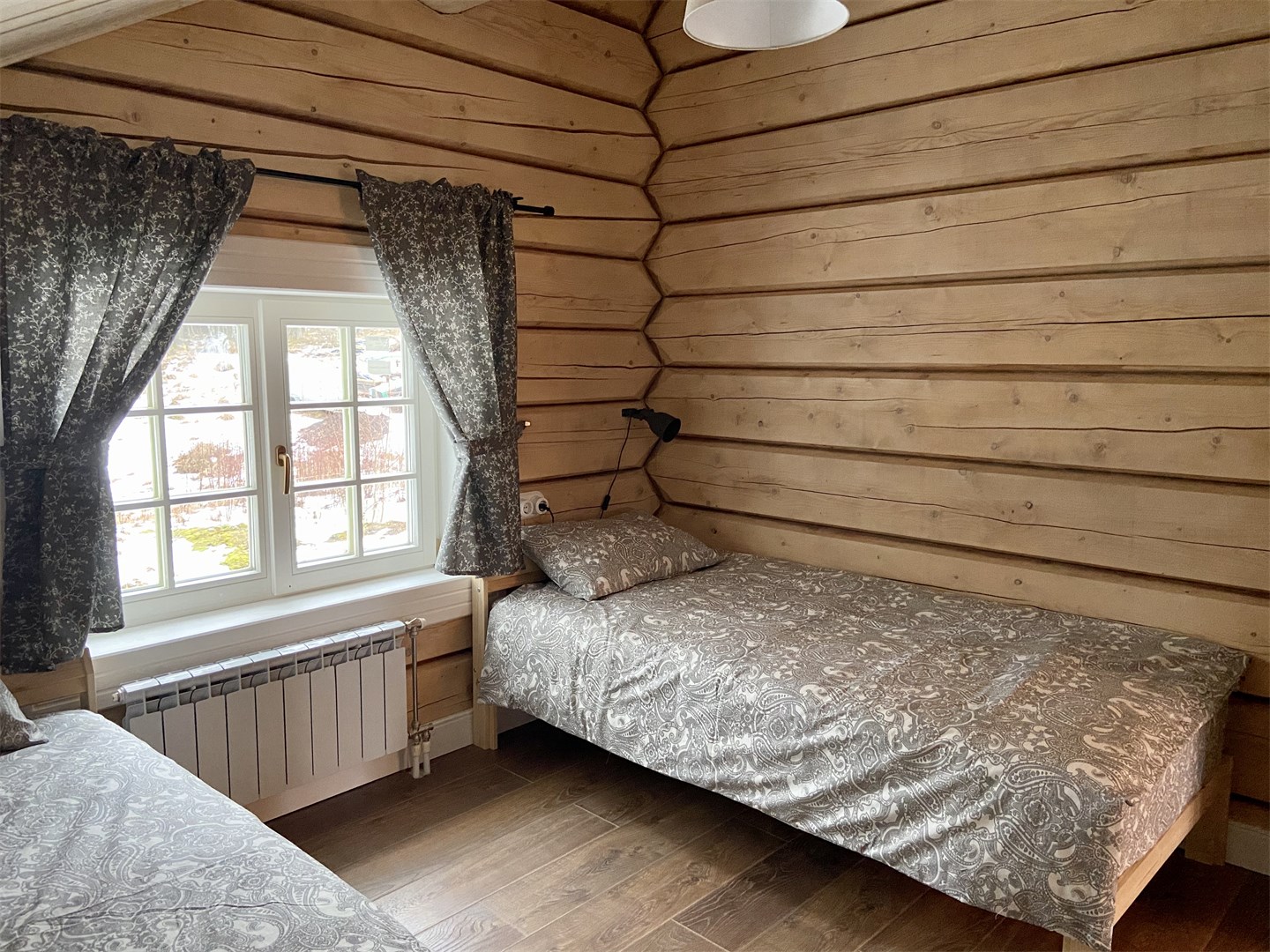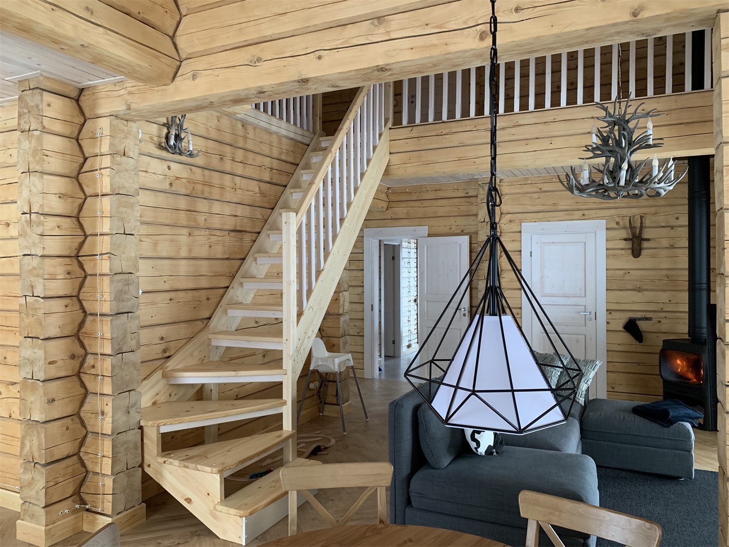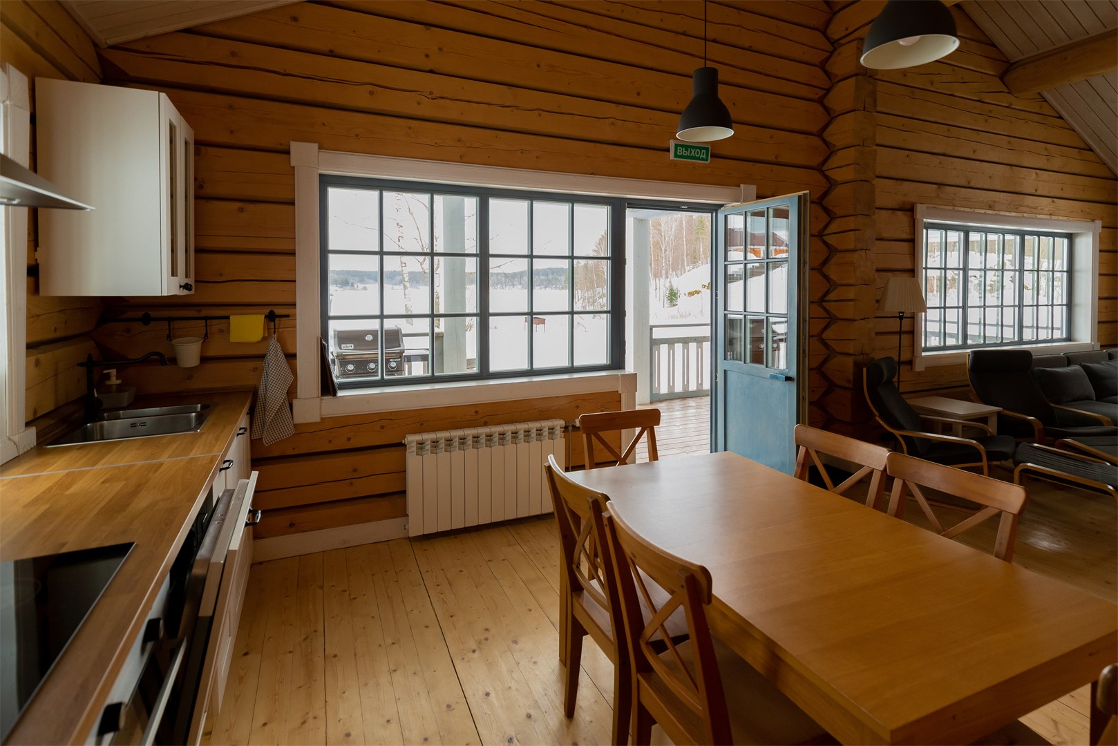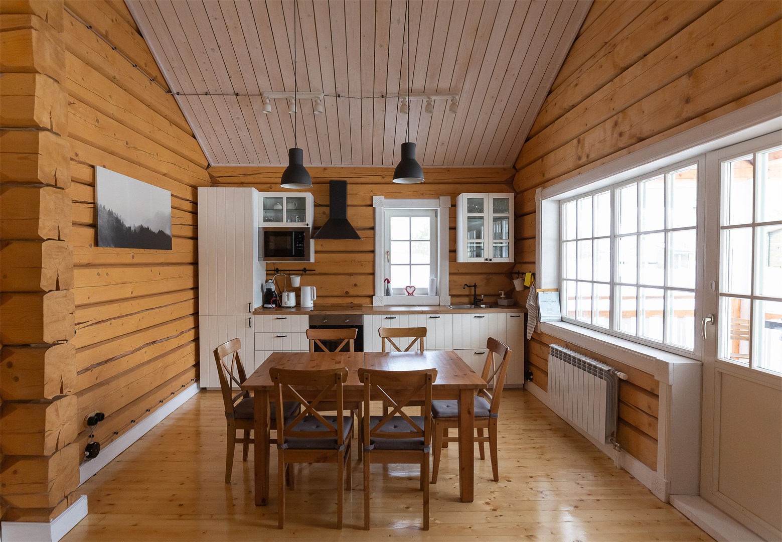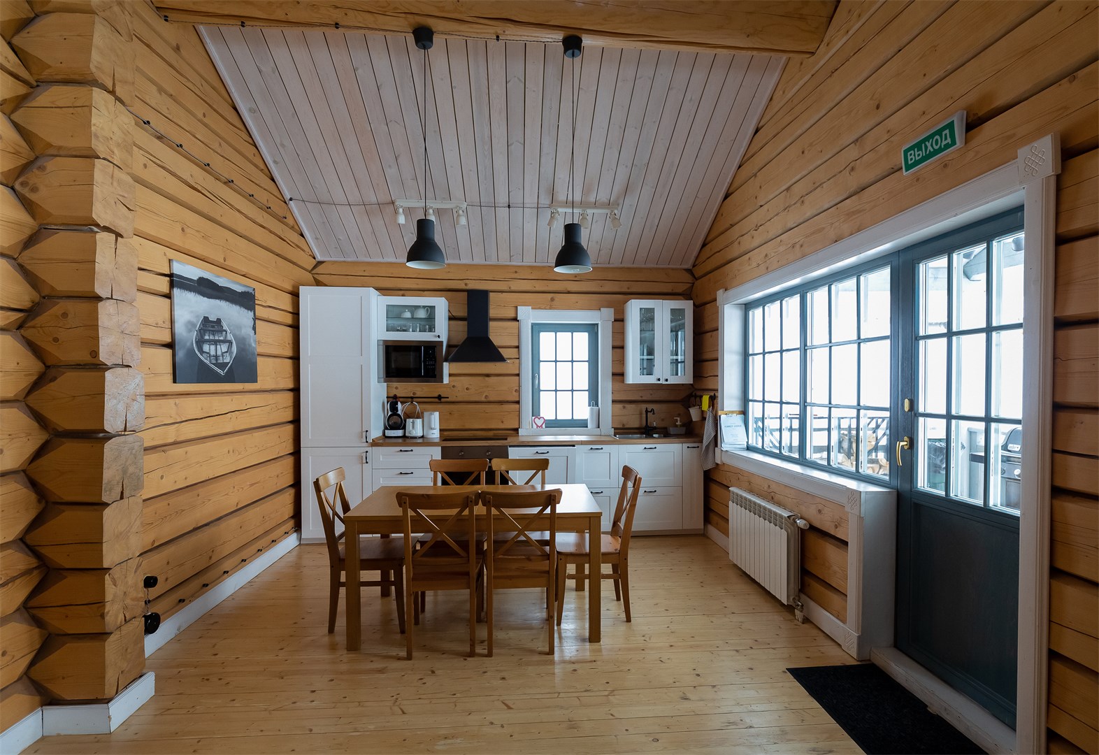 2 этажа с высокими потолками из экологически чистого цельного бревна, с использованием технологии норвежский лафет. Дом включает в себя полностью оборудованную кухню с электрической плитой на 4 конфорки, духовкой, посудомоечной машиной, микроволновой печью, холодильником. В наличии есть вся необходимая посуда - тарелки, стаканы, бокалы, фужеры, сковородки, кастрюли, столовые приборы. Так же имеется миксер, электрический чайник, мультиварка. Обеденный стол на 6-9 человек напротив камина на дровах. В гостиной комфортный диван и мягкое кресло, с 1 дополнительным полноценным спальным местом, телевизор с плоским экраном и подключенным Онлайн ТВ, высокоскоростной интернет Wi-Fi по выделенной оптоволоконной линии.