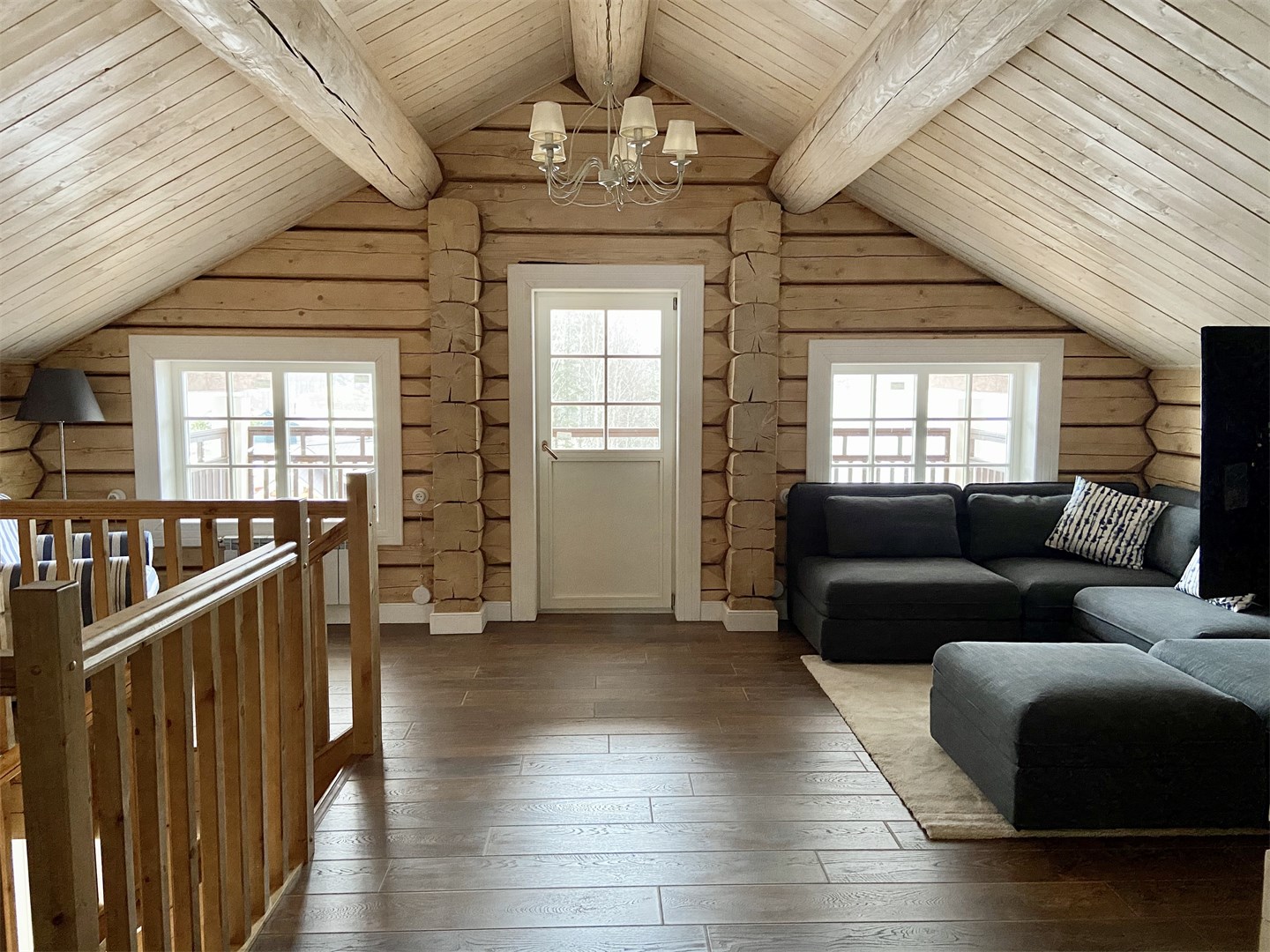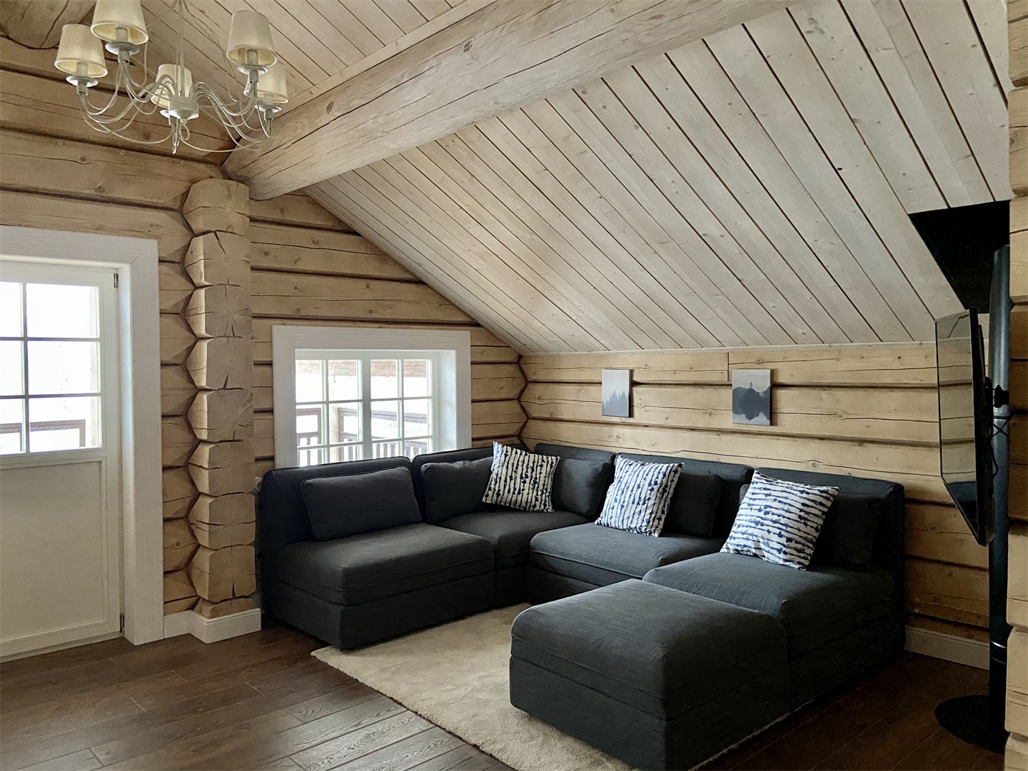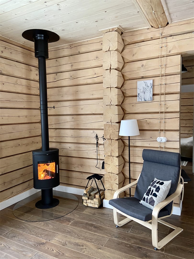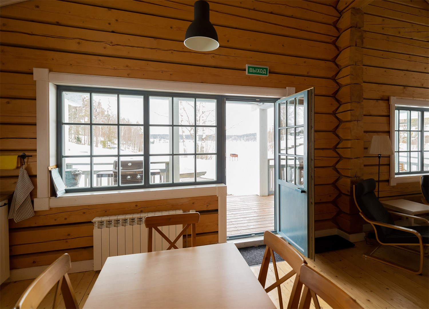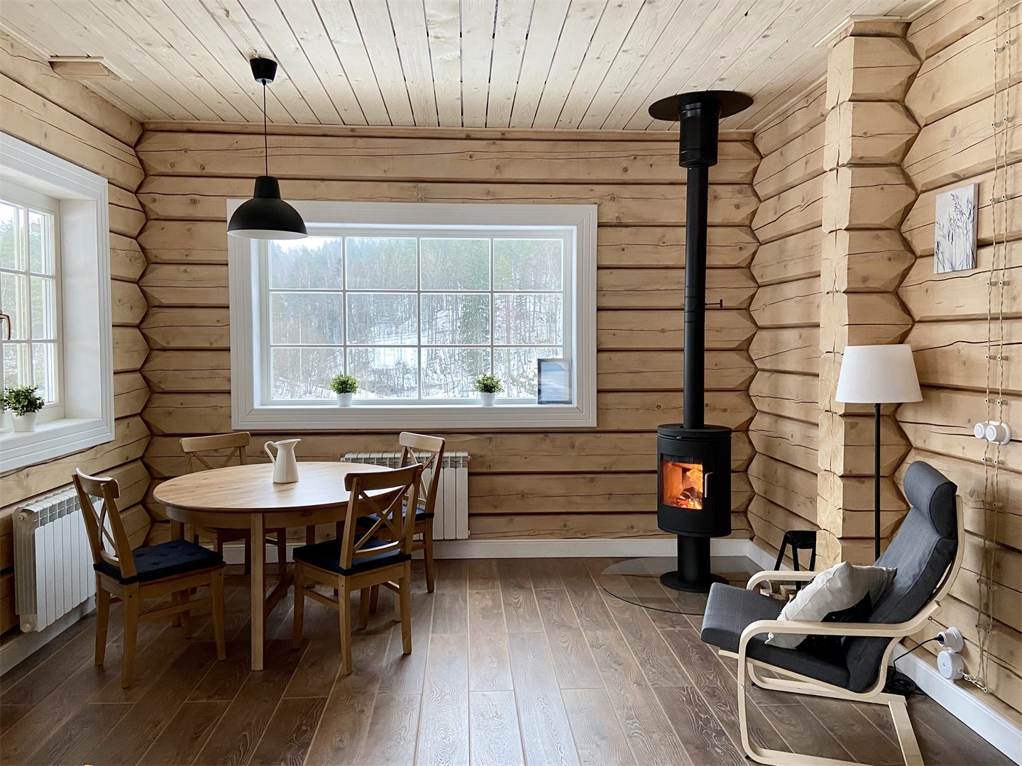 2 этажа с высокими потолками из экологически чистого цельного бревна, с использованием технологии норвежский лафет. Дом включает в себя полностью оборудованную кухню с электрической плитой на 4 конфорки, духовкой, посудомоечной машиной, микроволновой печью, холодильником. В наличии есть вся необходимая посуда - тарелки, стаканы, бокалы, фужеры, сковородки, кастрюли, столовые приборы. Так же имеется миксер, электрический чайник, мультиварка. Обеденный стол на 6-9 человек напротив камина на дровах. В гостиной комфортный диван и мягкое кресло, с 1 дополнительным полноценным спальным местом, телевизор с плоским экраном и подключенным Онлайн ТВ, высокоскоростной интернет Wi-Fi по выделенной оптоволоконной линии.