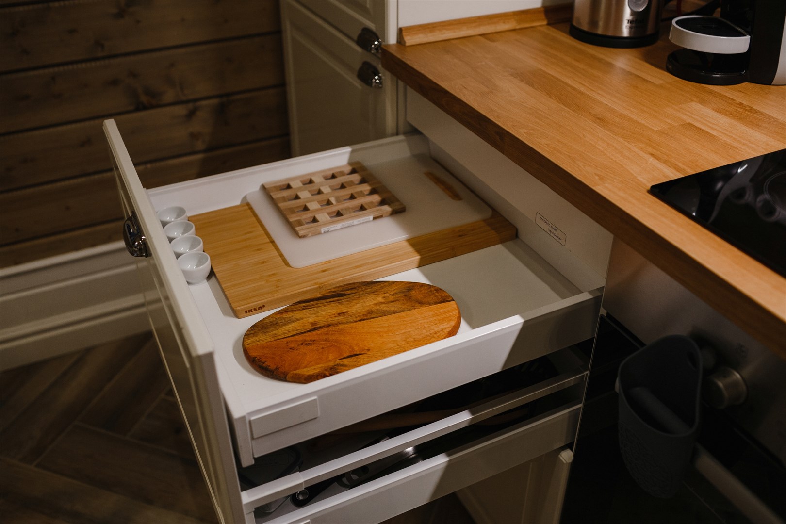1 этаж с высокими потолками, с использованием скандинавской каркасной технология строительства. Дом включает в себя полностью оборудованную кухню с электрической плитой на 4 конфорки, духовкой, посудомоечной машиной и холодильником. В наличии есть вся необходимая посуда - тарелки, стаканы, бокалы, фужеры, сковородки, кастрюли, столовые приборы. Так же имеется миксер, электрический чайник, мультиварка. Обеденный стол на 4 человека. В гостиной комфортный диван с 2 дополнительными полноценными спальными местами, камин на дровах, телевизор с плоским экраном и подключенным Онлайн ТВ, высокоскоростной интернет Wi-Fi по выделенной оптоволоконной линии.