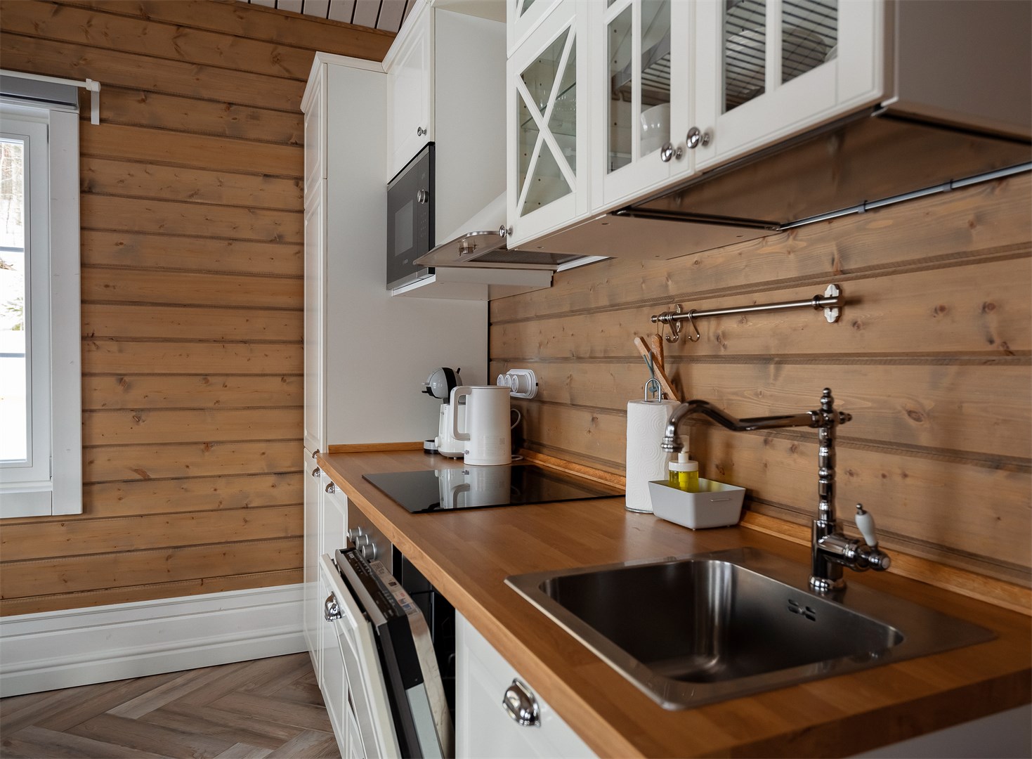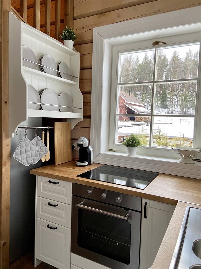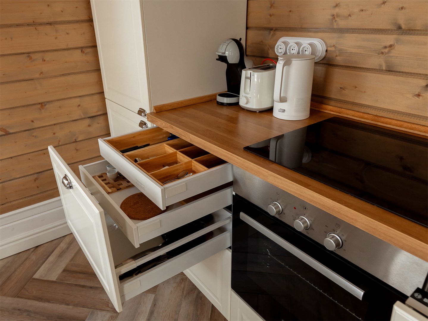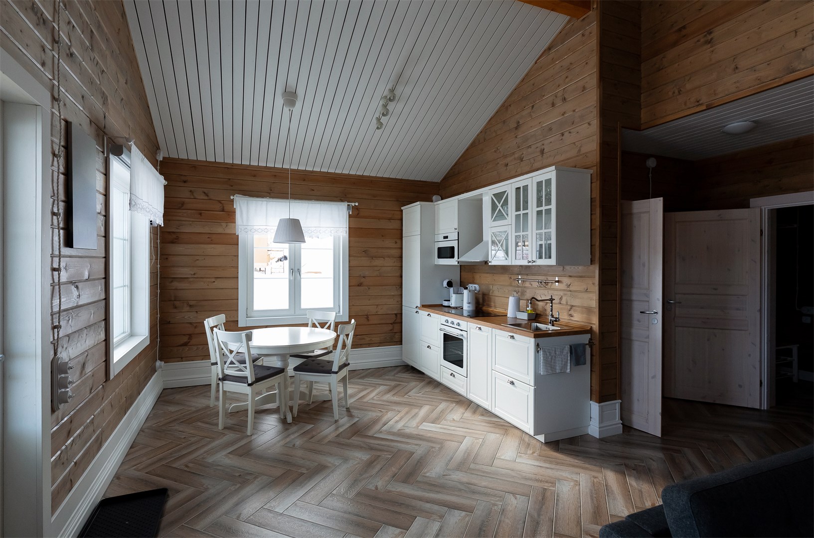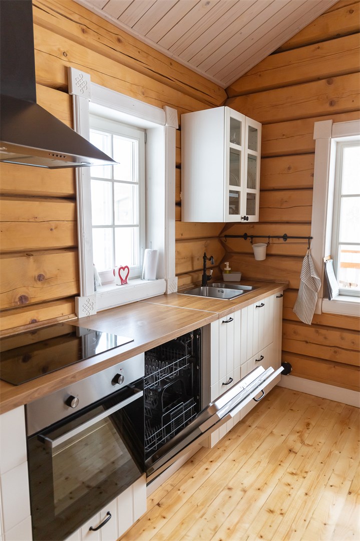 1 этаж с высокими потолками из экологически чистого цельного бревна, с использованием технологии норвежский лафет. Дом включает в себя полностью оборудованную кухню с электрической плитой на 4 конфорки, духовкой, посудомоечной машиной и холодильником. В наличии есть вся необходимая посуда - тарелки, стаканы, бокалы, фужеры, сковородки, кастрюли, столовые приборы. Так же имеется миксер, электрический чайник, мультиварка. Обеденный стол на 6 человек с возможностью увеличения.