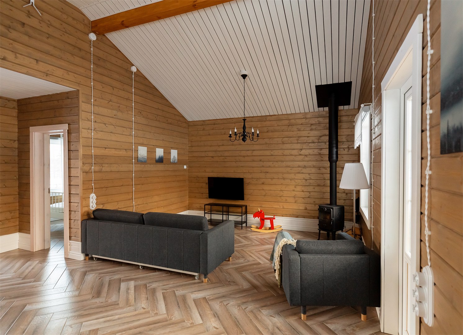 В гостиной комфортный диван с 2 дополнительными полноценными спальными местами, камин на дровах, телевизор с плоским экраном и подключенным Онлайн ТВ, высокоскоростной интернет Wi-Fi по выделенной оптоволоконной линии, а также два кресла-качалки.