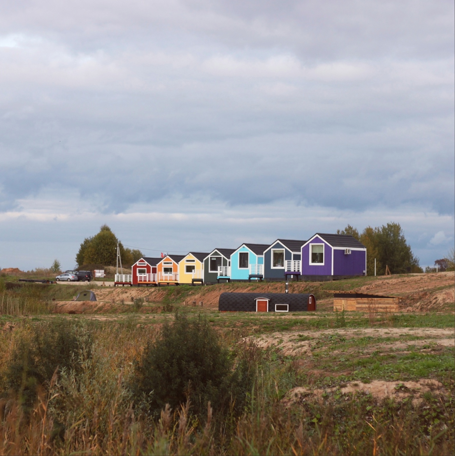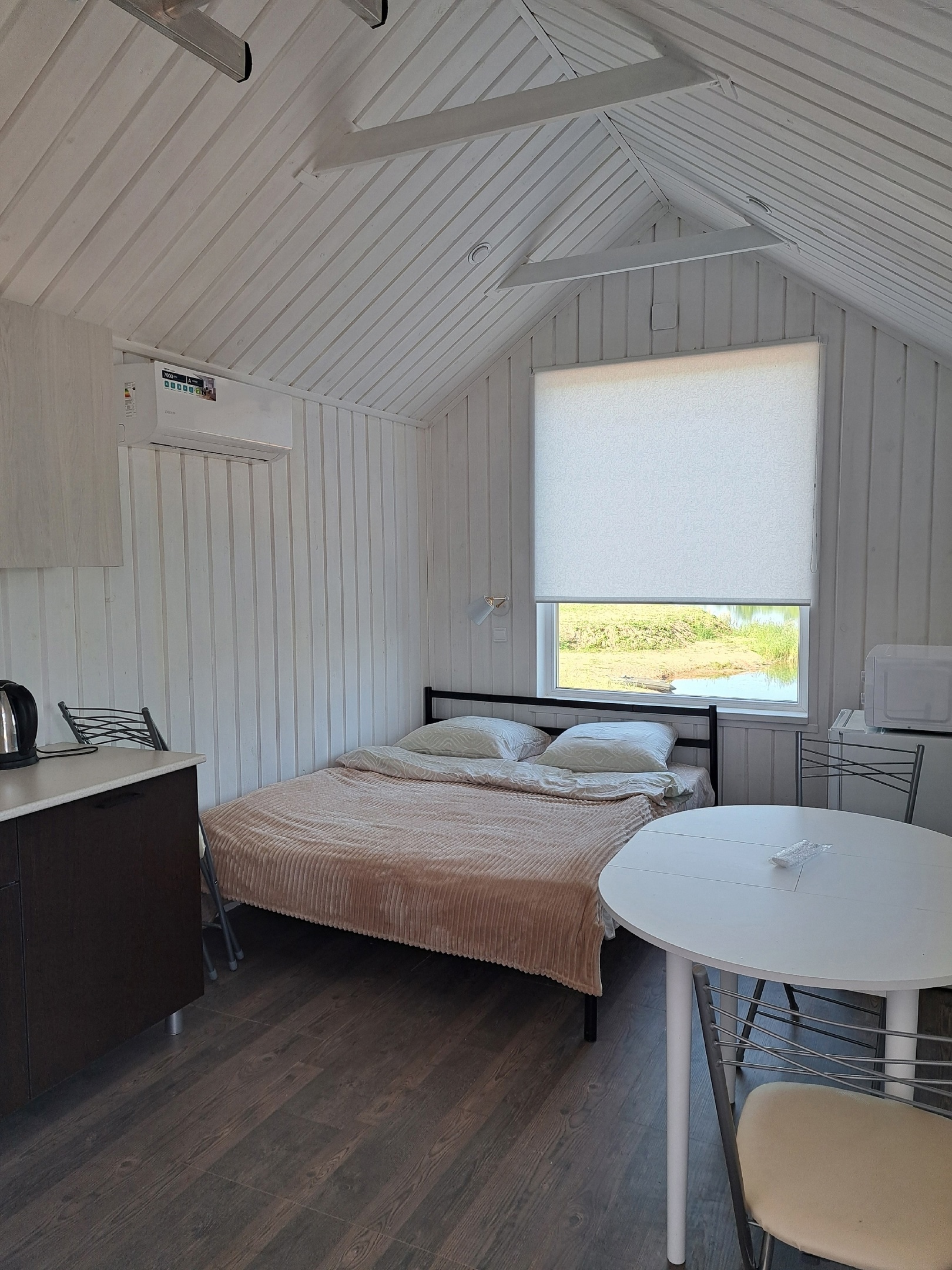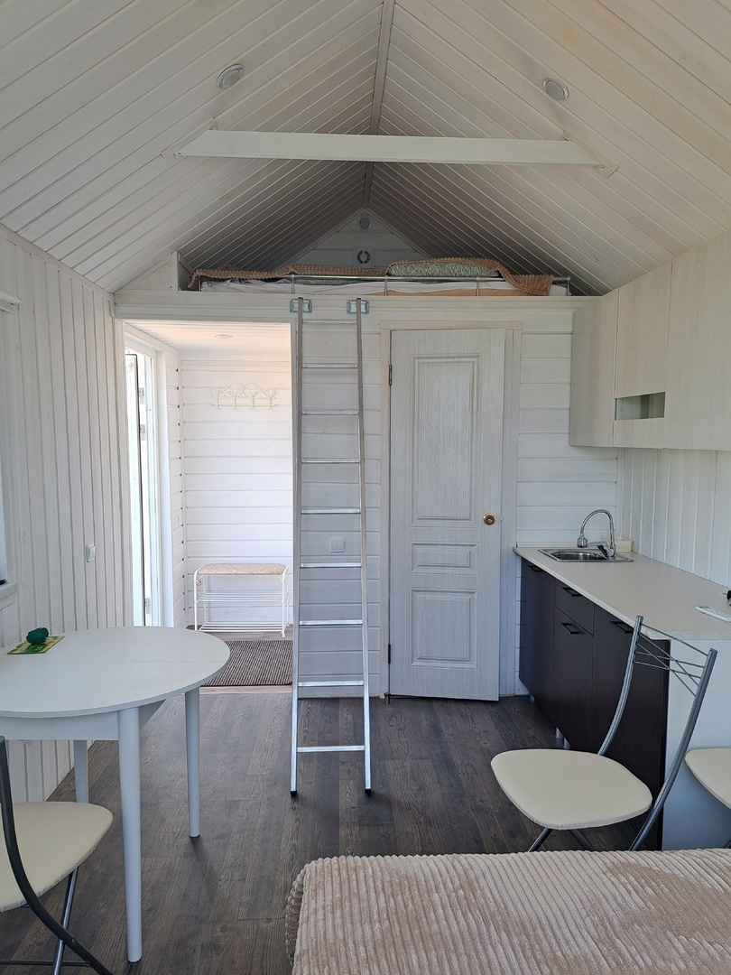 В домиках располагаются двухспальная кровать, обеденная зона, небольшая кухня и санузел с душевой.