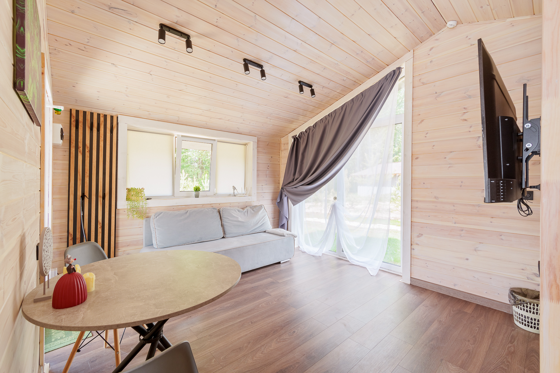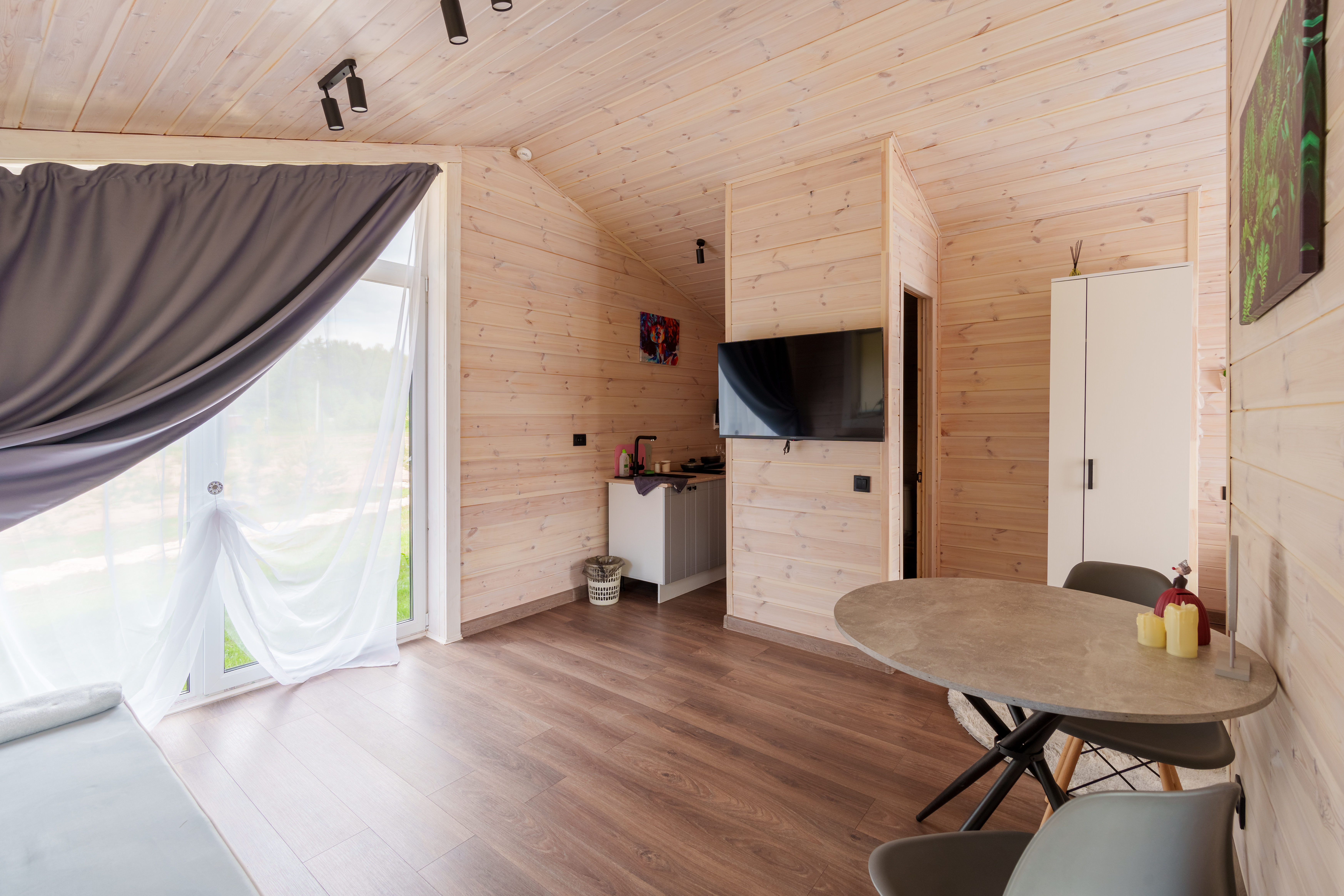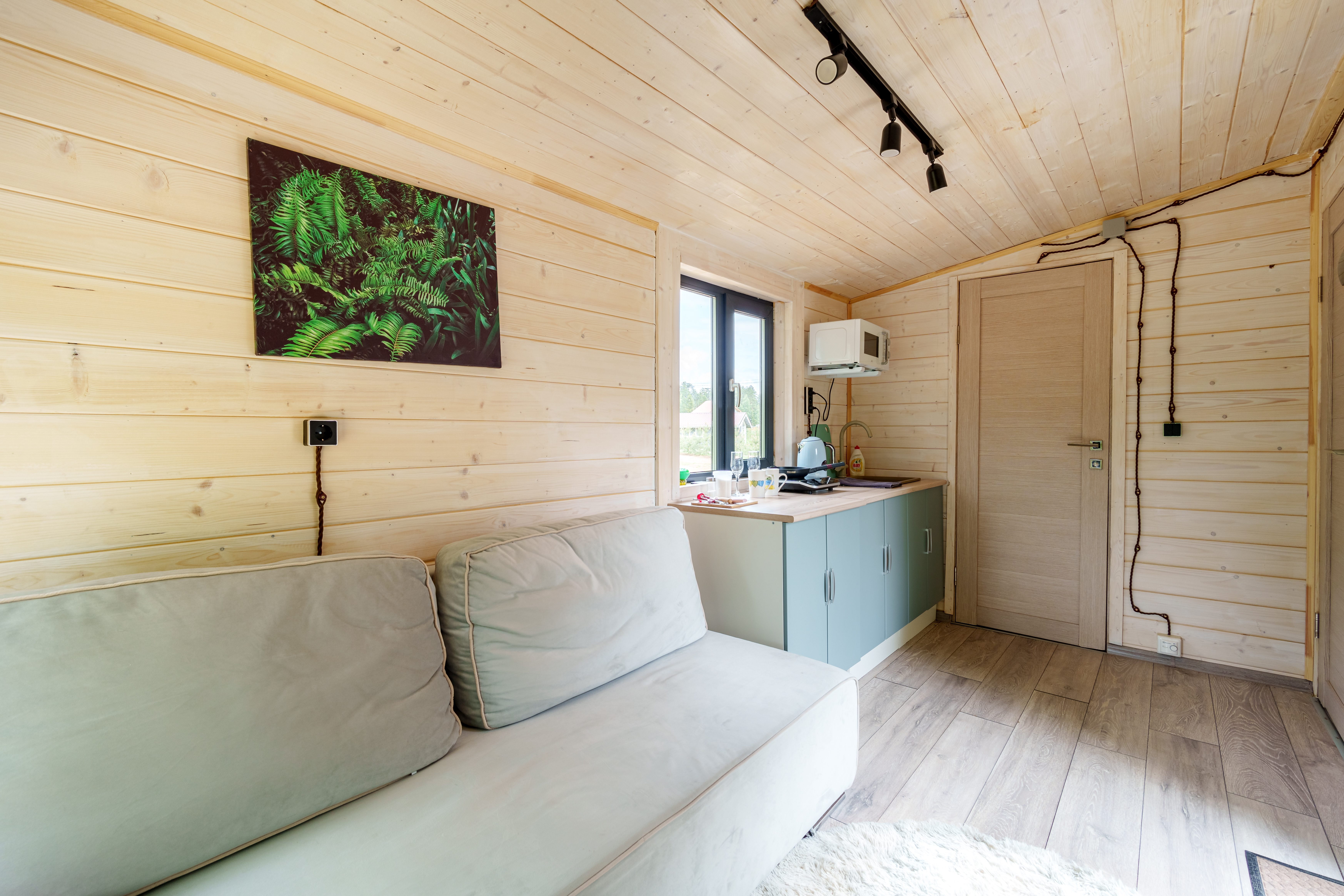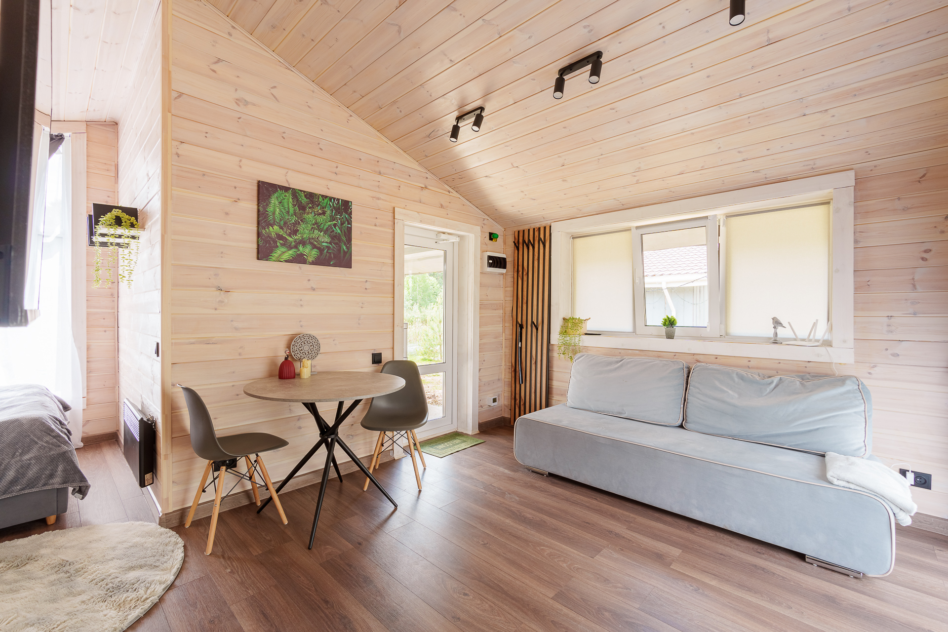 Одноэтажный модуль в стиле эко-минимализм представляет собой небольшую общую зону, ванную комнату, кухню и спальню, которые выдержаны в светлых, приятных оттенках и древесных фактурах.