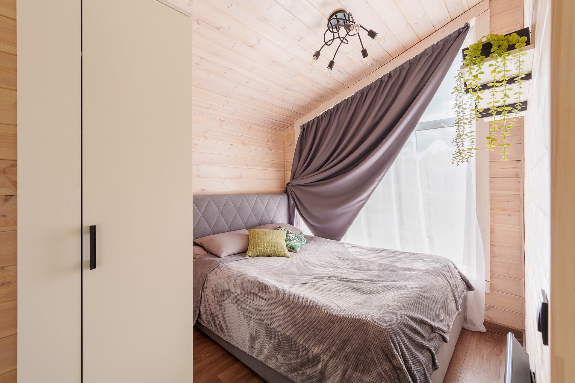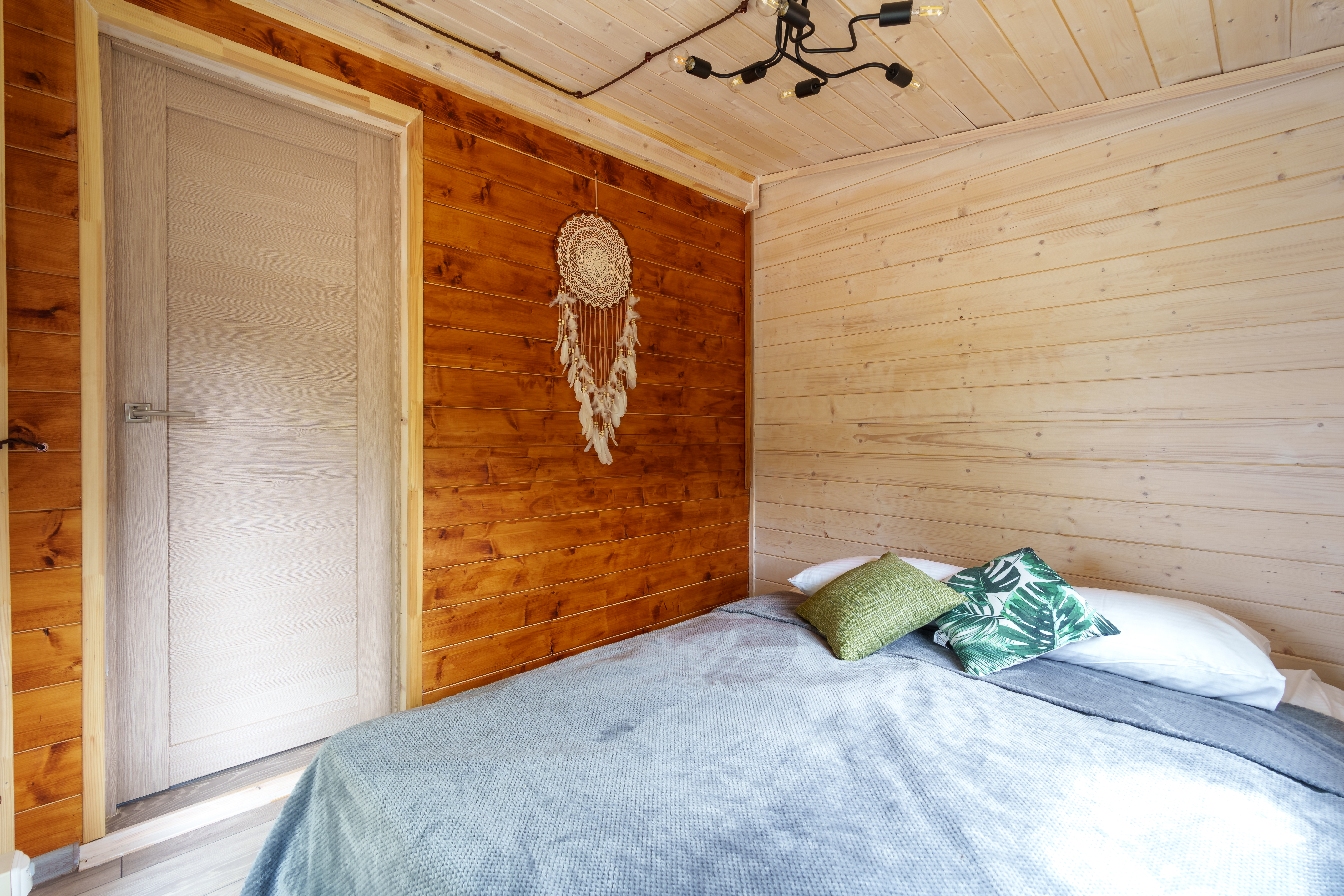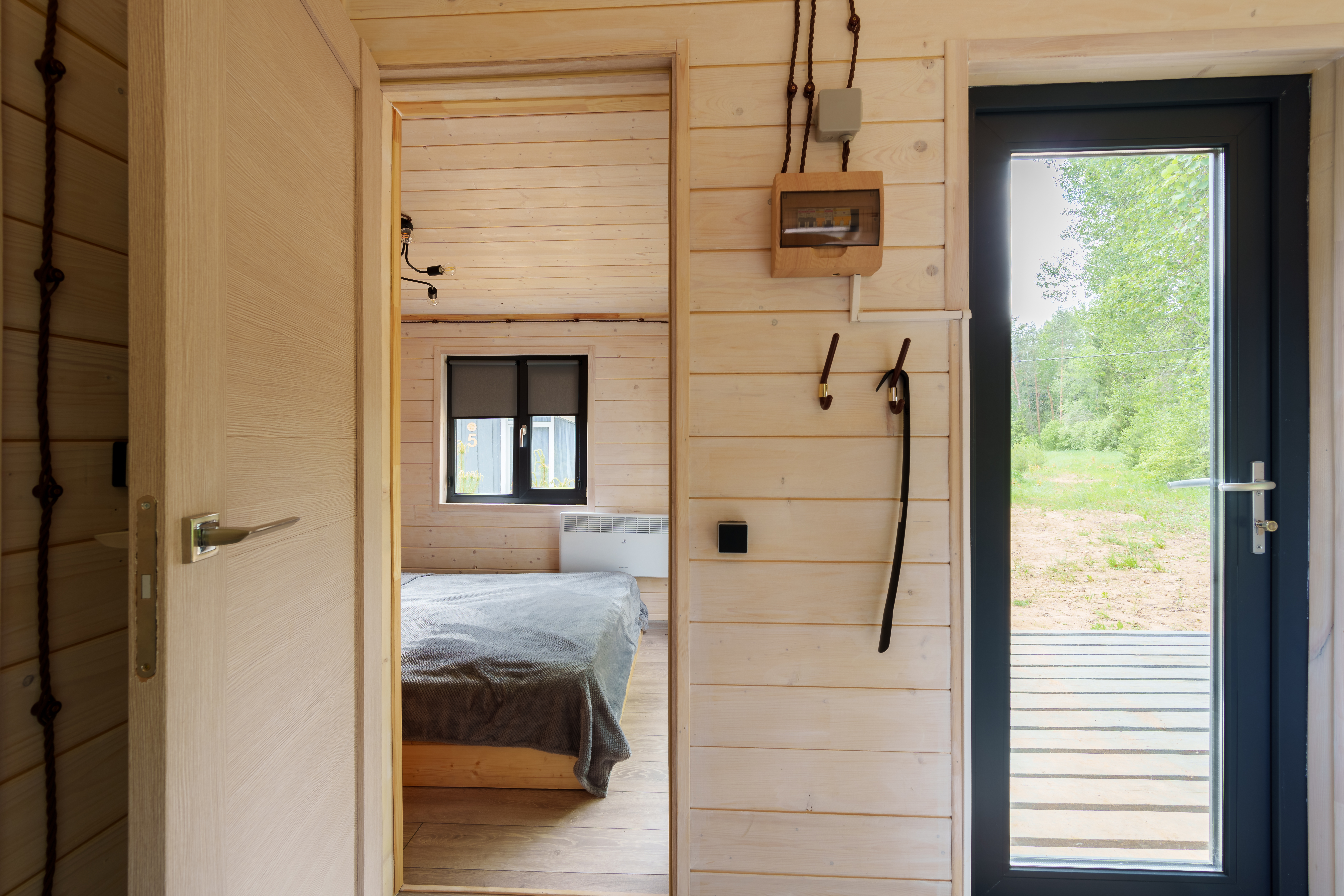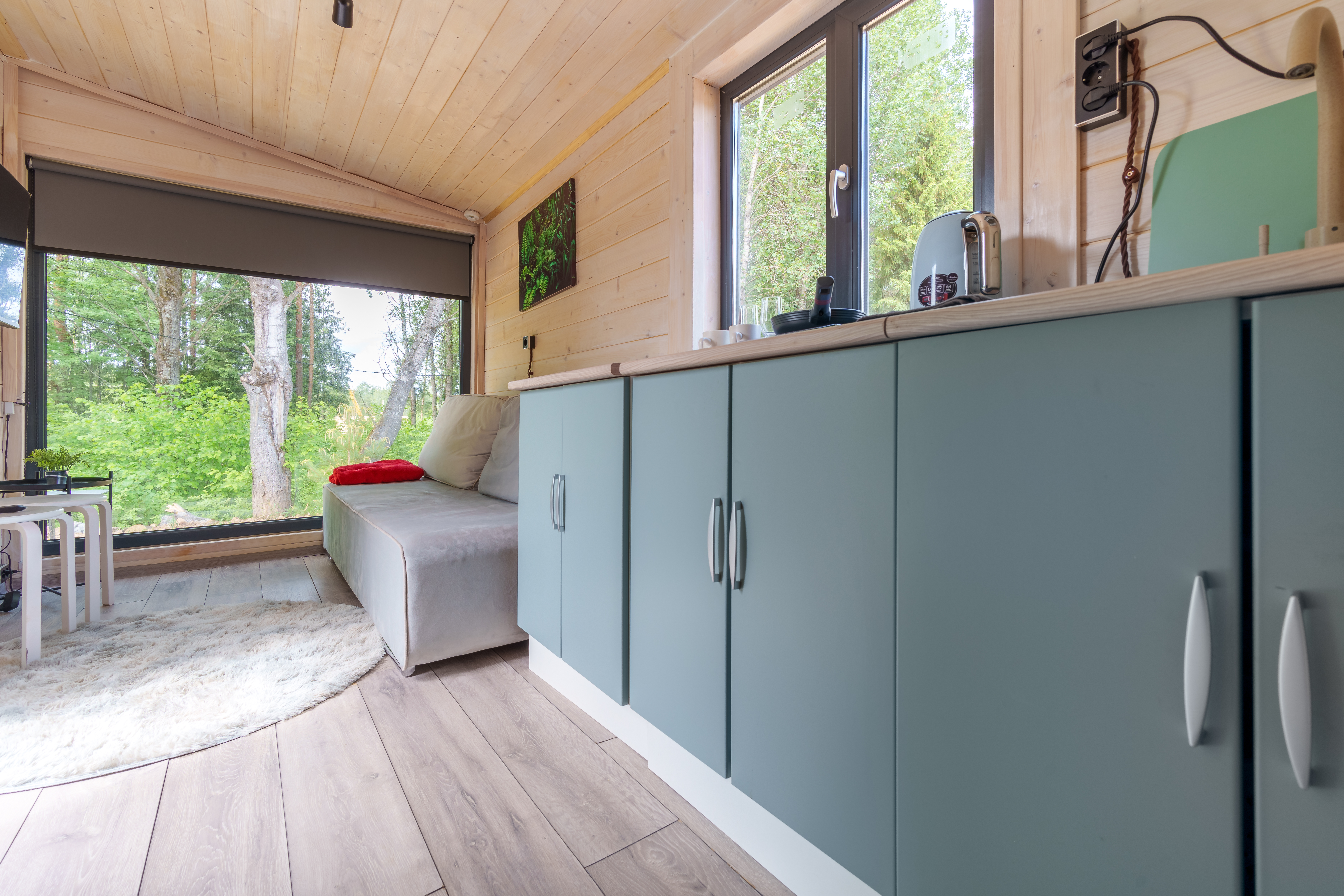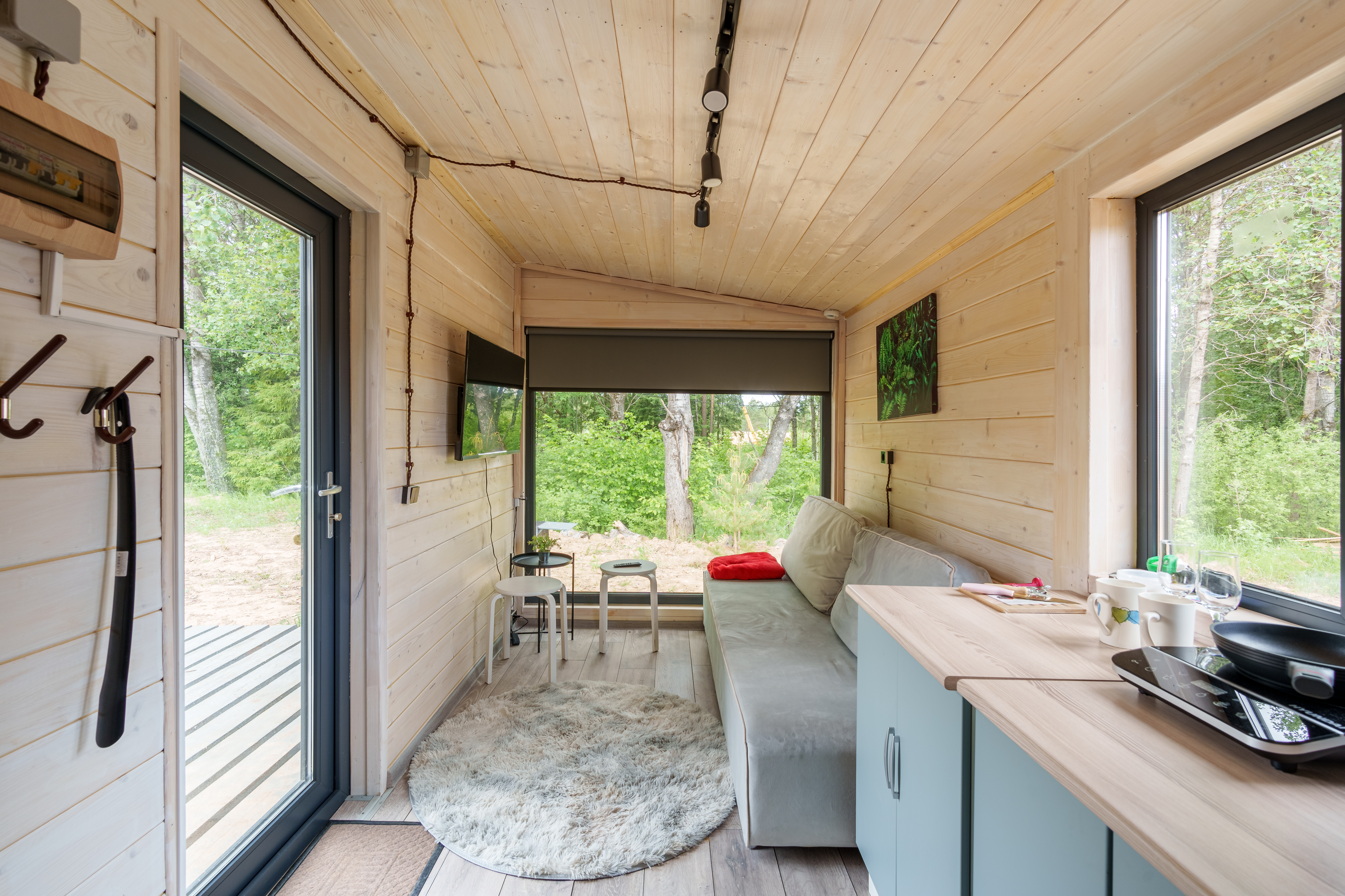 Одноэтажный модуль в стиле эко-минимализм представляет собой небольшую общую зону, ванную комнату, кухню и спальню, которые выдержаны в светлых, приятных оттенках и древесных фактурах.