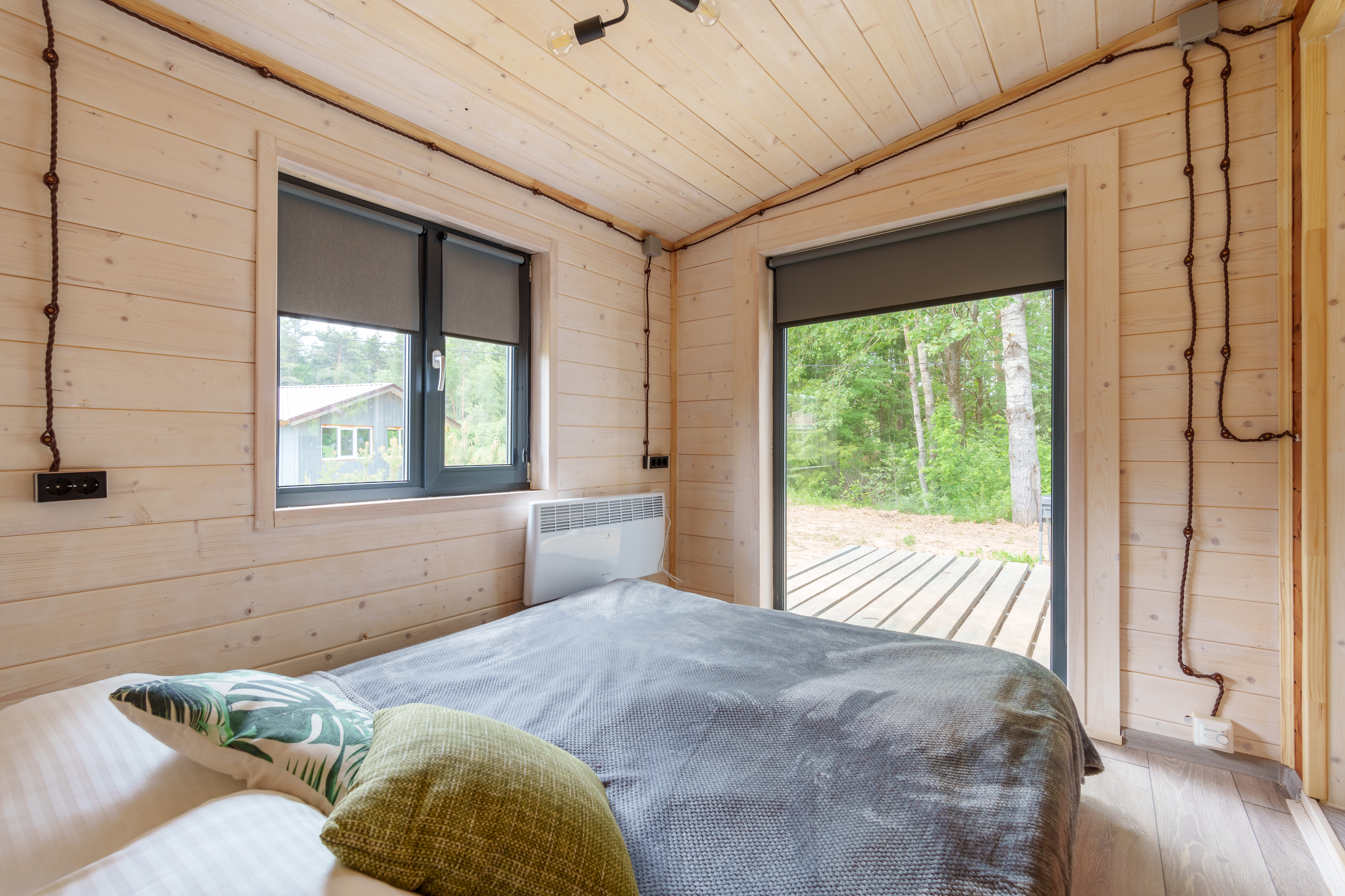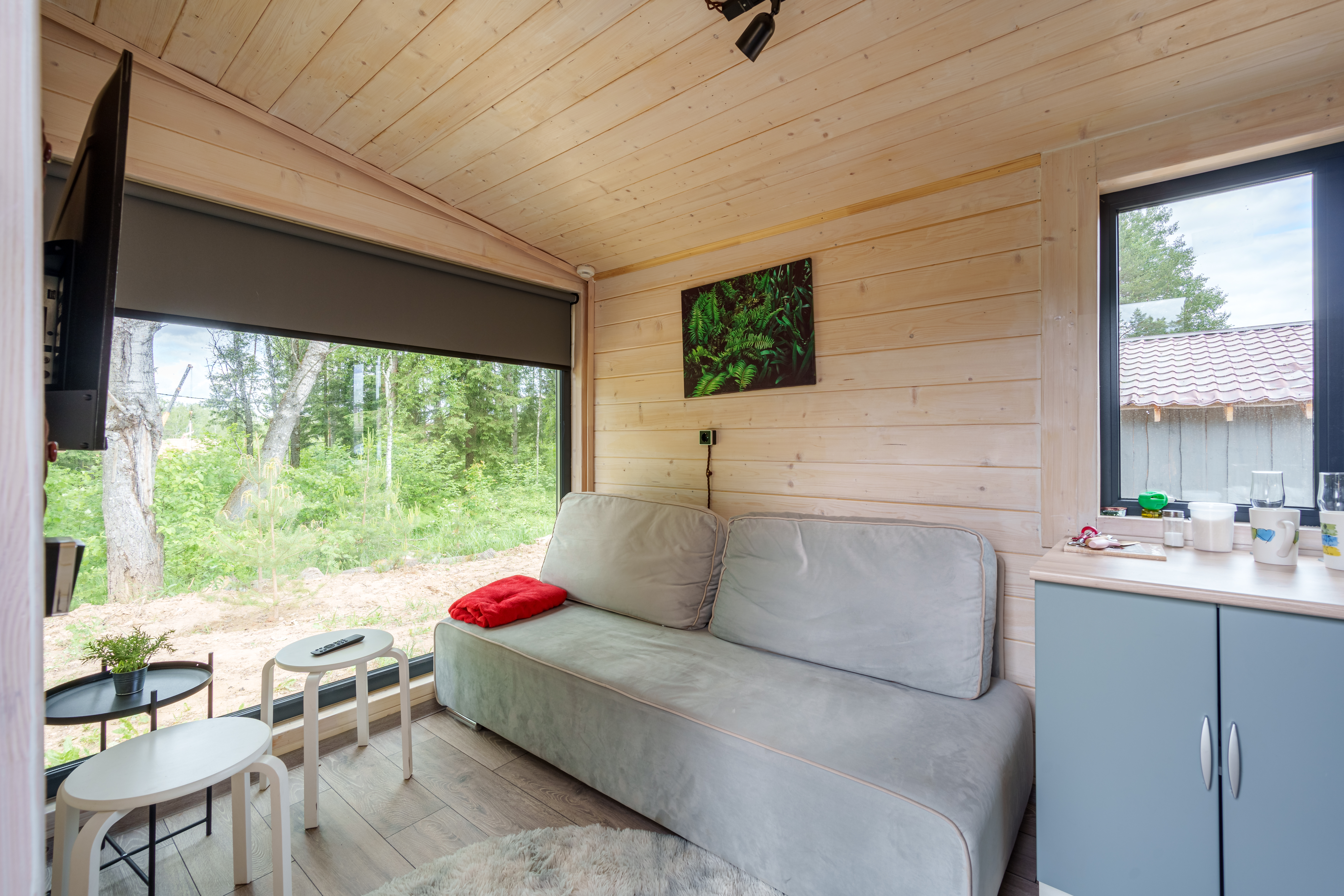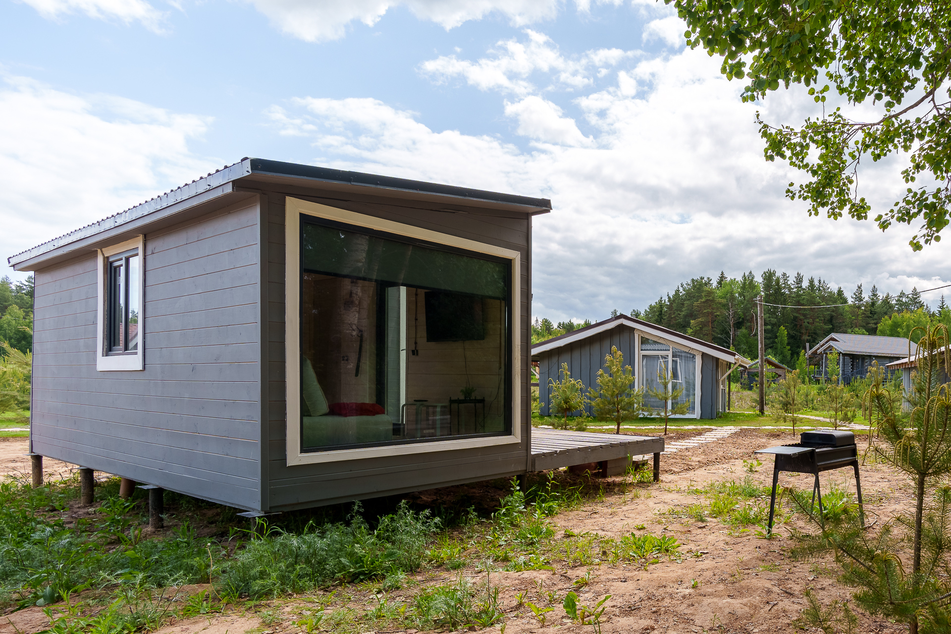 А основное преимущество проживания в модуль-доме, которое никого не оставит равнодушным - панорамная лицевая стена конструкции с видом на озеро.