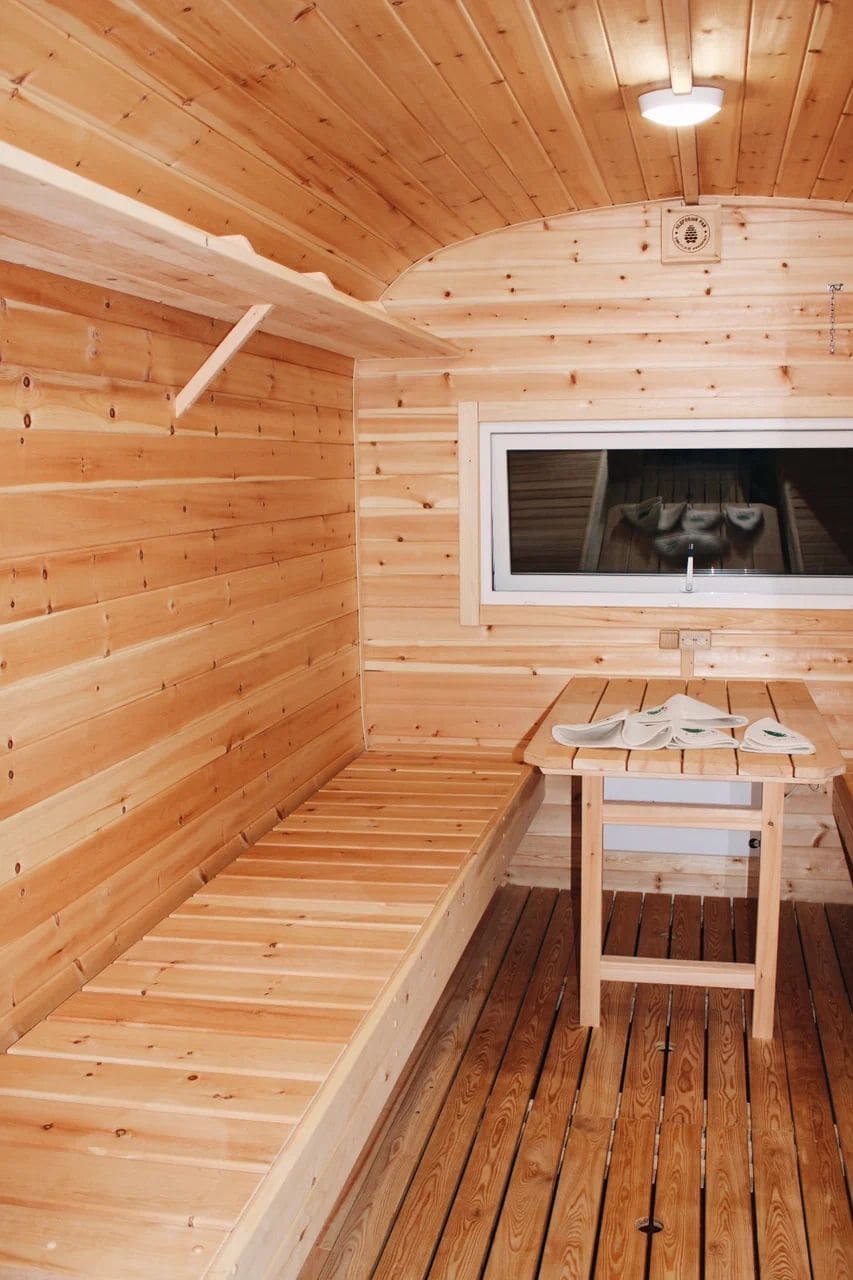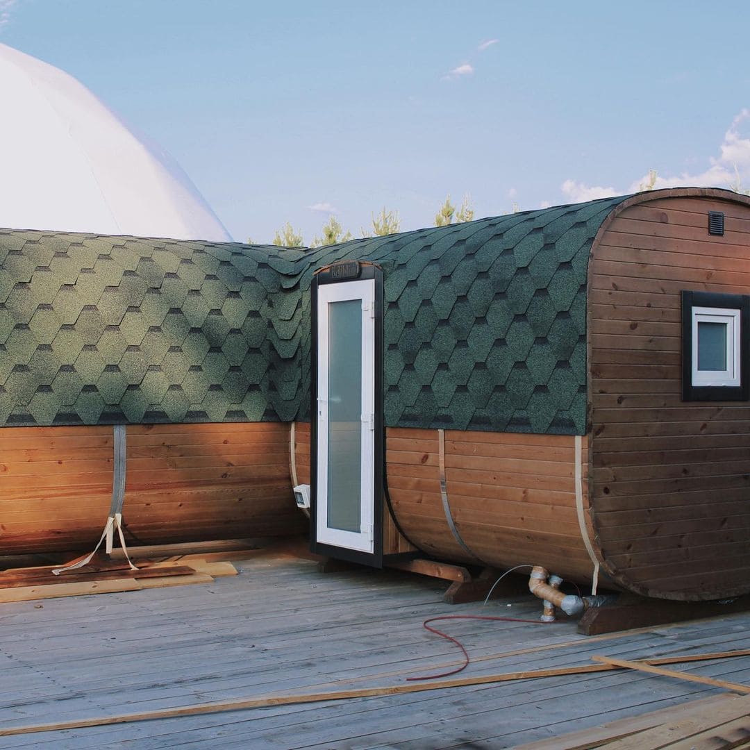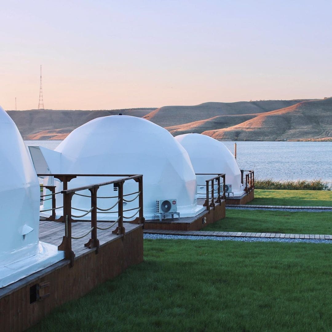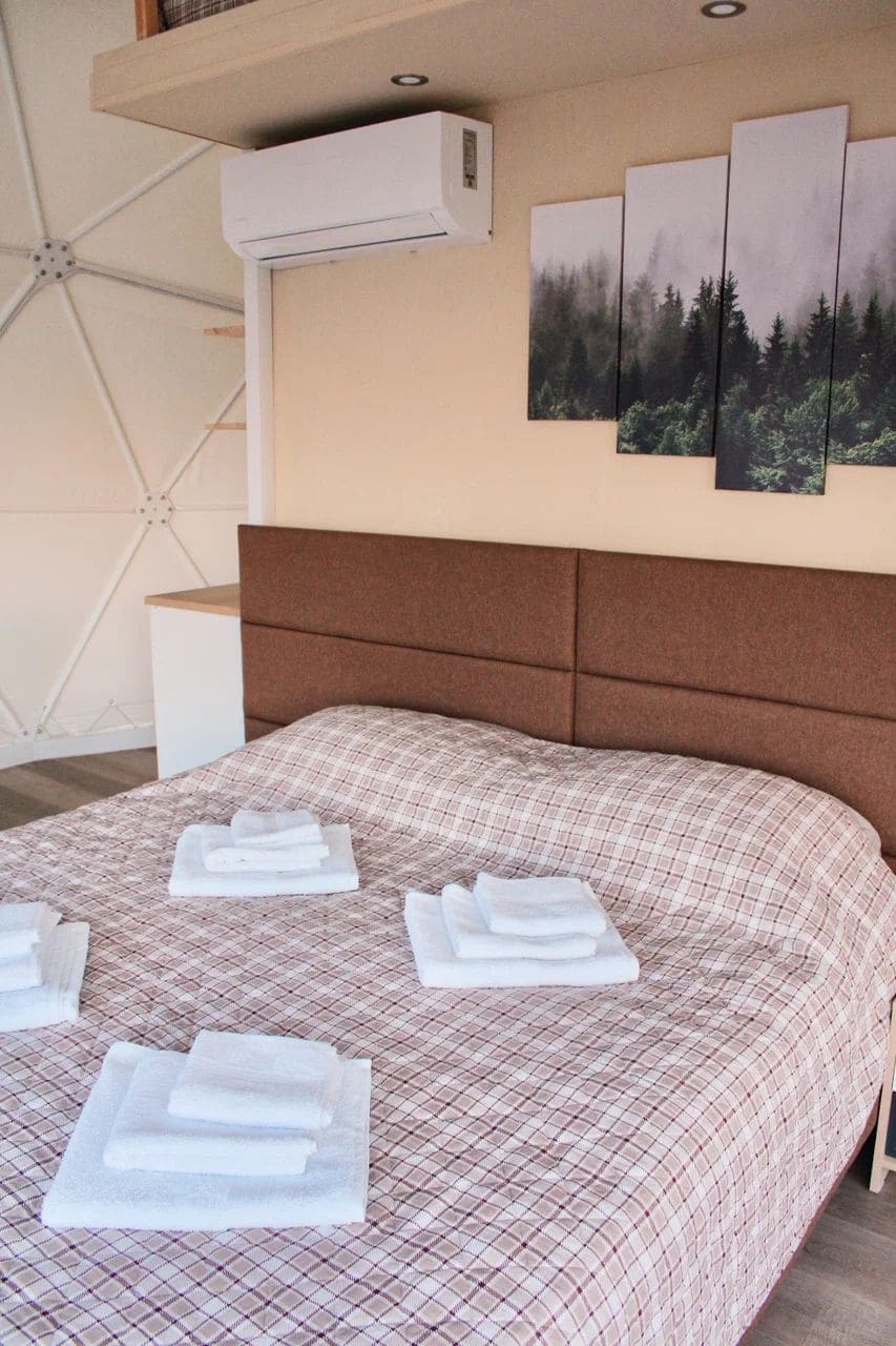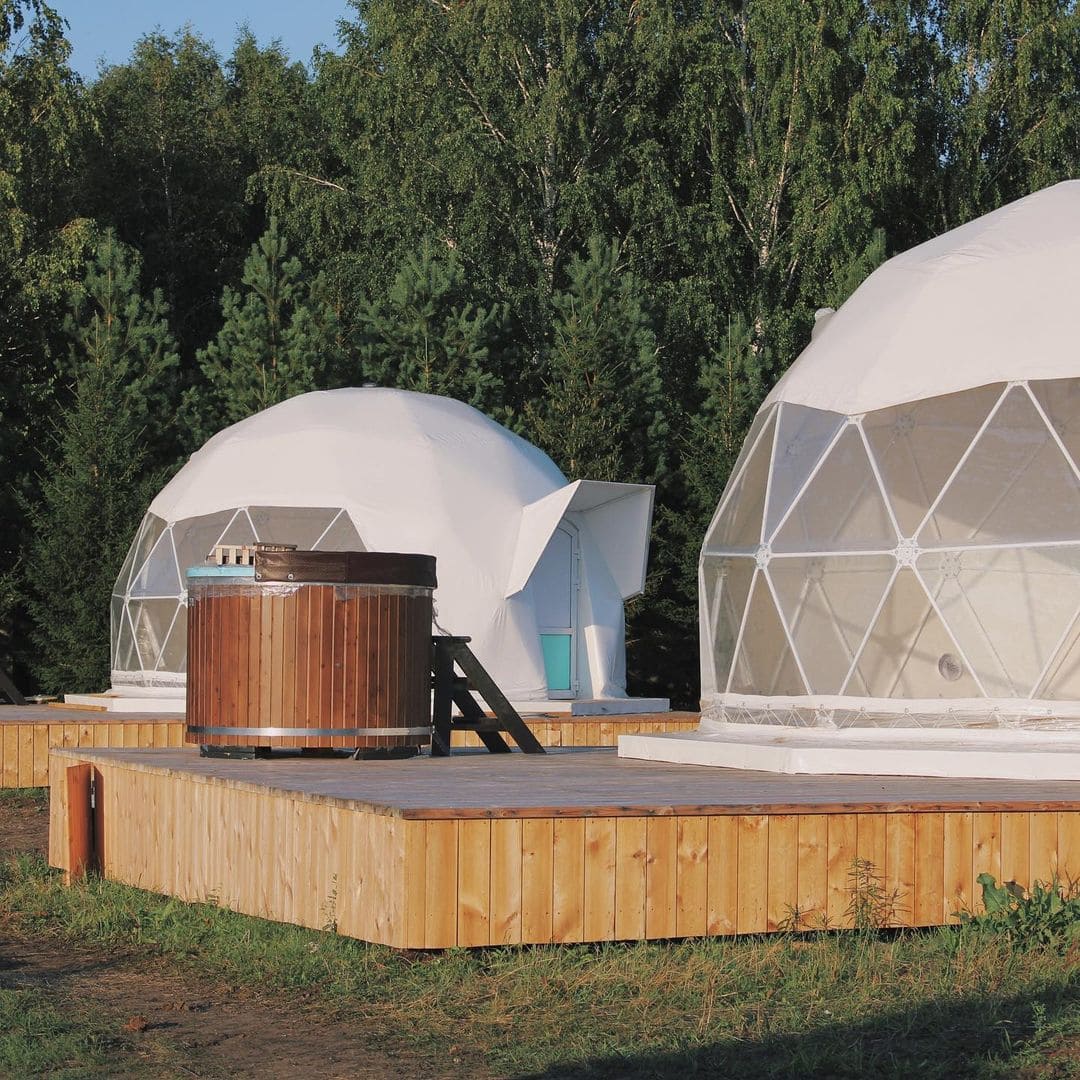 На территории для проживания доступны 12 уютных и стильных купольных домиков с панорамными окнами и даже обустроенный дом на колесах. Любители отдохнуть не только душой, но и телом могут посетить баню и купель из кедра и сосны.