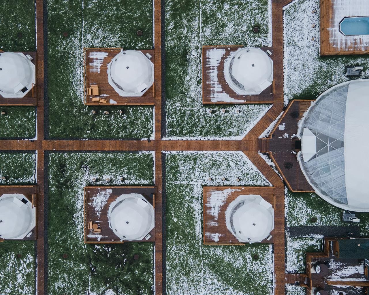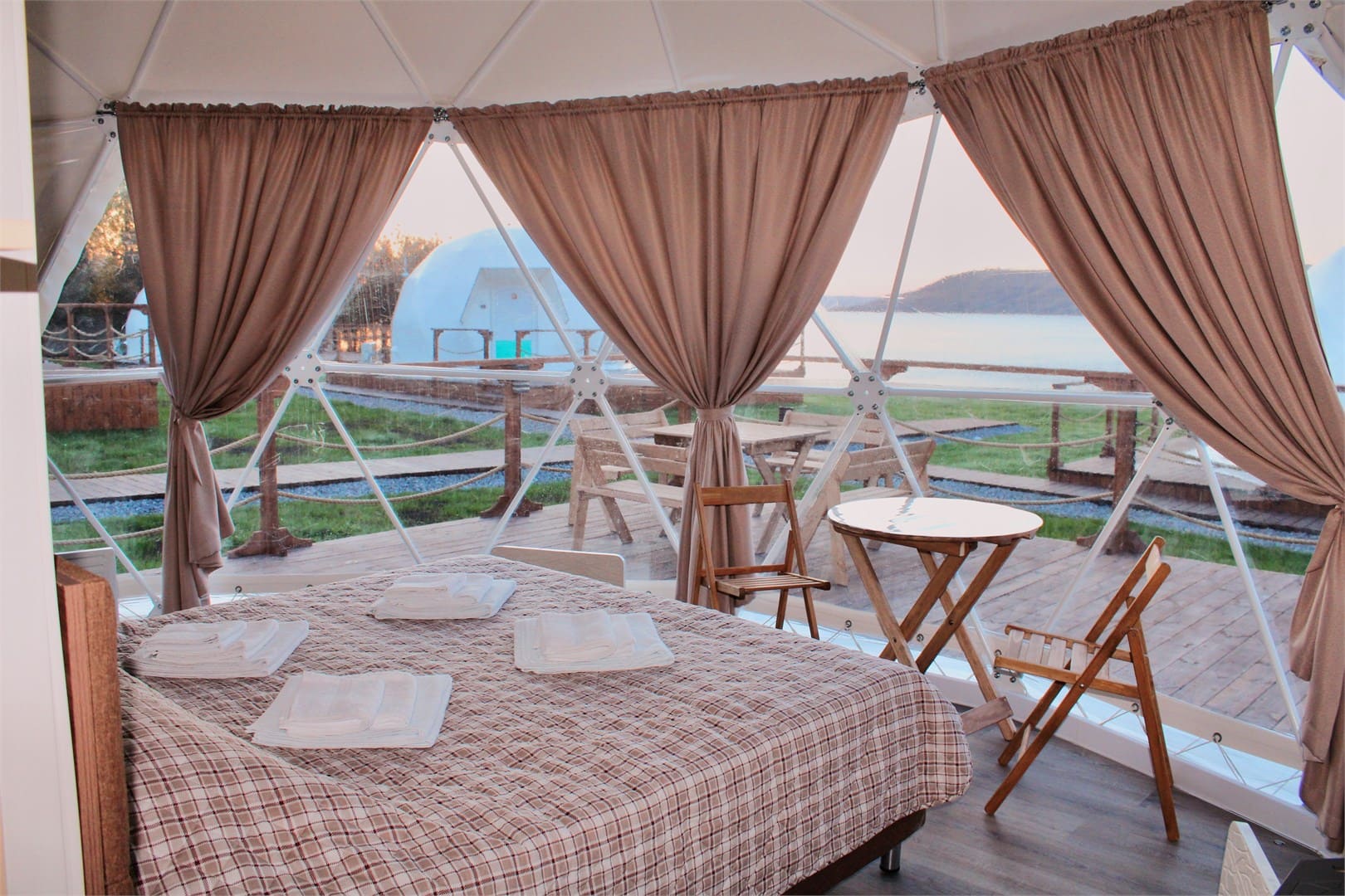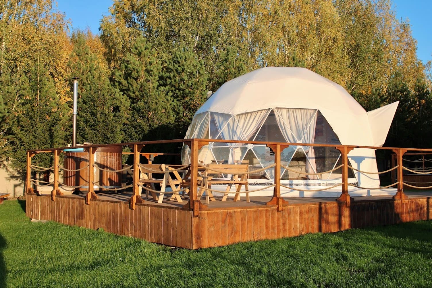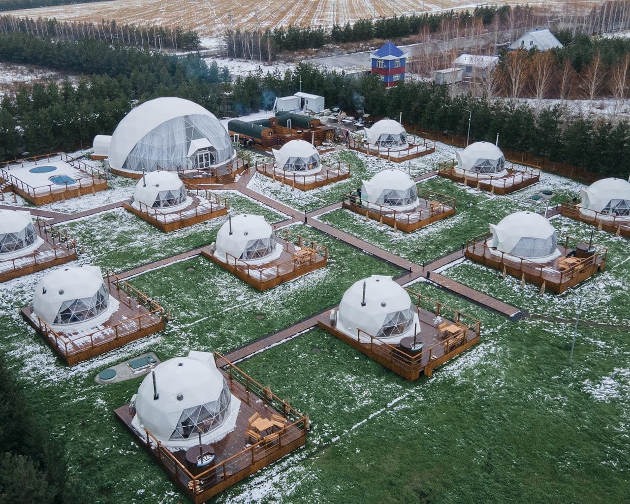 На территории для проживания доступны 12 уютных и стильных купольных домиков с панорамными окнами и даже обустроенный дом на колесах. Любители отдохнуть не только душой, но и телом могут посетить баню и купель из кедра и сосны.