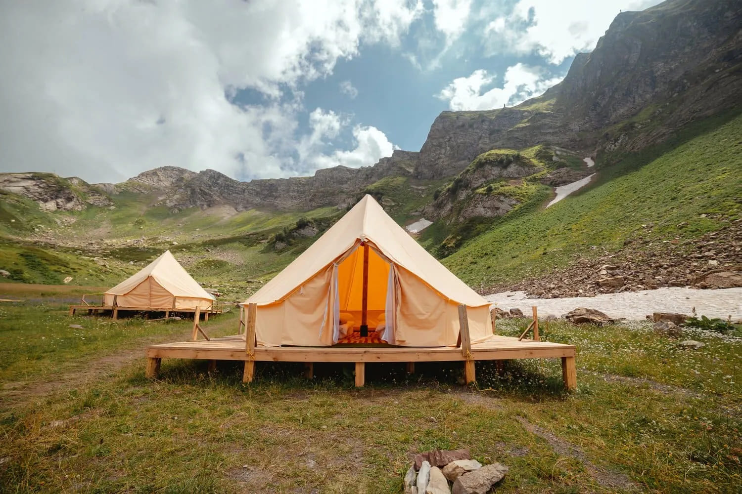 Проживание в палатках глэмпинга позволит окунуться в атмосферу настоящей горной природы, увидеть Кавказские горы в дымке закатов и рассветов, а также отправиться на прогулку по экотропам еще до начала работы канатных дорог.