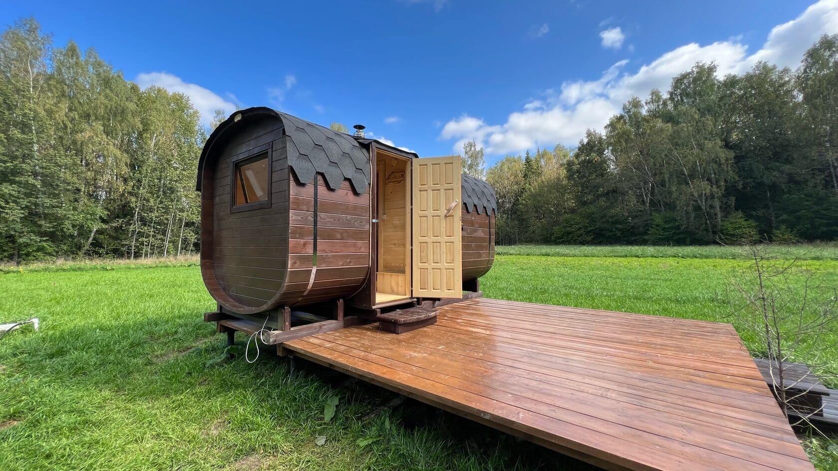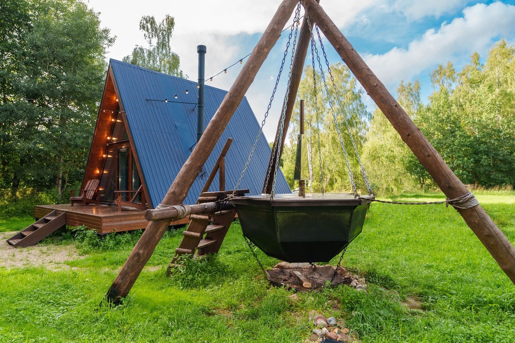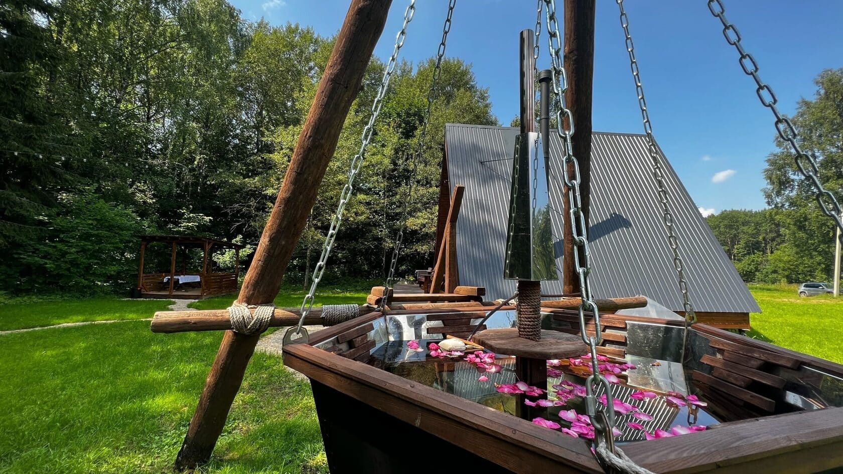 Здесь можно пожарить овощи и мясо на мангале, прогуляться по живописному лесу, поиграть в настольные игры, а так же расслабиться в настоящем сибирском чане с травами под открытым небом при любой погоде.