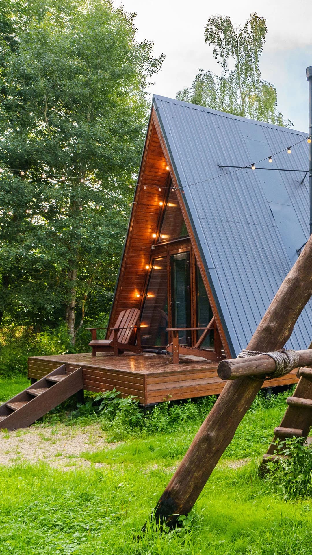 Уютный дом-шалаш с панорамными окнами и широкой террасой даст возможность наслаждаться красотой окружающей природы даже в дождливую погоду или когда не хочется выходить на прогулку. У домика свой естественный забор – густой лес.